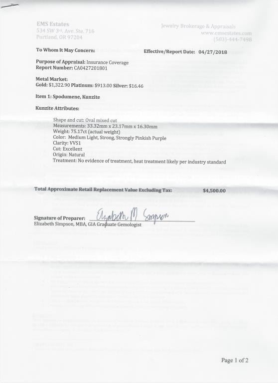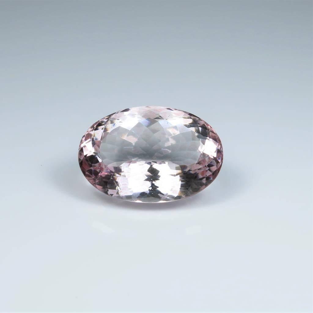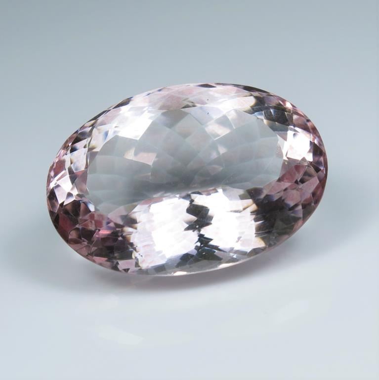 Magnificent Loose 75.17 carat oval cut Pink Kunzite perfectly cut to show the gems true vibrant beauty with Pinkish Purple color and VVSI clarity measuring 33.32 x 23.17 mm in diameter. This Kunzite would make anincredible custom piece of jewelry. Full Appraised Value - $4,500.00 Estimates $2,000-$3,000