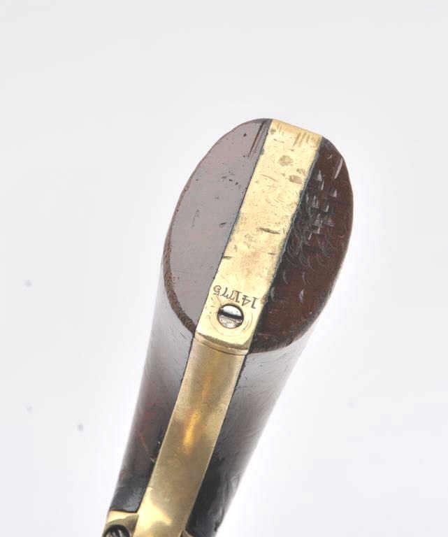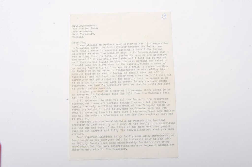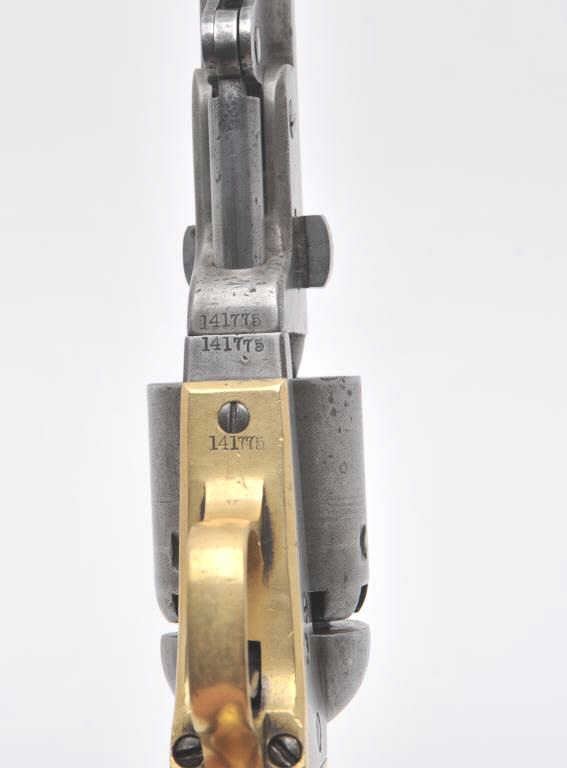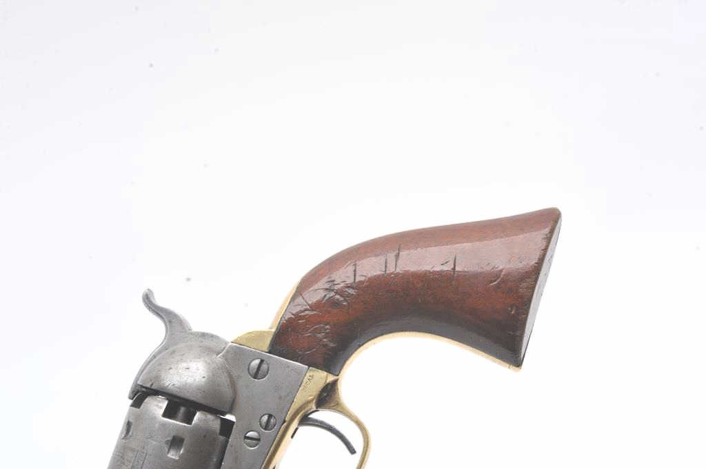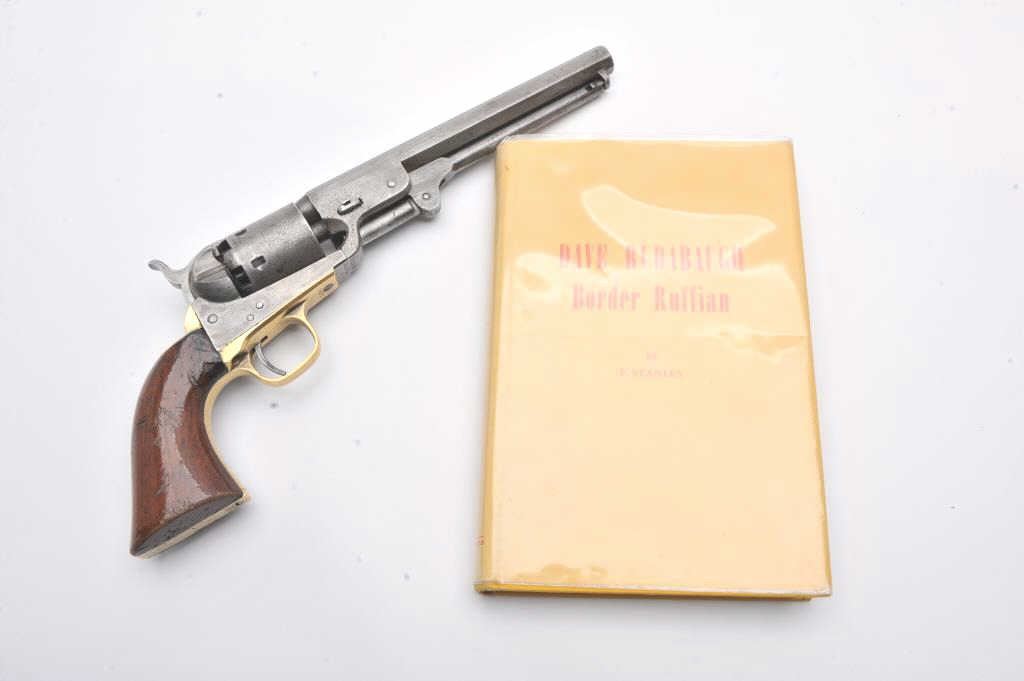 Colt 1851 Navy revolver with history as belonging to “Dangerous Dave Rudabaugh” western outlaw and associate of “Billy the Kid”. This Colt, S/N 141775 is accompanied by a sworn statement recanting that this pistol was obtained by Joseph Thompson from Dave Rudabaugh for $15 dollars and that Thompson ran a gun shop in Mesilla, New Mexico. Joseph recalls other events surrounding a jail break where Rudabaugh obtained the pistol. The document states the revolver was brought to England in 1920 by Thomas Thompson son of Joseph Thompson. The letter is signed by A.D. Thompson of Featherstone, England dated 09/21/1981 selling the aforementioned Colt to noted international antique arms dealer Hans Schemke. A copy of 1981 English advertisement in “Collecting: Leisure newspaper listing “The Colt 1851 Navy revolver used to murder a jailer by Dave Rudabaugh etc.”. Subsequent letters from A. O. Thompson to Ron Sario, noted Colt collector, further enlightens the connection to Thompson and the Rudabaugh navy. A large research binder full of information regarding Dave Rudabaugh and his relationship to “Billy the Kid: and his gang is included. In conclusion Little Johns sold this Colt in 1981 to Ron Sario for Han Shemke who had consigned us this revolver. We were well acquainted with Hans Schemke and we verified the document and existence of Mr. Thompson and his relationship to Mesilla, New Mexico. Mr. Sario further increased the documentation as A.D. Thompson was pleased the pistol “Had a good home” and states he would have never sold the pistol except for falling on hard times. Mr. Thompson writes 8 pages of text regarding his family, the families travel to America and the opening of a gun shop in San Antonio Texas were they closed up and moved to Mesilla about 1877-78. Along with a great deal of other information on “The Kid” and New Mexico that was passed down in the Thompson family. We believe in the “Story” and historic events surrounding this Colt. Though not absolute it is well documented. (Antique) Est.: $12000-24000