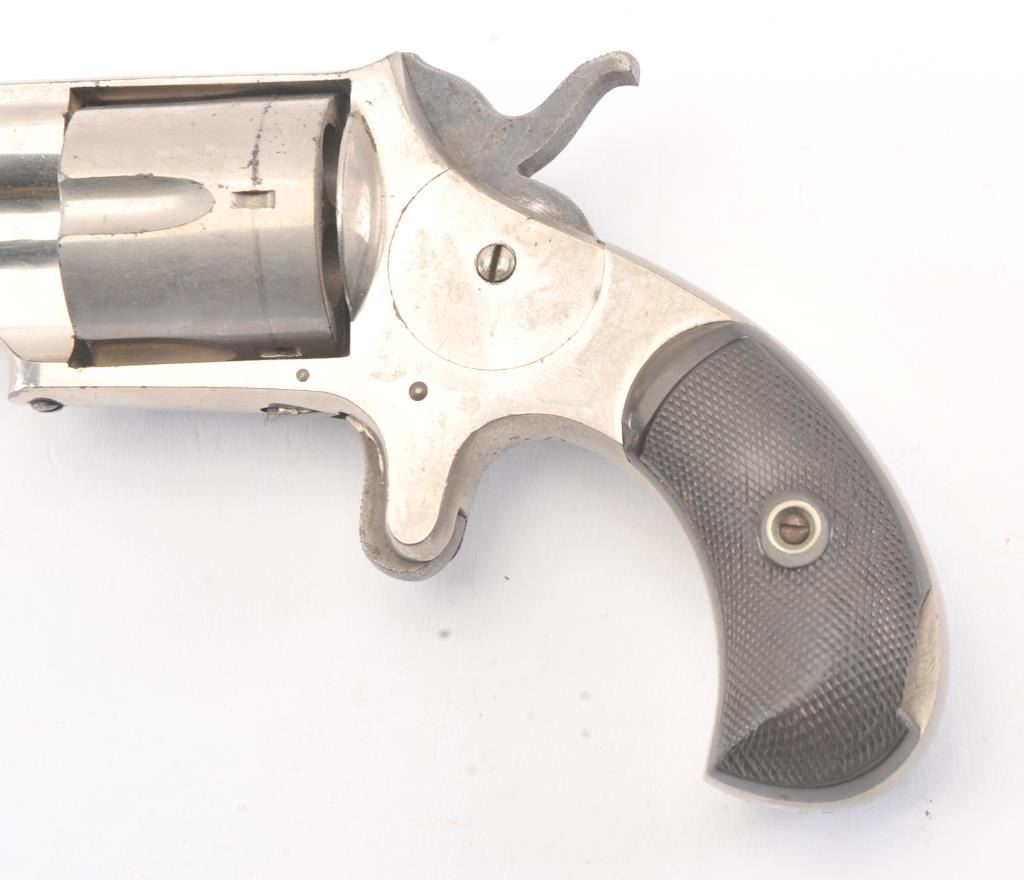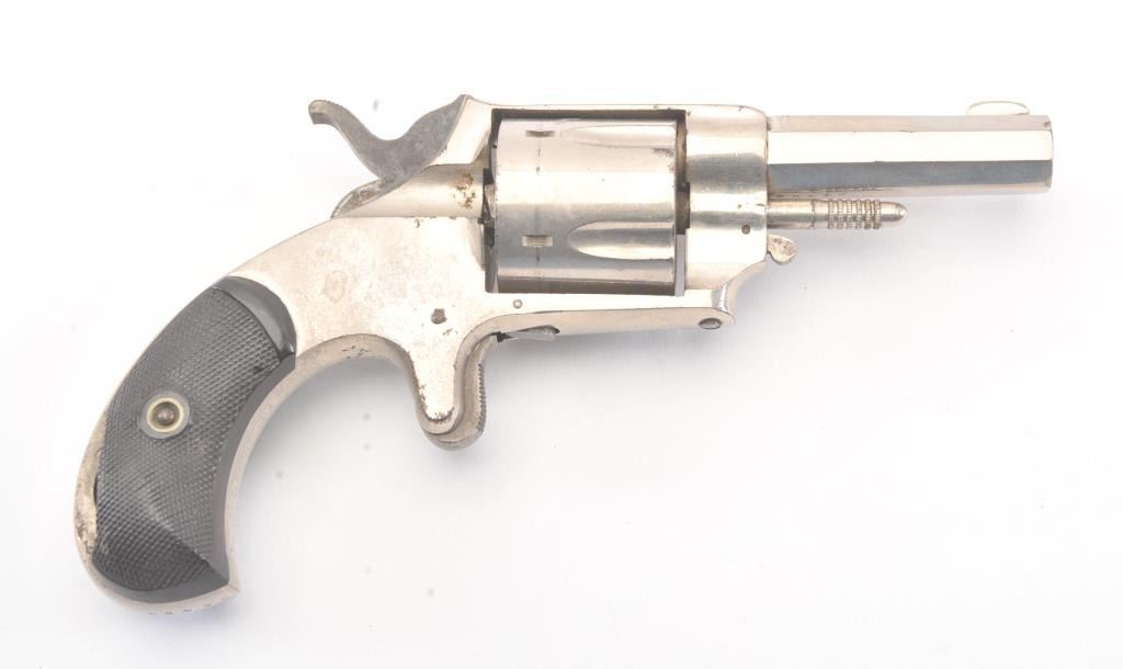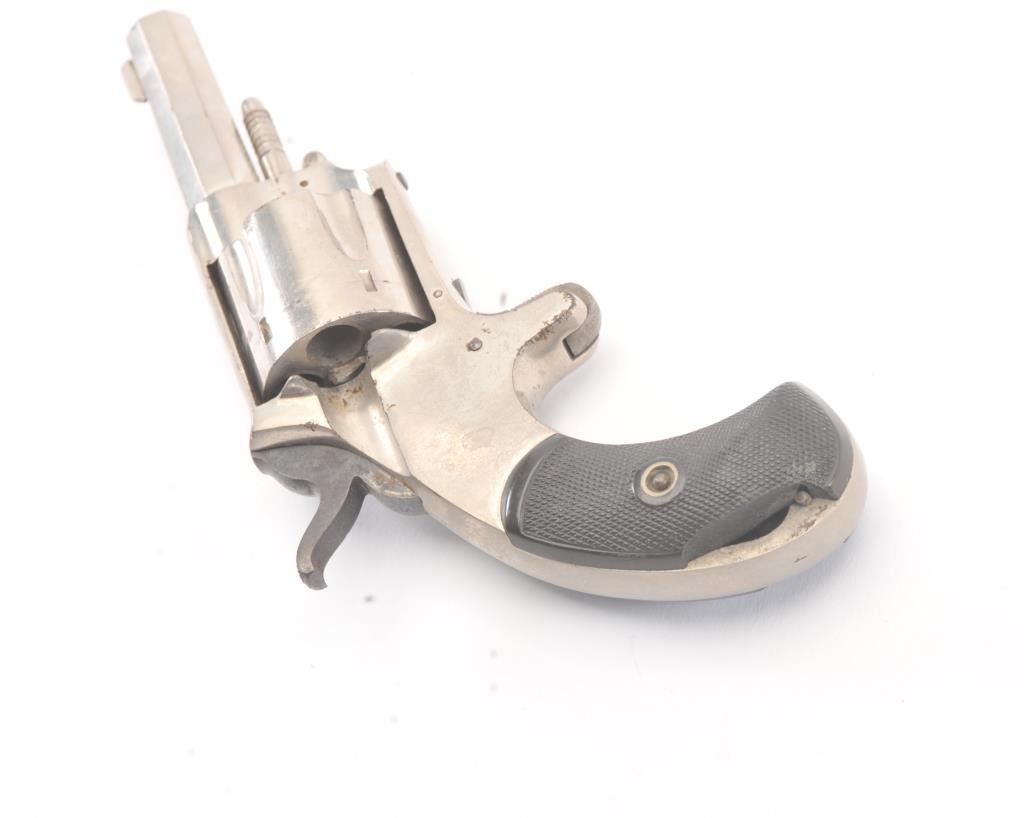 Forehand and Wadsworth .38 caliber rim-fire caliber bull dog marked revolver with last patent date of 1875. 80%-90% original uncleaned nickel. The left grip is badly chipped with piece missing. The actionrevolves are the cylinder but main spring is broken or missing. Would restore nicely. (Antique) Est.: $150-$300