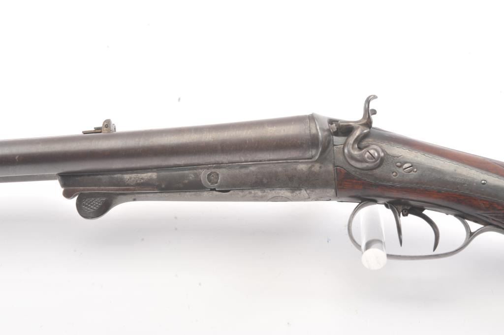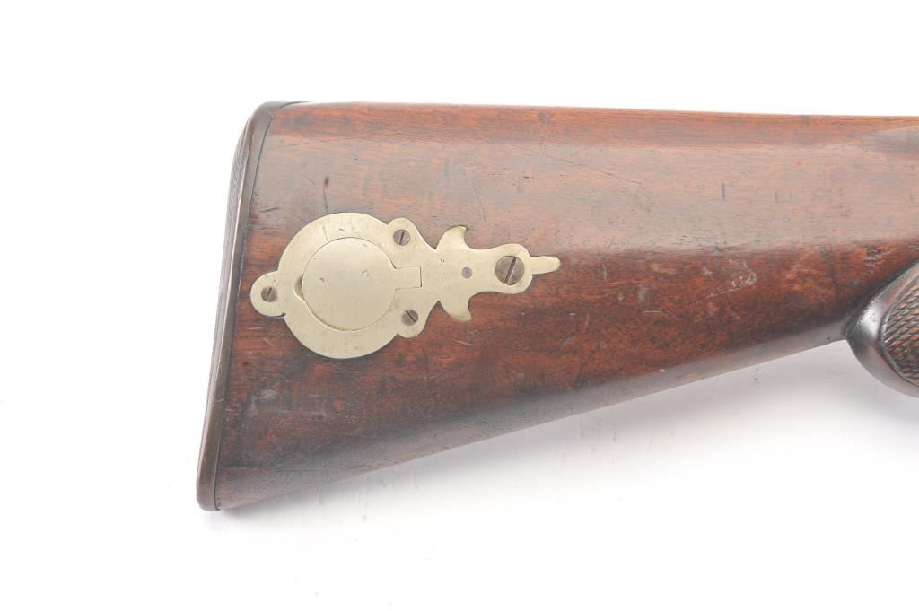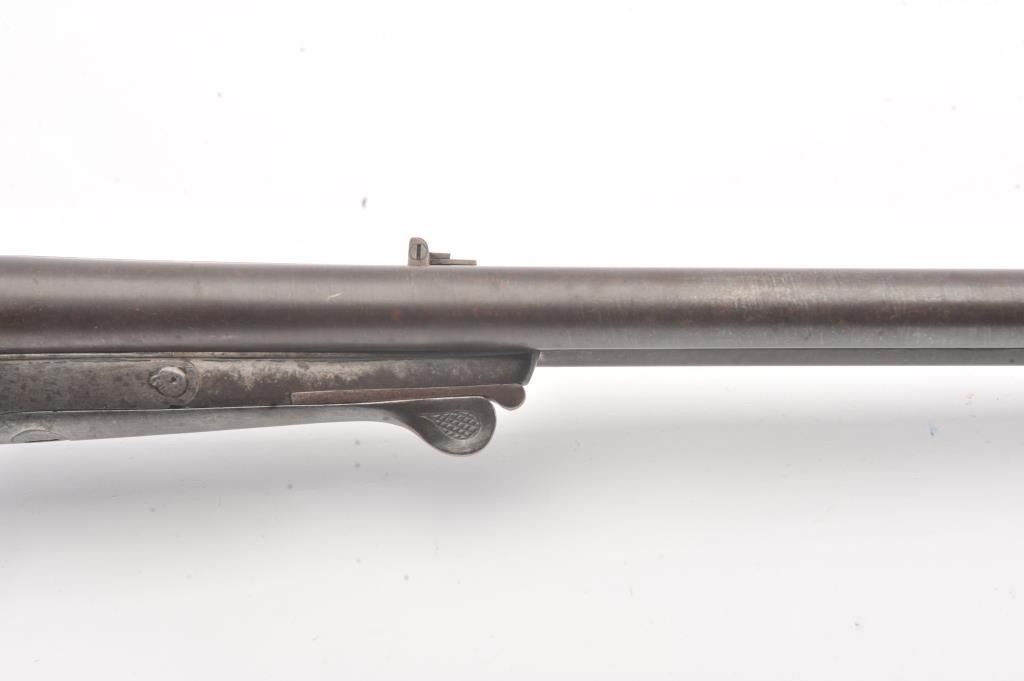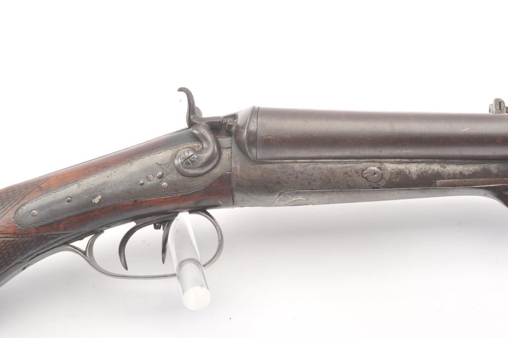 “W. Richards” marked cape gun or combo rifle shotgun with barrel marked “London” and silver inlays of star and arrow at the rear of the rib. Under lever release with set trigger also marked fine laminated steel.German silver disk type patch box in the buttstock. 2 leaf folding rear sight and blade front sight. W. Richards infringed on the reputation of Westley Richards of London but this gun is Belgian made and spuriouslymarked to be sold on foreign rural markets. Approximately 16 GA choked cylinder and approximately 10.11mm rifled barrel (Similar to .38-55 Win). A dent has been removed from right front of shotgun barrel. Fair to goodoverall used condition with patina finish. Sound mechanically and good lock up. Blackpowder era circa 1880s-90s. Favorite of German pioneers to South Africa. (Antique) Est.: $500-$1000