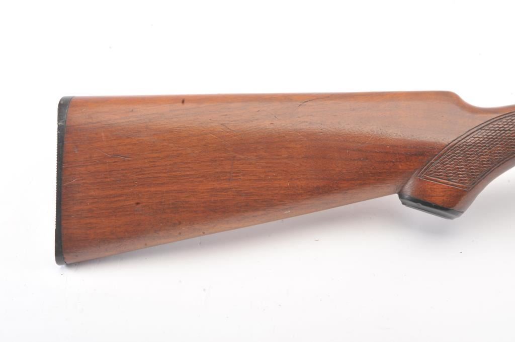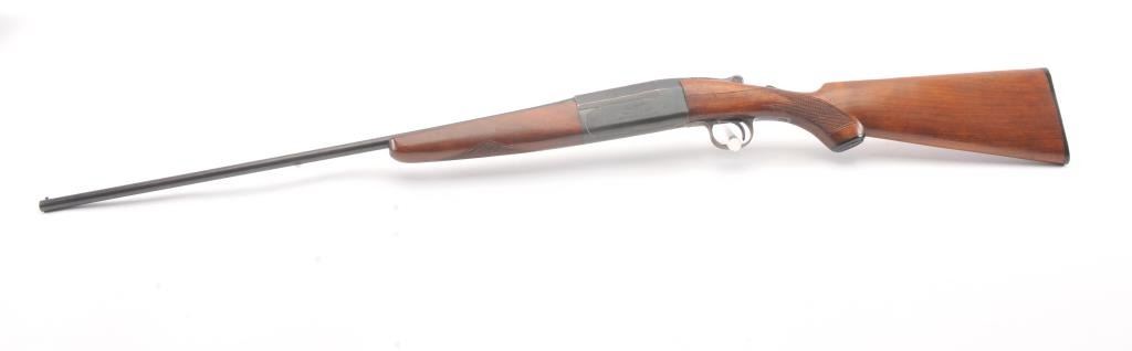 Vintage Pre-War LeFever 410 GA Single Shot Shotgun with 26” barrel choked full, S/N 4849. Factory dimensions with original butt plate (Unmarked odd grooves). 75%-85% originally toning blue. The wood stock wouldbe very good but the buttstock has been damaged from dropping and hitting the rear of the frame. Cracks at compressions and area over trigger guard. Auto ejector. Good bore. 70%-80% original blue/brown on the barrel and frame. (C&R) Est.: $400-$800