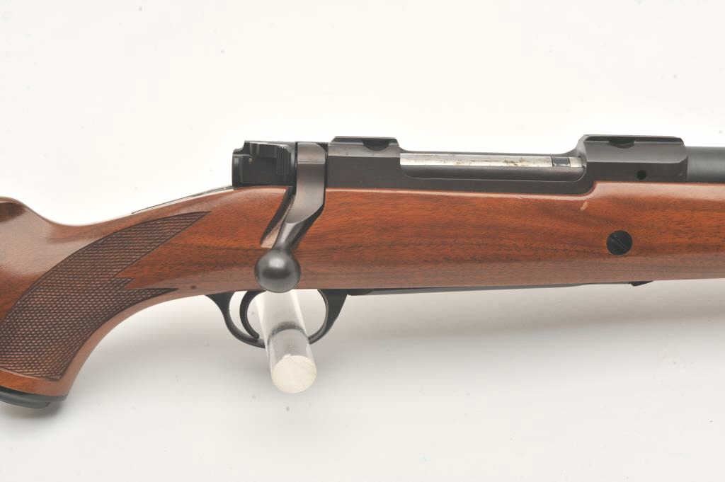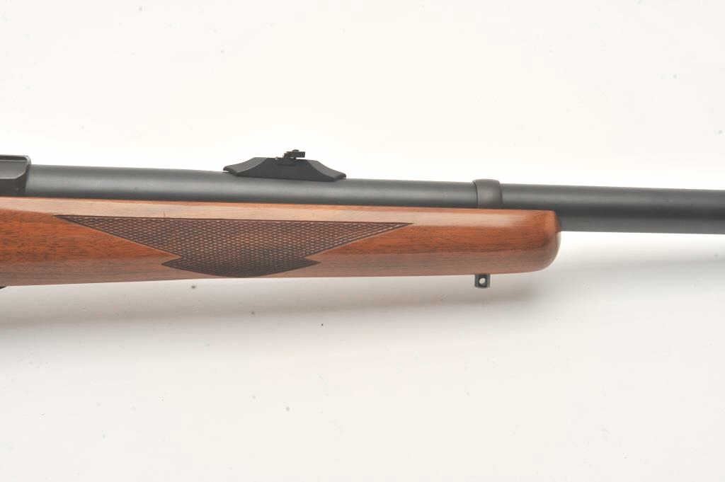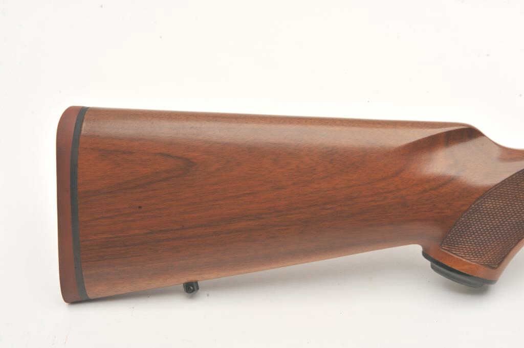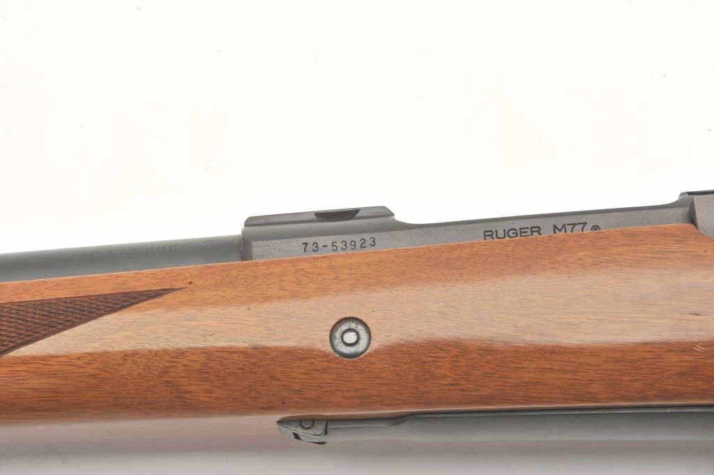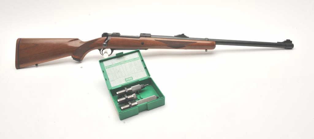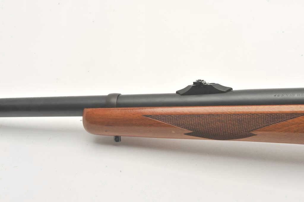 Custom Ruger M77 bolt action rifle, .460 Van Horn caliber, Serial #73-53923. The rifle is in fine overall condition with a 24” barrel with a barrel banded front and folding rear sights. The metal surfaces retain nearly all of their matte blue finish with light surface rust around the front sight. The checkered wood stock is in very good condition and ends with a solid red rubber recoil pad providing a 13 ¾” LOP. The boreis good, the action crisp and markings are sharp on this custom big bore. The .460 Van Horn cartridge is based on a shortened .460 Weatherby case. The lot includes custom RCBS reloading dies. Est.: $2000-4000(Modern).