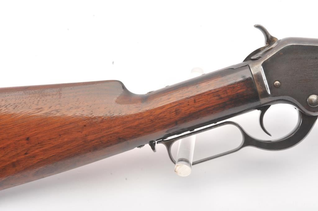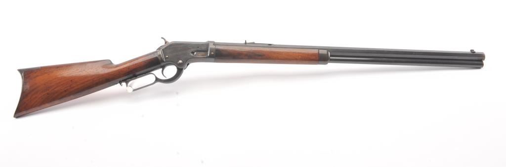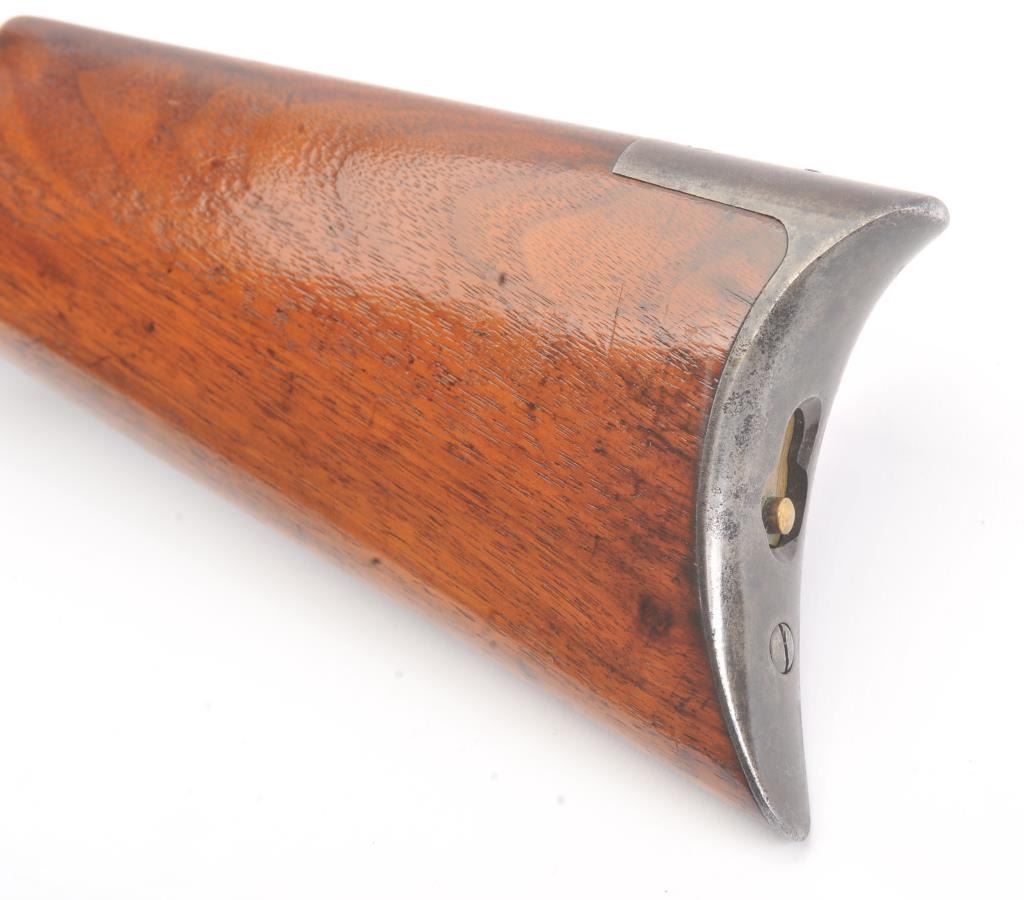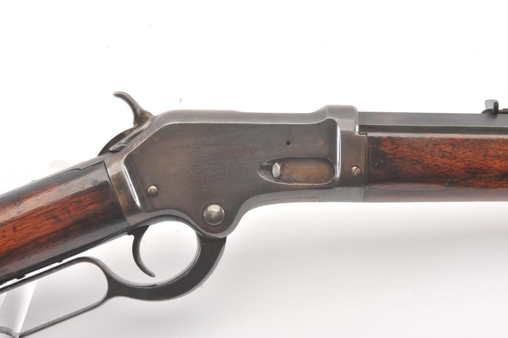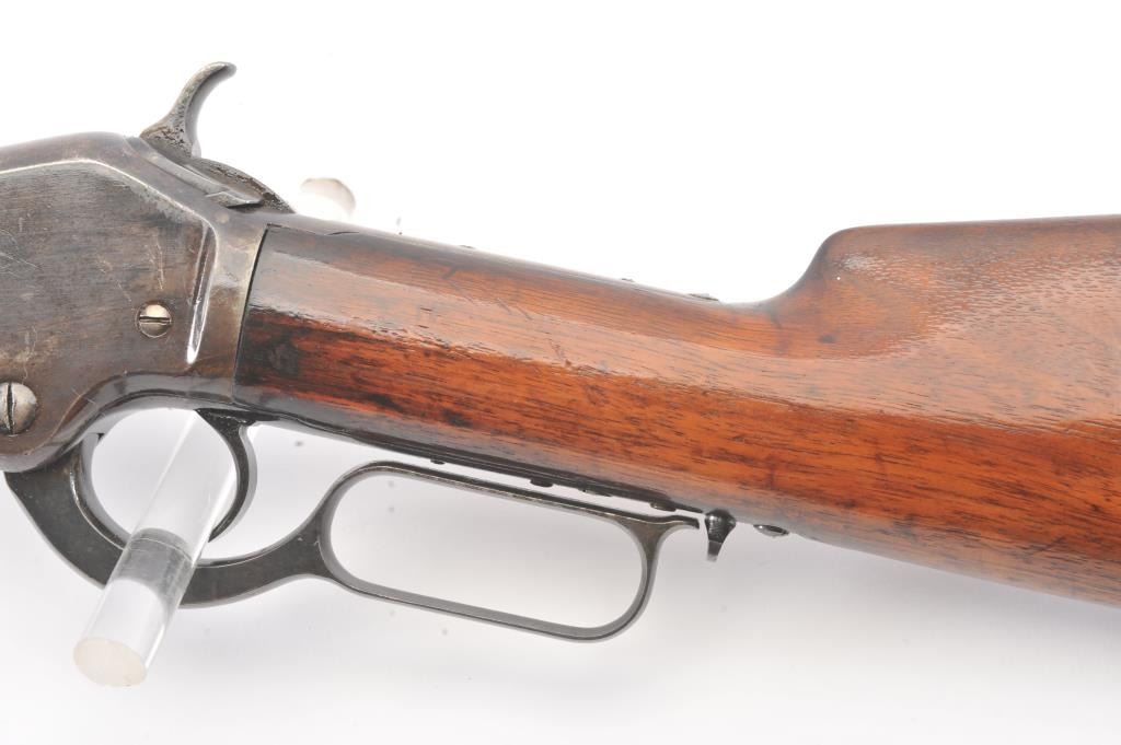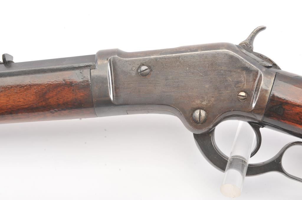 Colt Burgess .44-40 caliber octagon barrel lever action rifle, S/N 4128. Good to very good condition with sharp edges and good address. Rampant Colt is 80% visible on the frame. Considerable original finish under aclear lacquer coating which covers the entire rifle. The wood is good to very good but also coated with lacquer. Good action and very good bore. We estimate at least 30%-50% blue on the barrel and tube with some finishon the frame. Carefully stripping would improve this Burgess and old collectors often lacquered their guns in the 50s-60s to protect them. (Antique) Est.: $2500-$5000