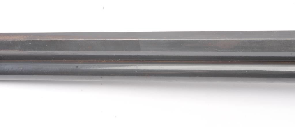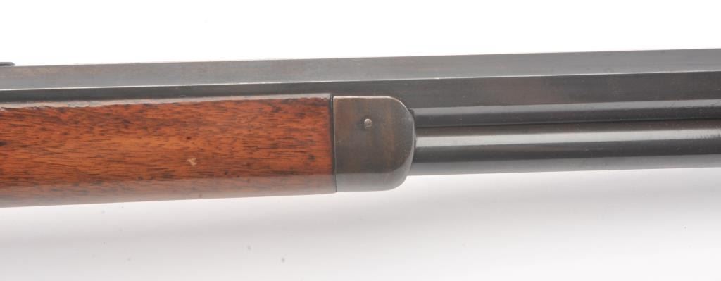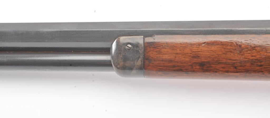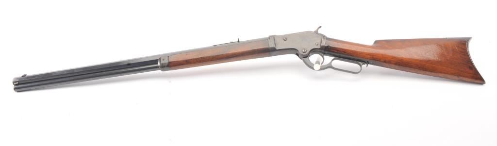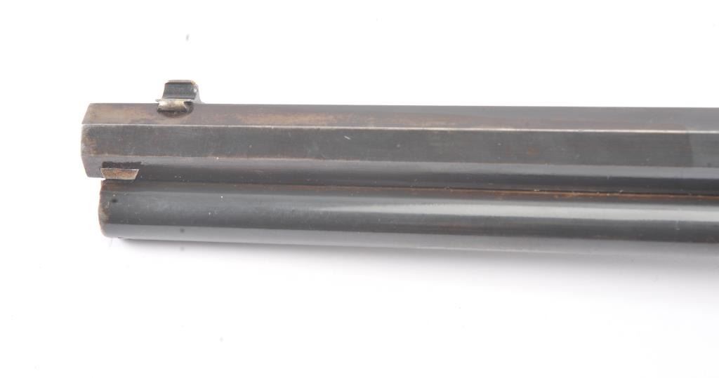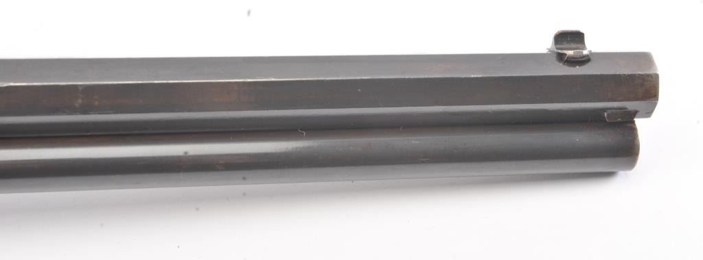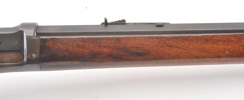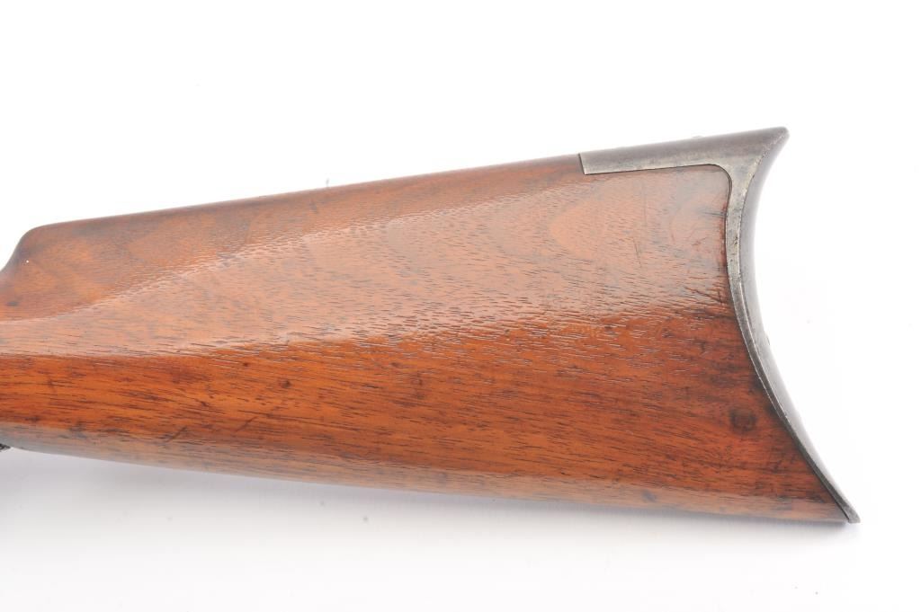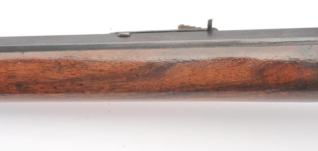 Colt Burgess .44-40 caliber octagon barrel lever action rifle, S/N 4128. Good to very good condition with sharp edges and good address. Rampant Colt is 80% visible on the frame. Considerable original finish under aclear lacquer coating which covers the entire rifle. The wood is good to very good but also coated with lacquer. Good action and very good bore. We estimate at least 30%-50% blue on the barrel and tube with some finishon the frame. Carefully stripping would improve this Burgess and old collectors often lacquered their guns in the 50s-60s to protect them. (Antique) Est.: $2500-$5000