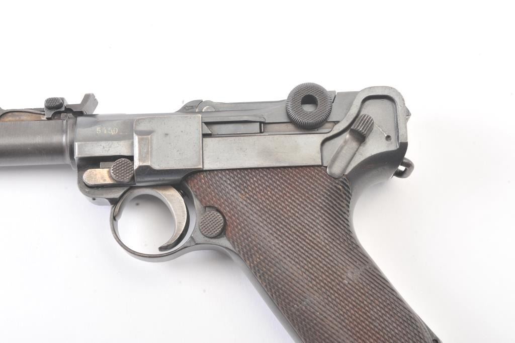 1918 Dated Artillery Luger by DWM, 9mm, Serial #5450. The pistol retains 80-90% original dulling military blue finish with some light erosion just starting. The grips are good with minor dents and scratching.The unmarked wood bottom magazine is mismatched with a “Germany” Post War export stamp. The bore is excellent on this Luger, probably assembled and sold commercially after the First World War Est.: $1500-3000