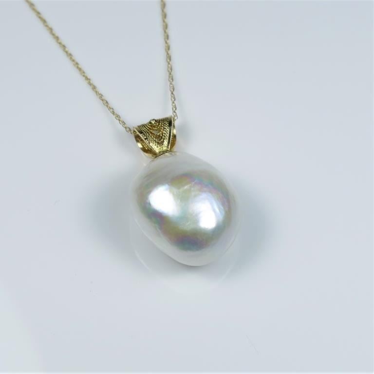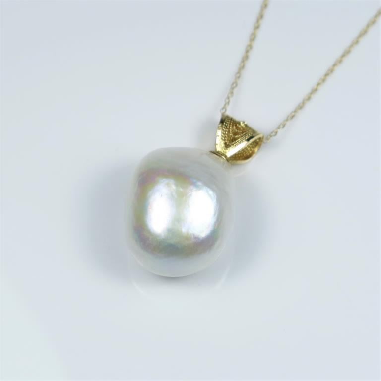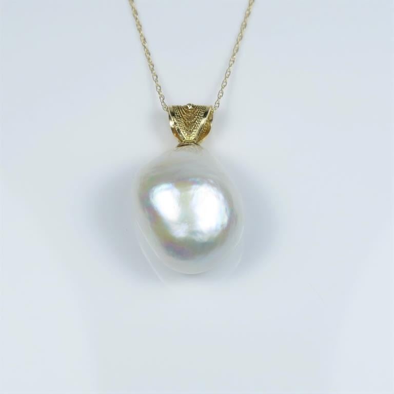 Incredible Baroque South Sea Pearl Pendant huge Pearl measuring 15 x 20 MM with fascinating natural form and subtle multi-color luster with 14 karat yellow bail. Estimates $2,000-$3,000