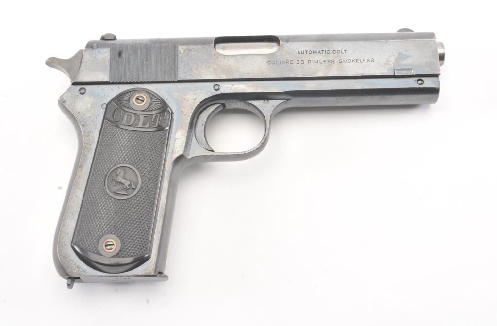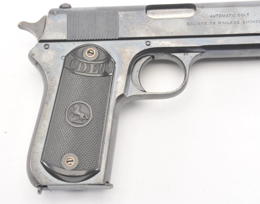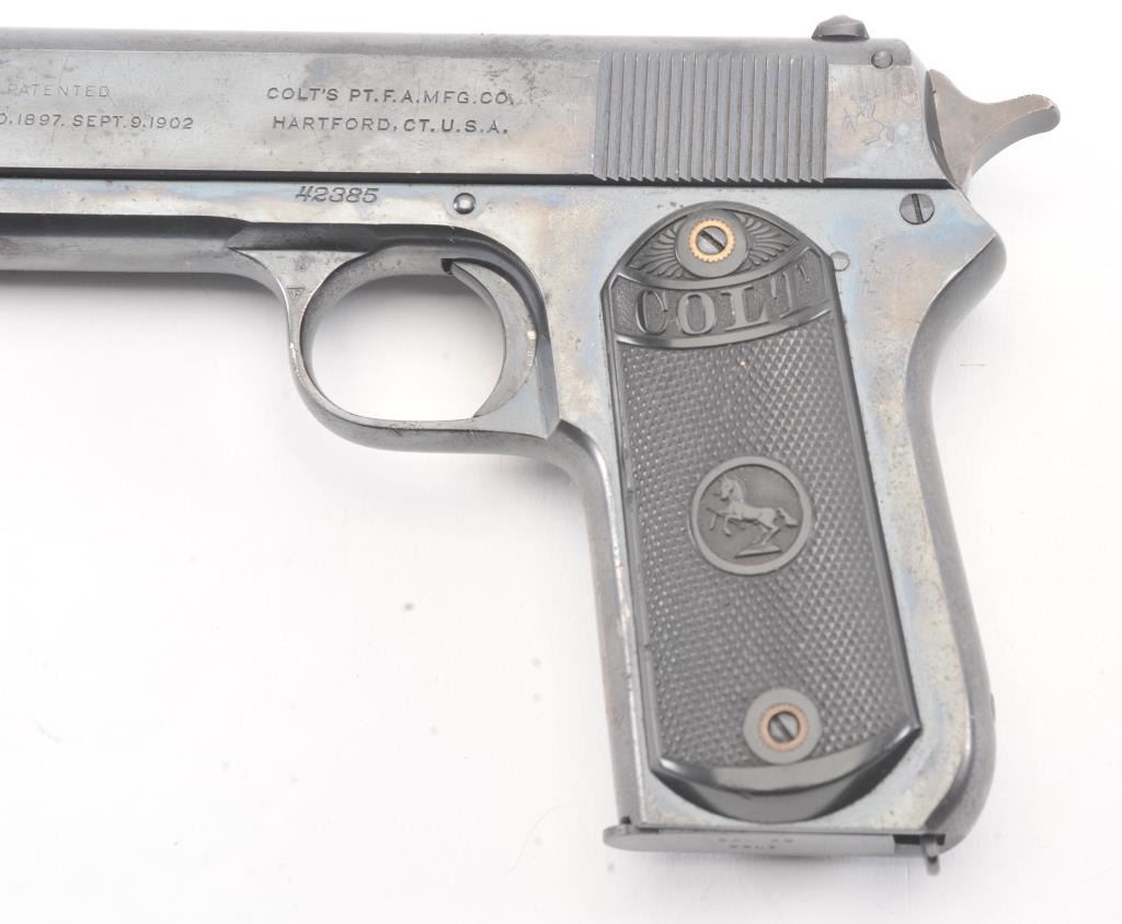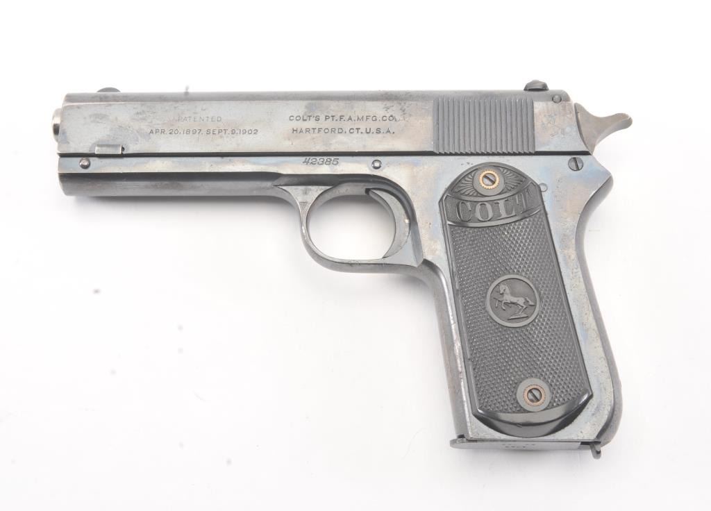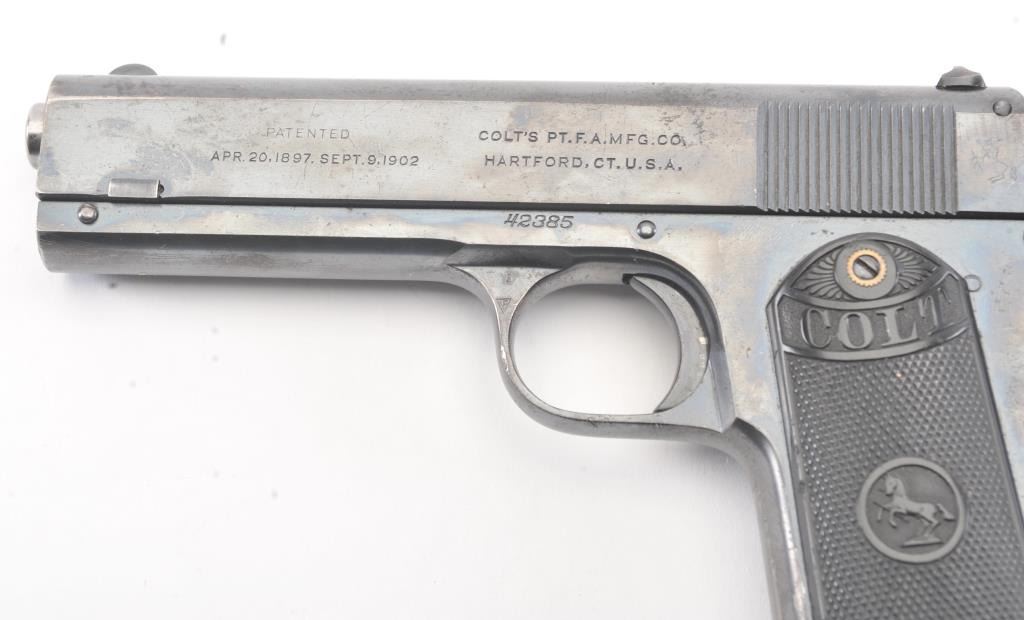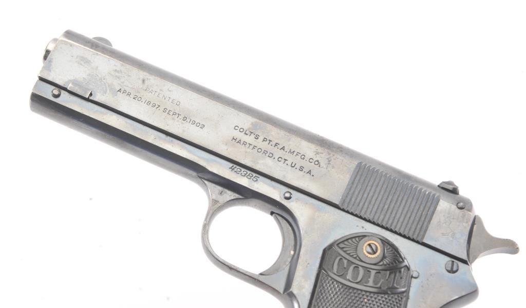 Colt Model 1903 Pocket Hammer semi-automatic pistol, .380 ACP caliber, Serial #42385. The pistol retains 90%-95% plus original blue finish in nearly fine overall condition with minor erosion just beginning. The markingsare sharp, grips are very good plus to almost fine. The pistol has the correct clip with small lettering, most case hardening on the hammer, good markings and an excellent bore, an 8 ½ to 9 on a scale of 1-10. Est.:$1,400-$2,800. (C+R/PPT).
