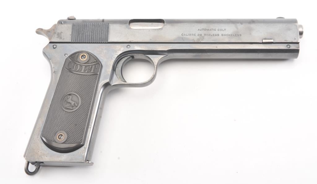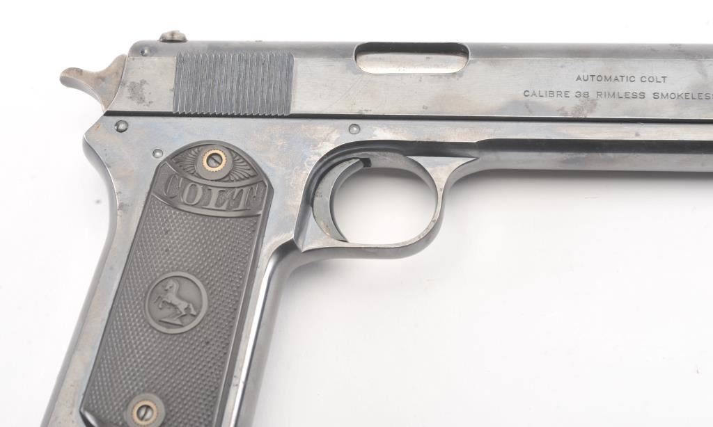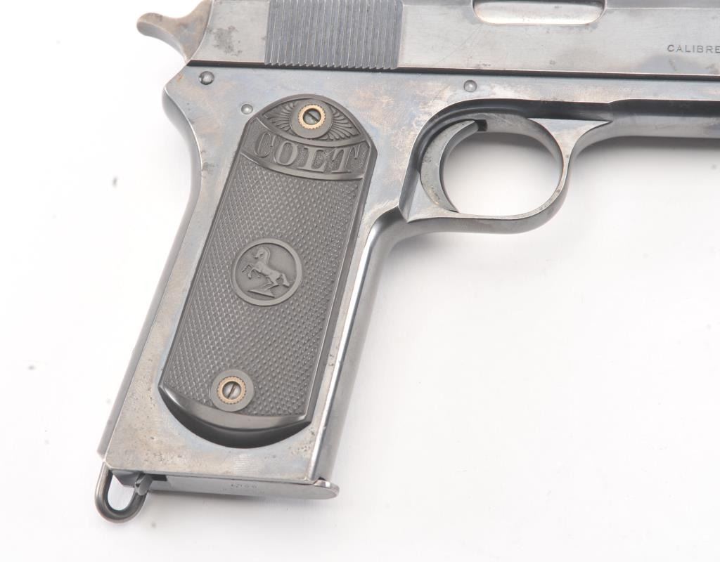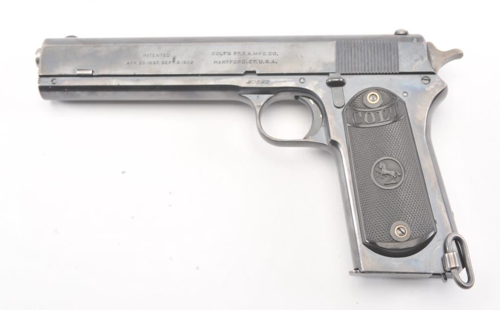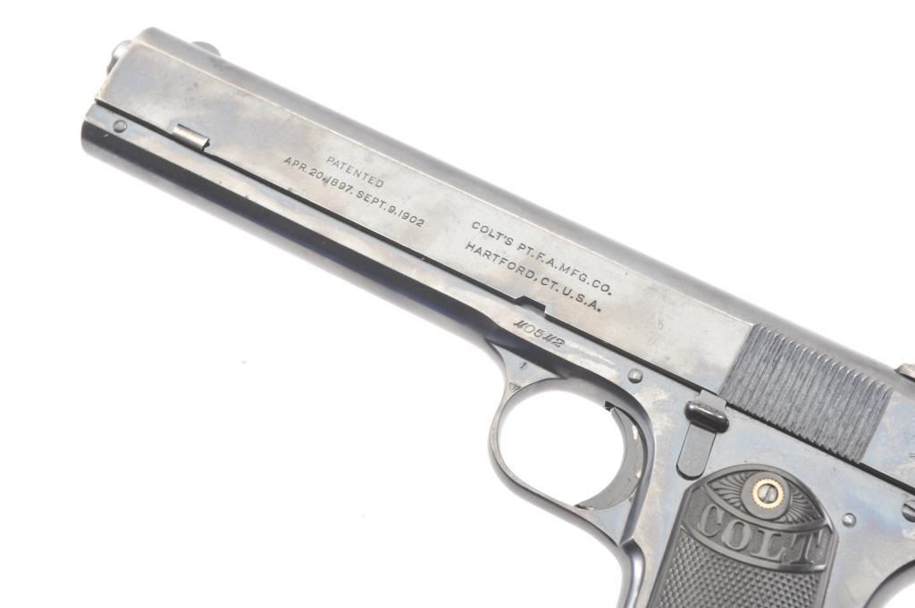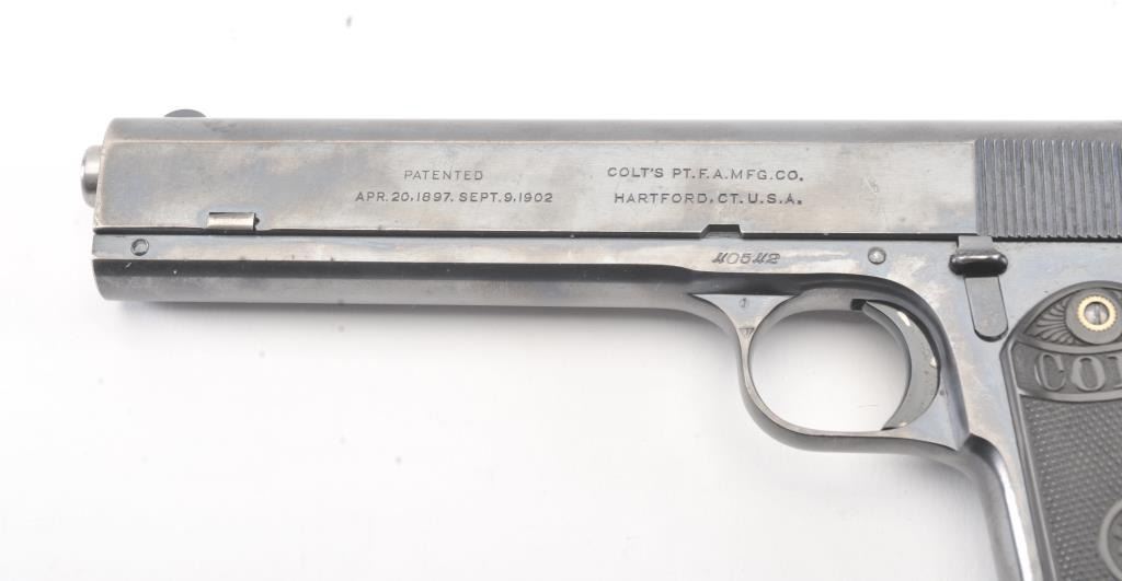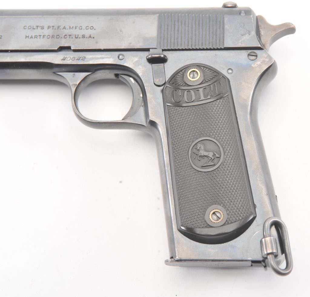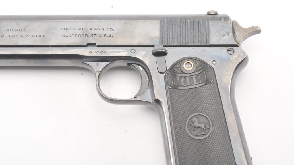 Colt 1902 Military Model semi-automatic pistol, .380 ACP caliber, Serial #40542. The pistol is in very good plus to nearly fine condition with 80%-90% original blue with losses at the muzzle and high points. Thepistol shows sharp markings with very good plus hard rubber grips. The hammer shows strong case colors with correct marked magazine (small letters type). The pistol has a good interior and bright bore. Astrong 8 on a scale of 1-10. Est.: $2000-4000(C+R/PPT).
