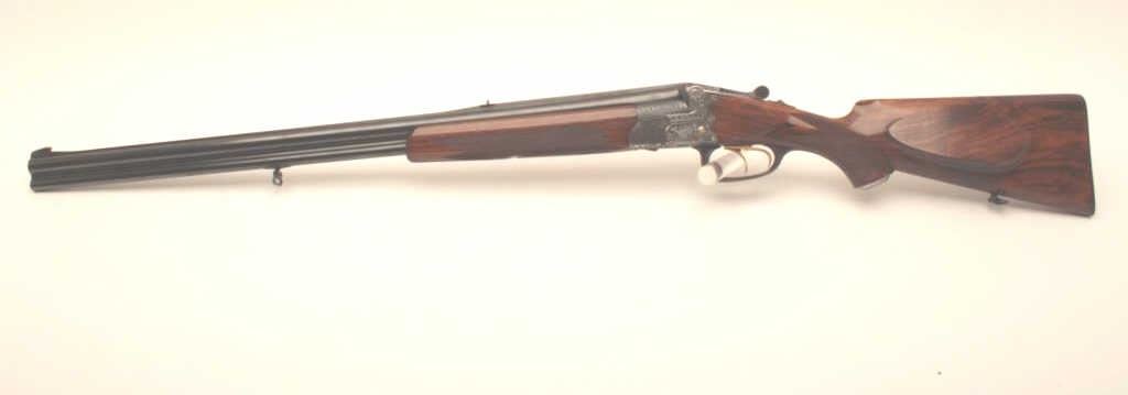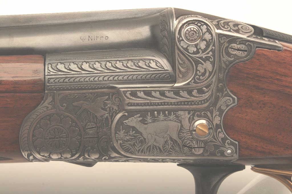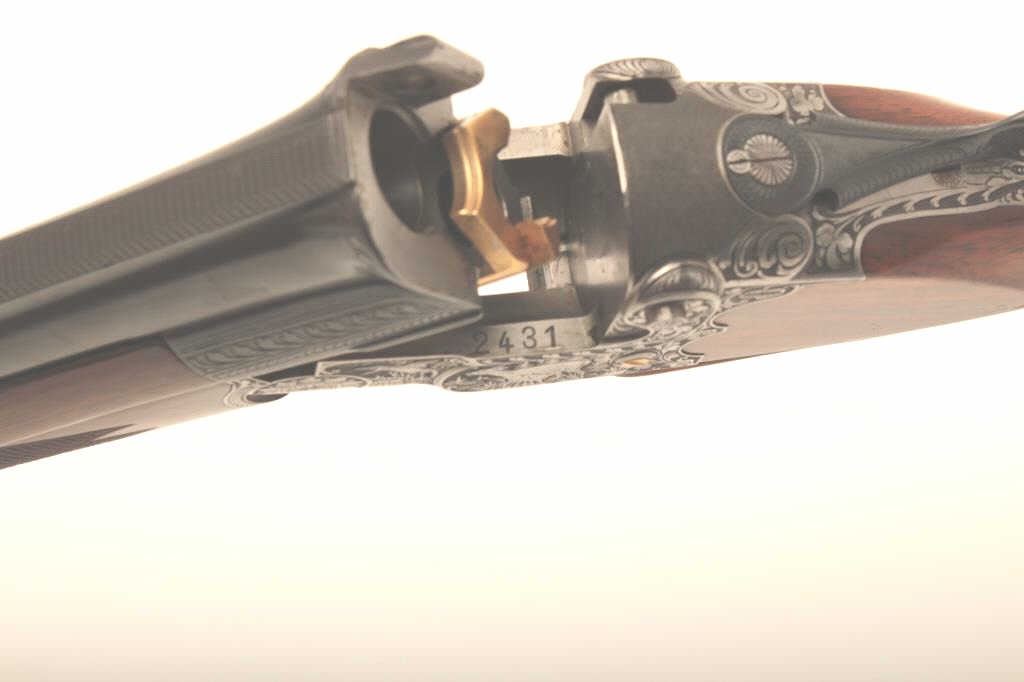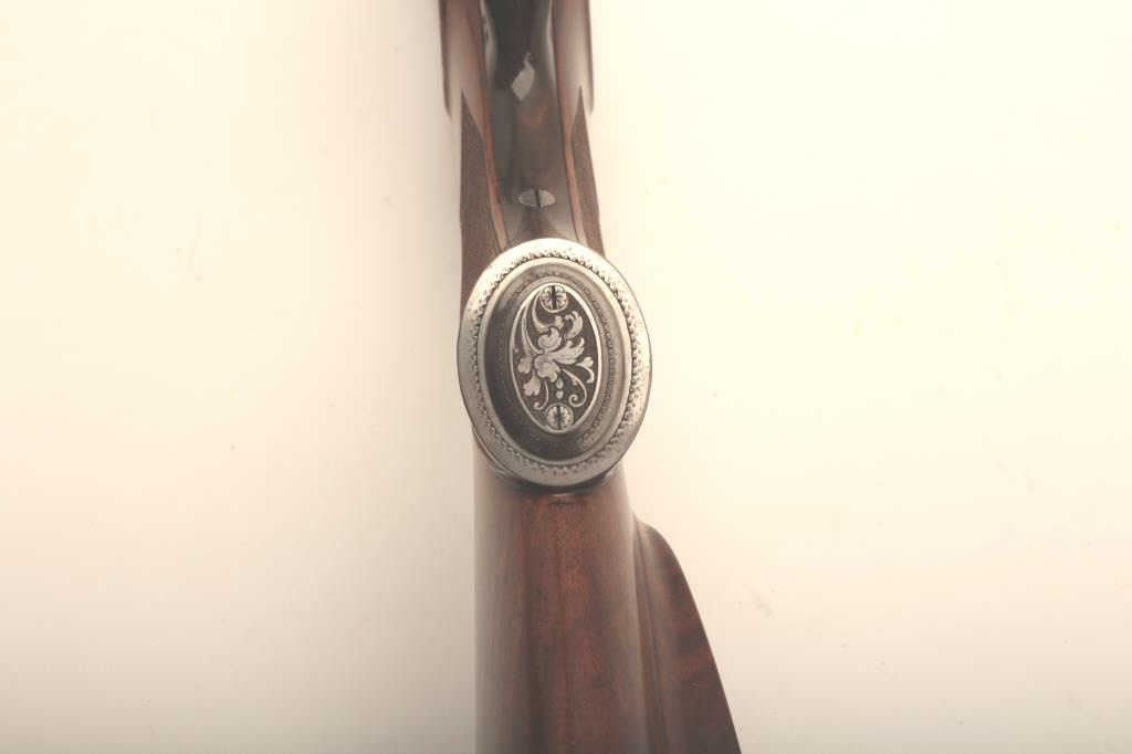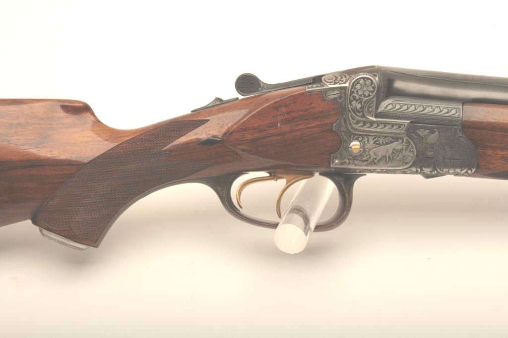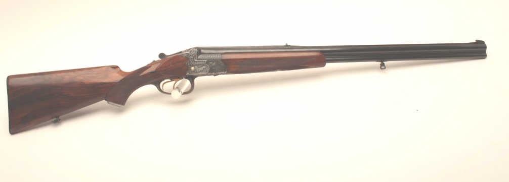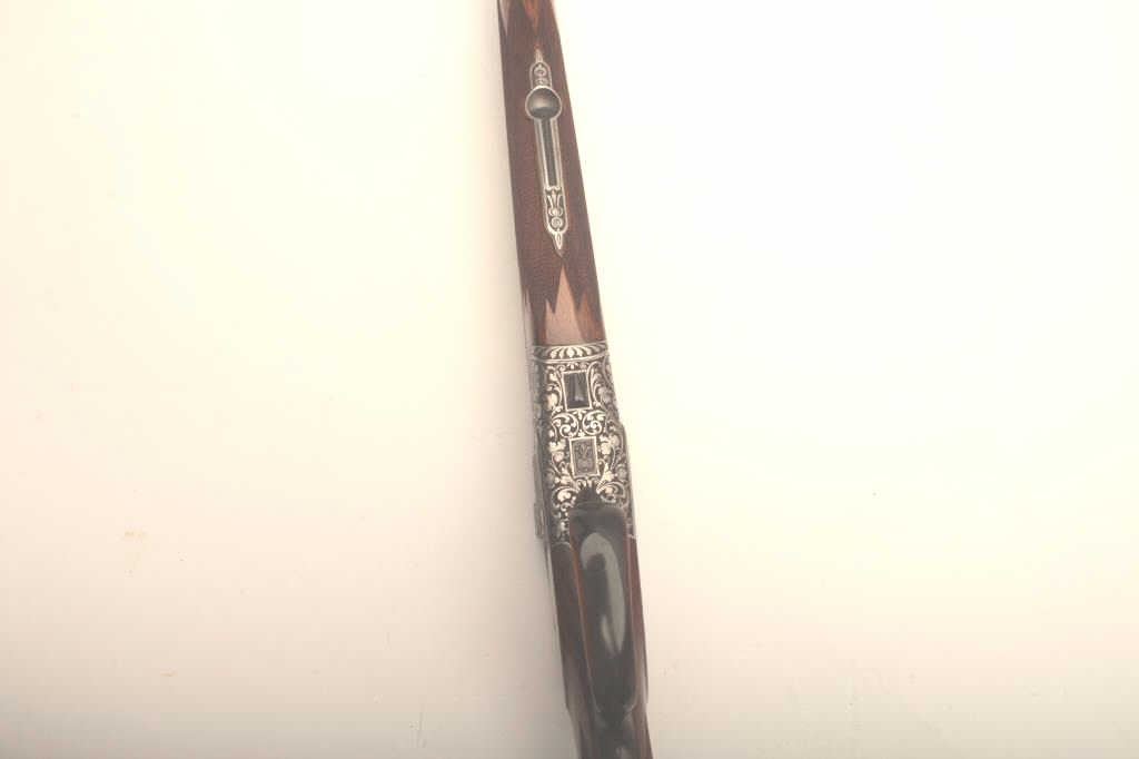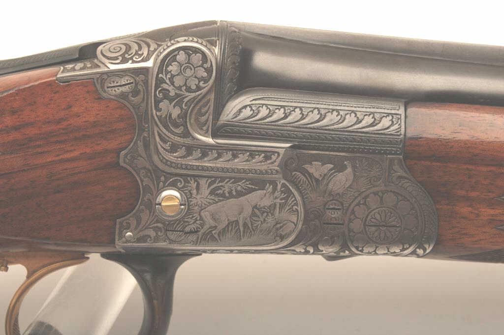 German (Suhl) O/U very rare high grade shotgun, 16 gauge/.410 gauge, 26” blued barrels, finely high relief engraved receiver with game panel scenes on both sides, finely checkered wood stocks with beautifulgraining to butt stock, sling swivels, gold plated double triggers, horn trigger guard, S/N 2431; overall fine condition with fine bores, crisp actions and fine wood. (Modern/NO PPT). Est.: $2500-5000