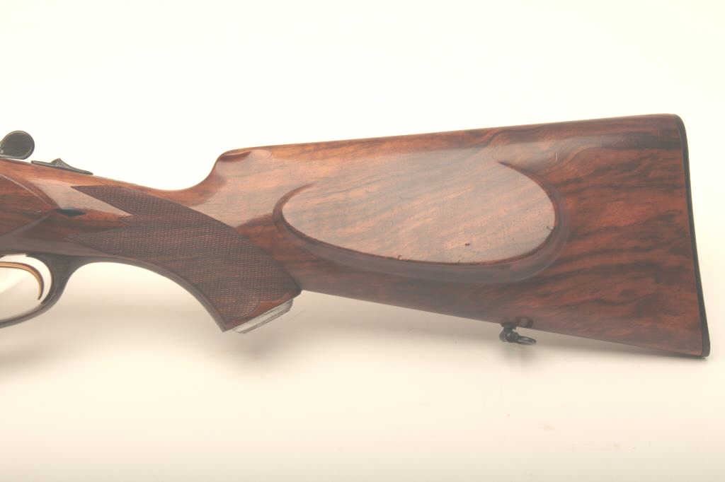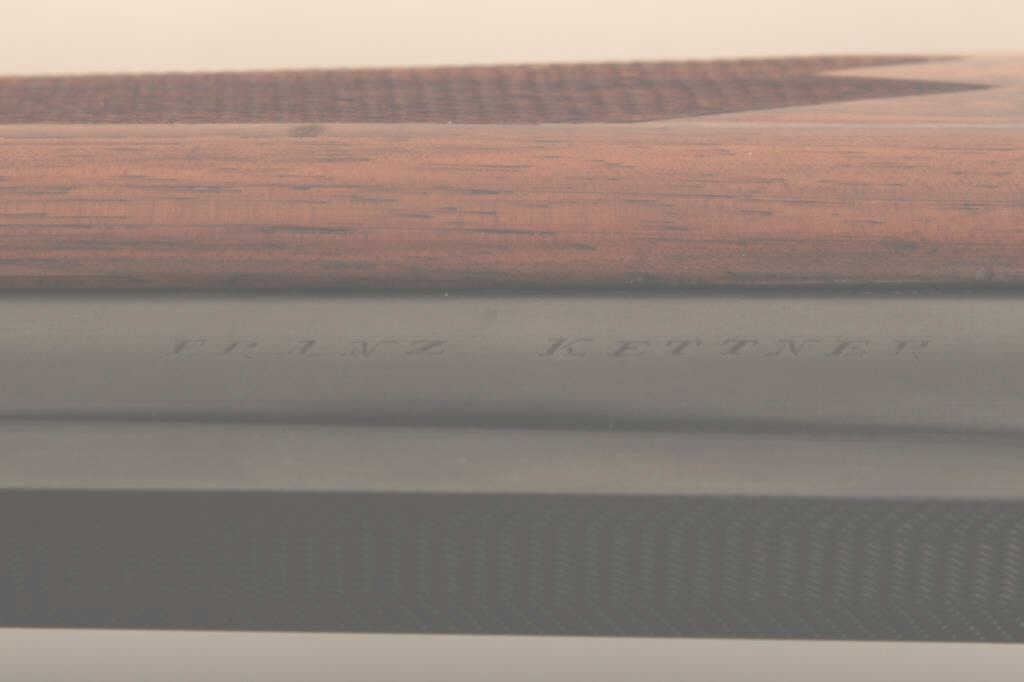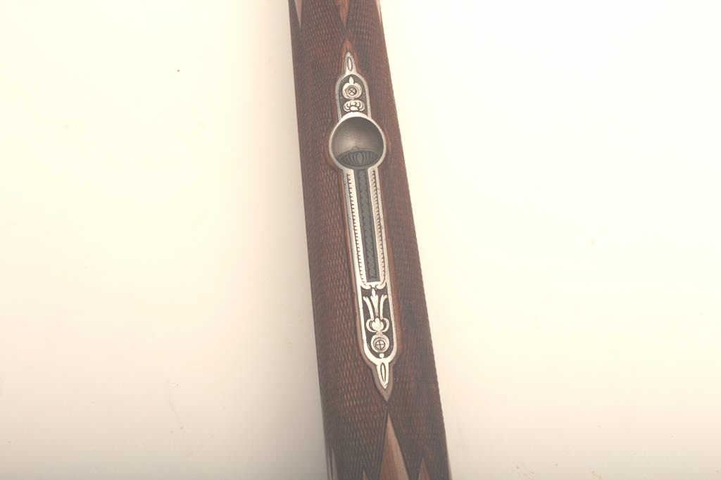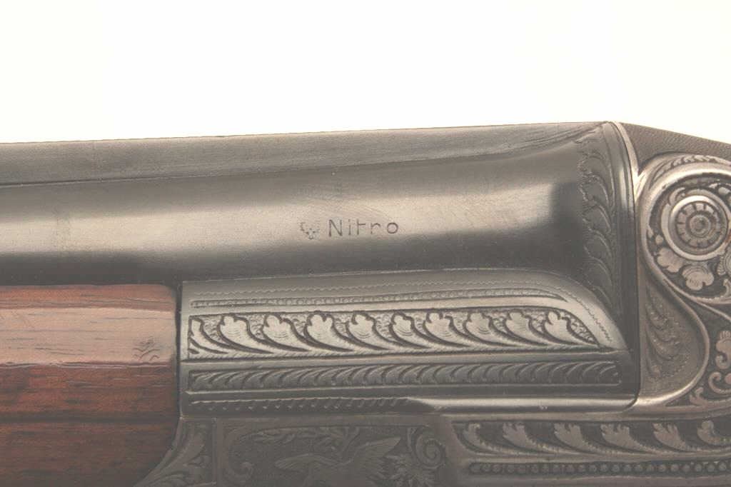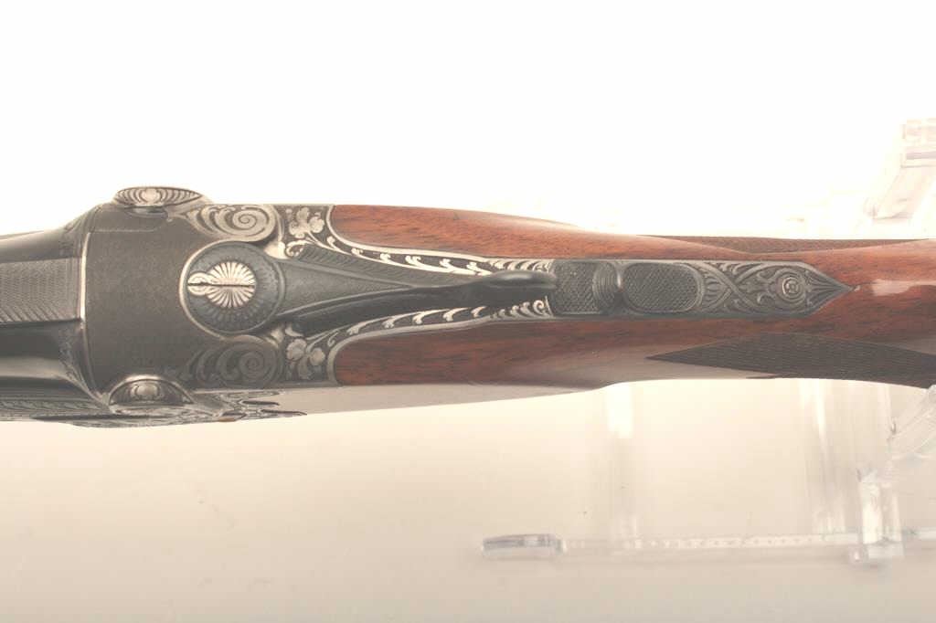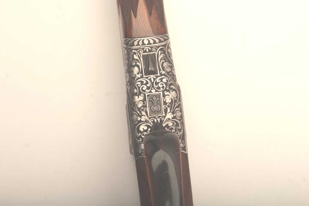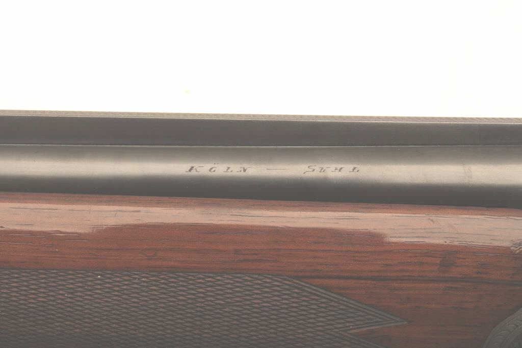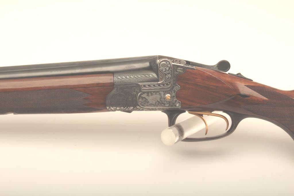 German (Suhl) O/U very rare high grade shotgun, 16 gauge/.410 gauge, 26” blued barrels, finely high relief engraved receiver with game panel scenes on both sides, finely checkered wood stocks with beautifulgraining to butt stock, sling swivels, gold plated double triggers, horn trigger guard, S/N 2431; overall fine condition with fine bores, crisp actions and fine wood. (Modern/NO PPT). Est.: $2500-5000
