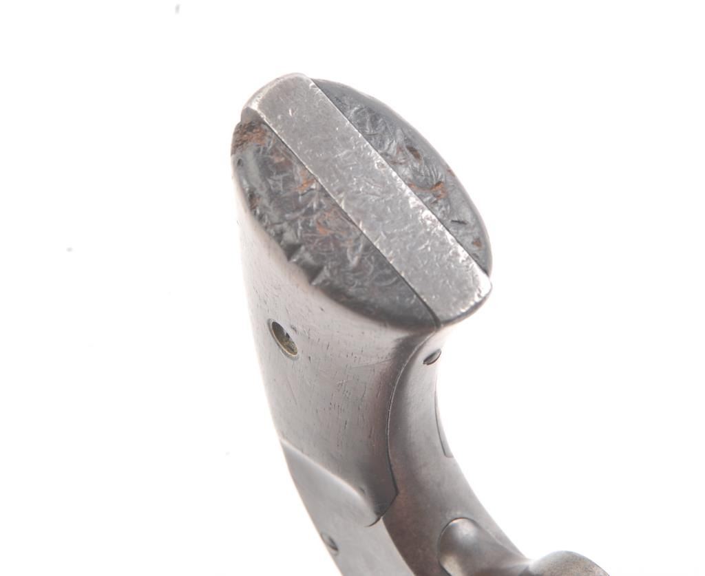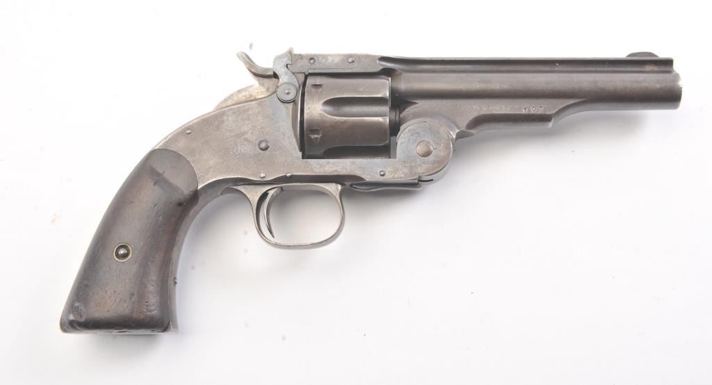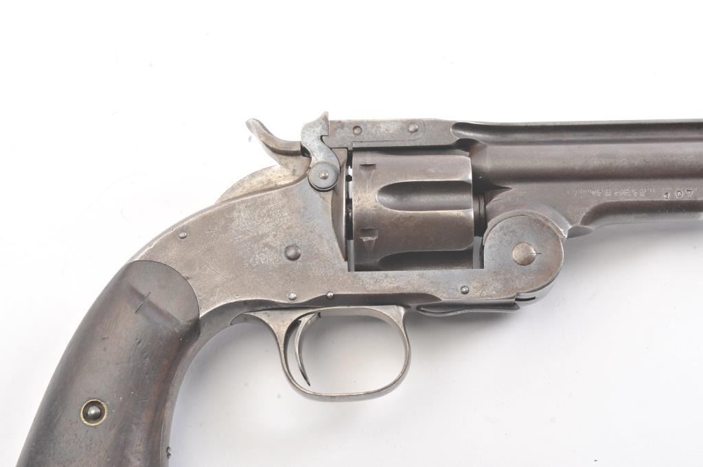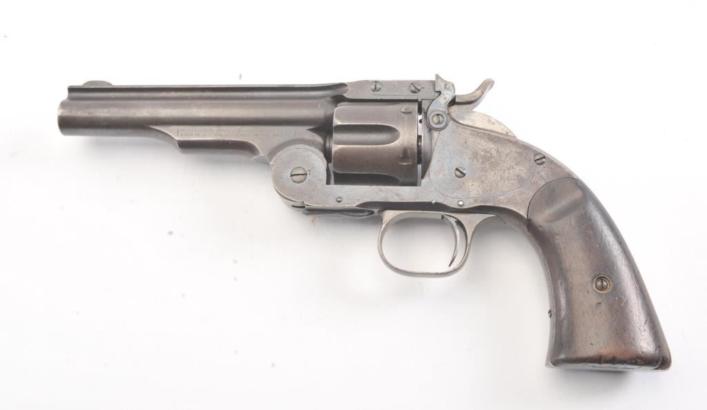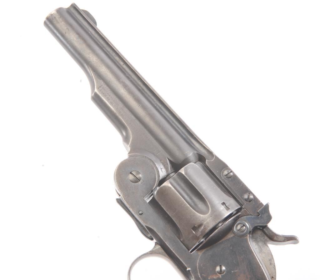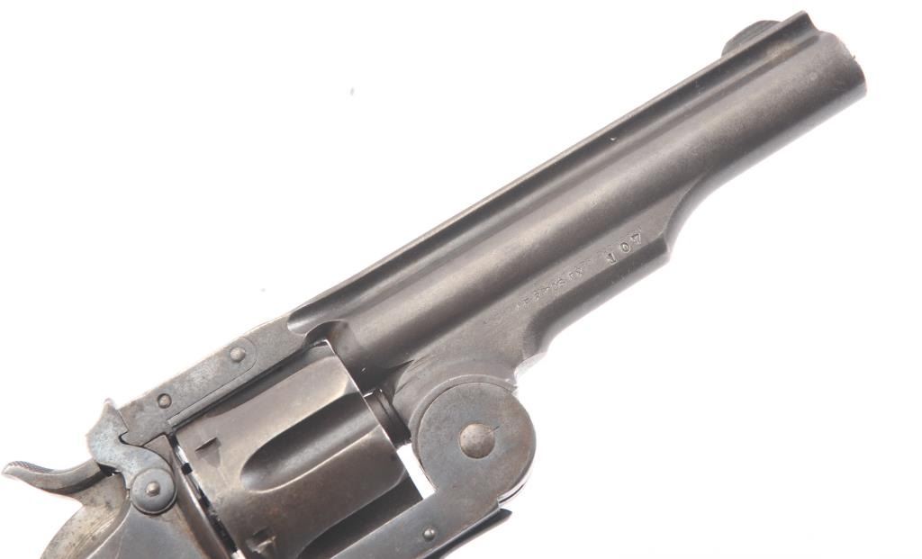 Schofield .45 caliber revolver with 5 ¼” period shortened barrel and authentic Wells Fargo #107 marking. The pistol retains 30%-50% toning blue finish with good metal surfaces. The grips show wear and smalllosses, but at least good overall, good action with some and a fair bore. Est.: $3,500-$7,000. (Antique).