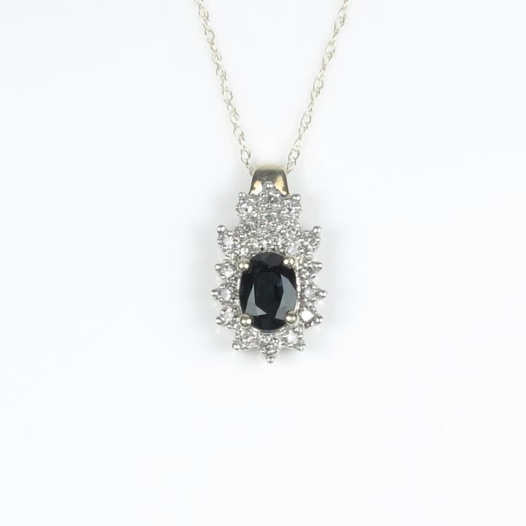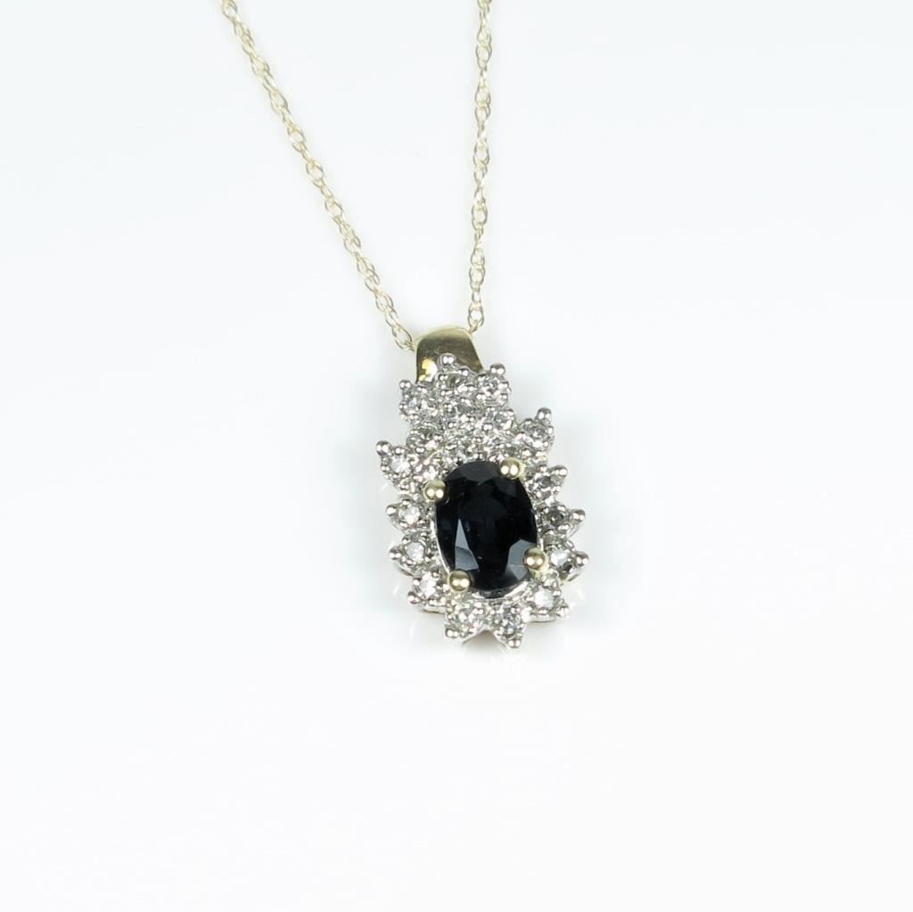 Elegant Blue Sapphire and Diamond Pendant featuring an oval Sapphire weighing approx. 1.00 carat accented with 22 round Diamonds weighing approx. 0.60 carats with F-G colors set in 10 karat two-tone gold setting.Estimates $800-$1,200