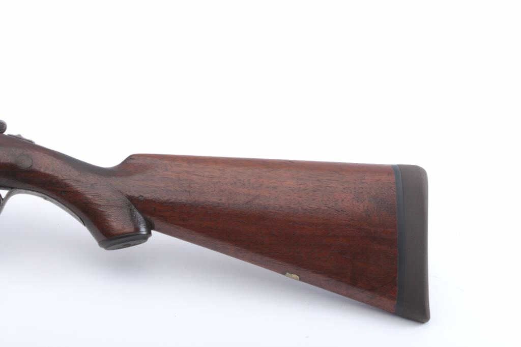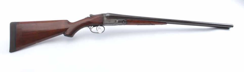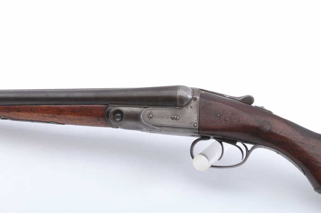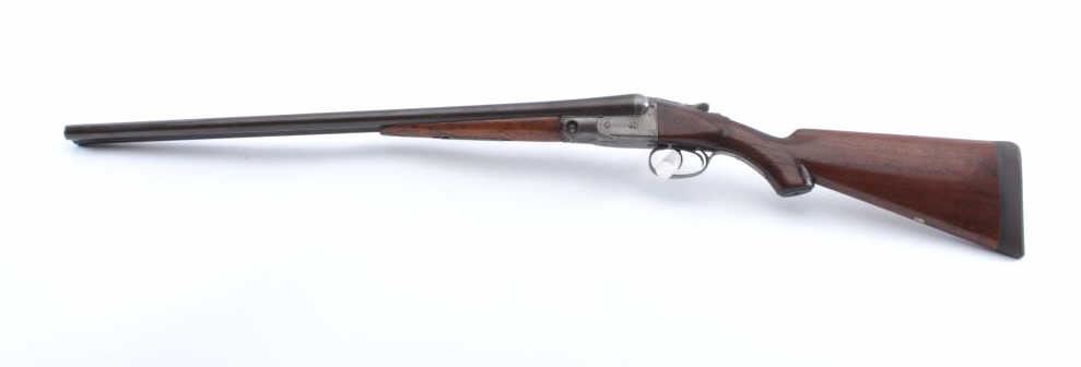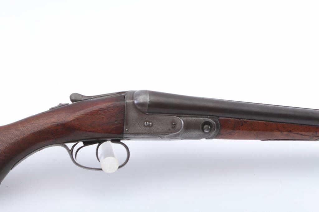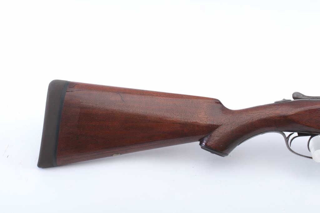 Parker V Grade S x S shotgun, 12 gauge, Serial #135714. The shotgun is in good overall condition with 26” Vulcan steel barrels with a full-length filed rib. The barrels have gone to a brown patina with asteel bead front sight. The receiver is silver toned case hardening with border engraving. The checkered wood stocks are in good condition with a splinter fore end, pistol grip and double triggers. The buttstock ends with a KICK-EEZ solid rubber recoil pad providing a 14 ½” LOP. The bores are fair, the action is crisp and the markings are sharp. Est.: $500-$1,000. (C+R).