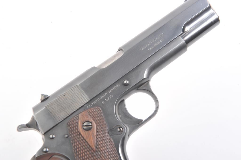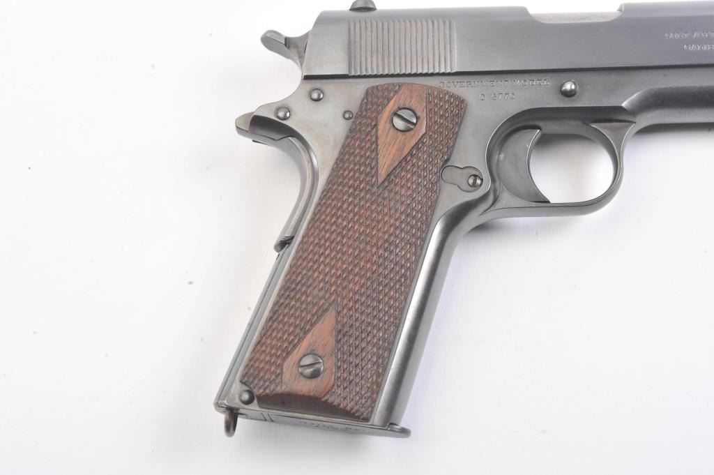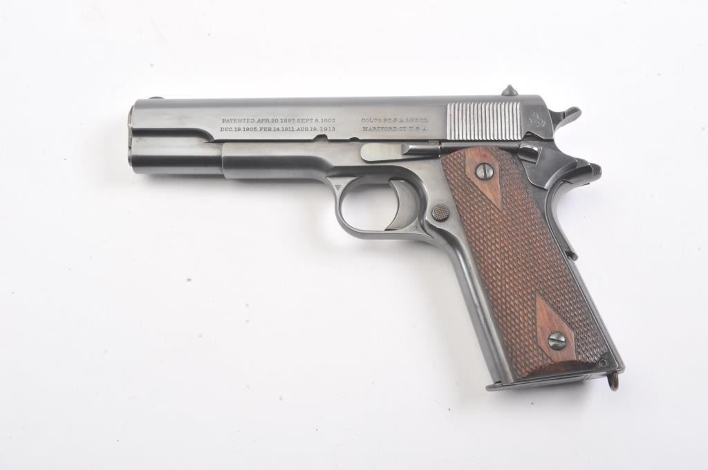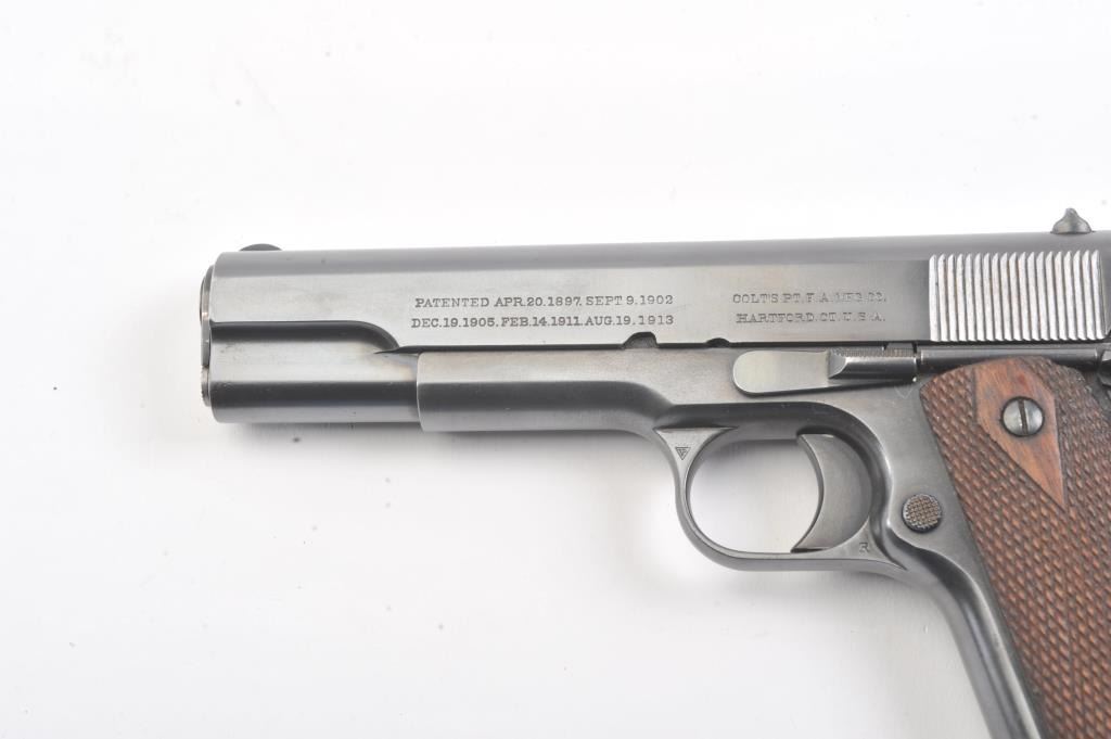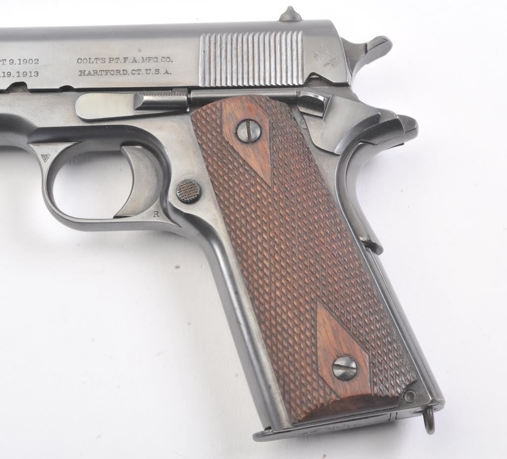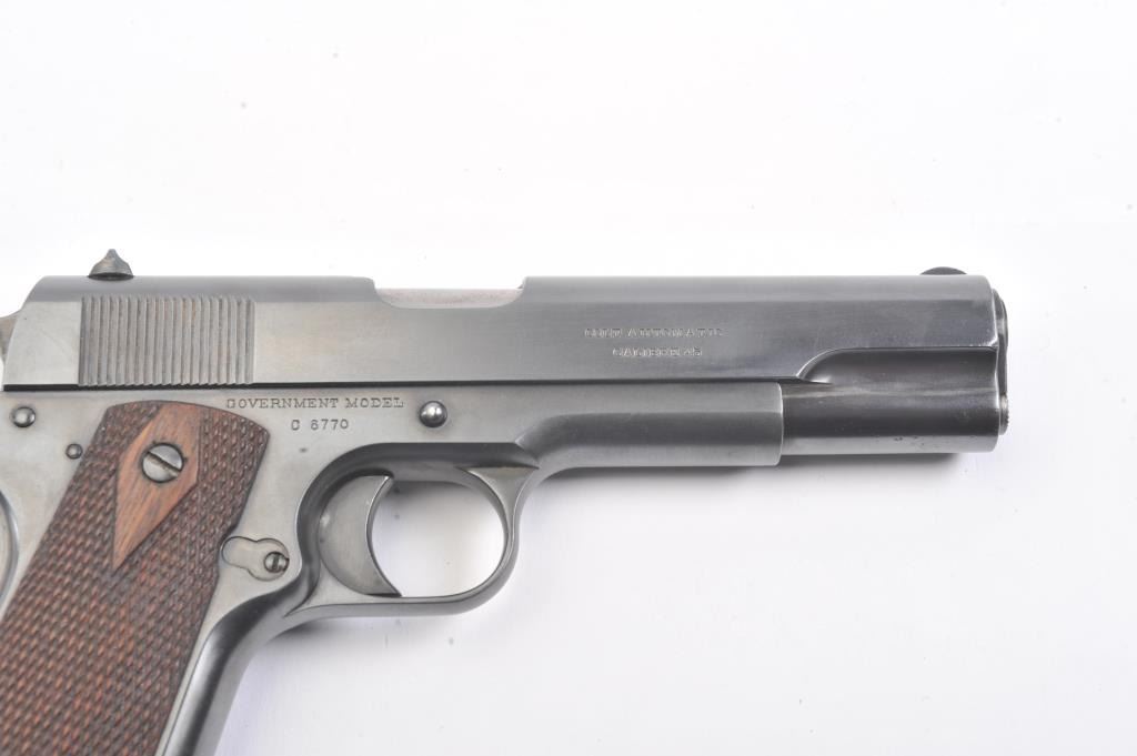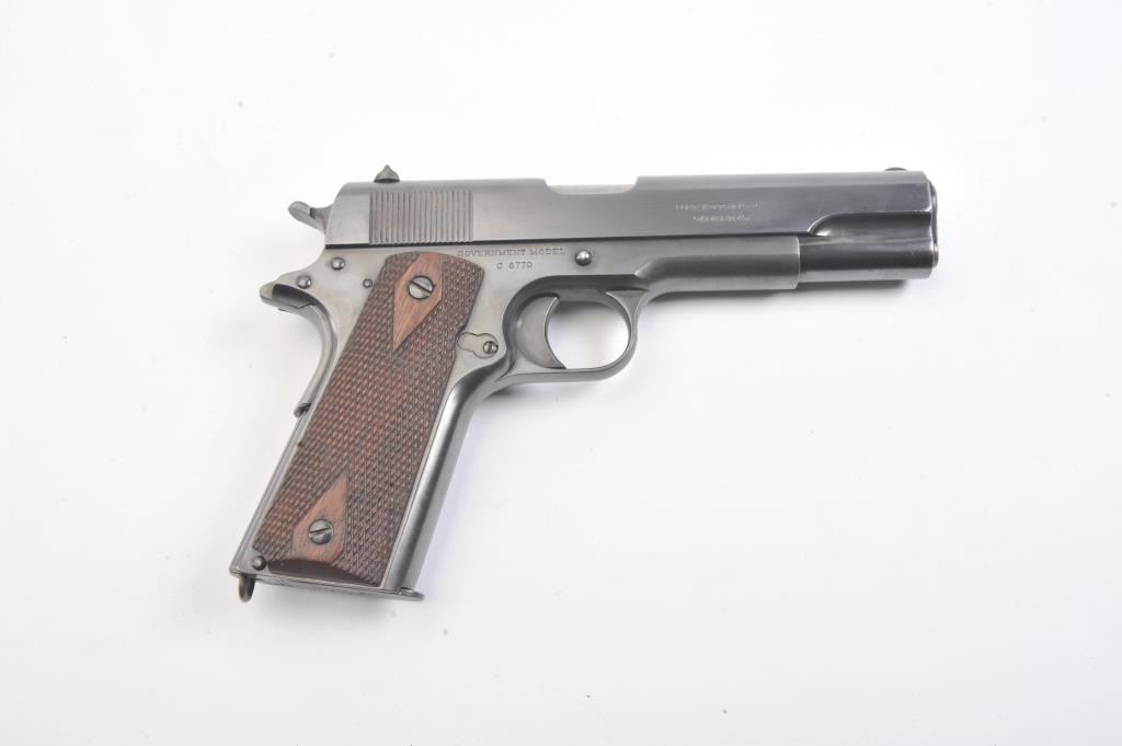 Colt Government Model 1911 semi-automatic pistol, .45 ACP caliber, Serial #C6770. The pistol is in fine overall condition as re-finished with an old, quality re-blue to the metal surfaces. There is old pinprickpitting at the muzzle with proofs and acceptance marks on the frame and a good Rampant Colt emblem at the rear of the slide. The checkered wood grips are in very good condition with a lanyard ring at the butt.The bore is good, the action is crisp and the markings are sharp. The lot includes one correct magazine. Est.: $700-$1,400. (C+R).