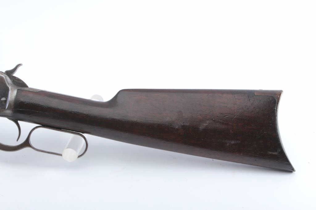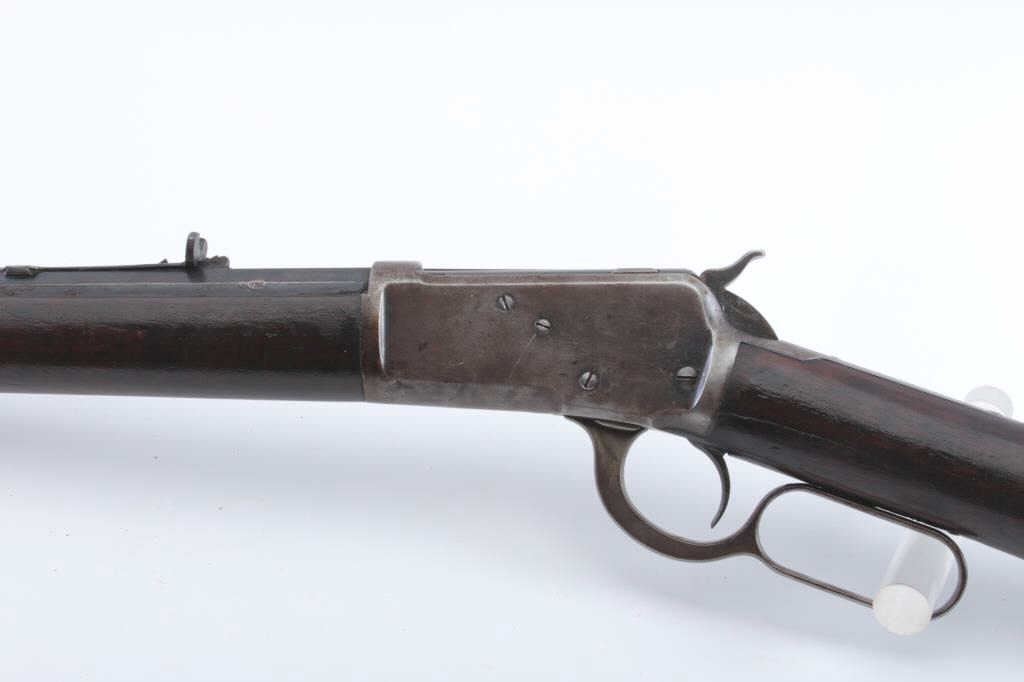 Winchester Model 1892 lever action rifle, .25-20 WCF, Serial #229620. The rifle is in good overall condition with a 24” octagon barrel and a full-length magazine. The barrel and magazine retain a significantamount of original blue finish with sharp edges, scratches and some knackering near the front ring. The receiver has gone to a grey/brown patina with dull case hardening on the hammer, trigger and protected areas onthe lever. The loading gate shows dull blue finish. The smooth wood stocks are in good condition with an extra coat of lacquer and small lateral cracks on both sides of the wrist. The butt ends with a smooth steelcrescent butt plate. The bore is fair, the action functions and the markings are legible. Est.: $700-$1,400. (C+R).