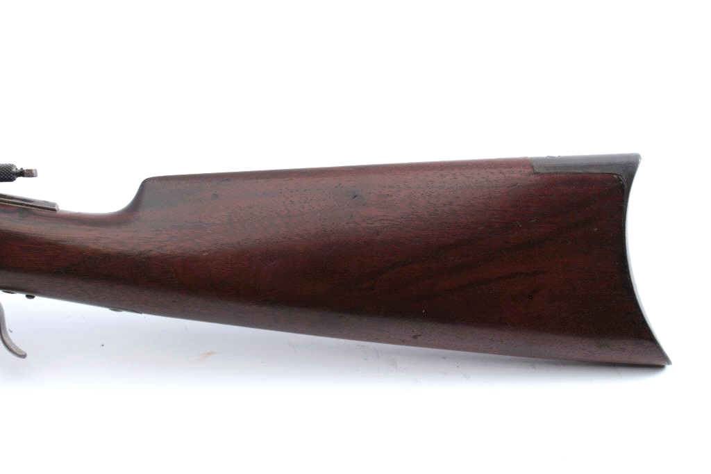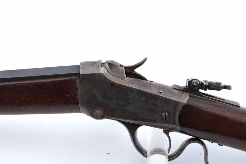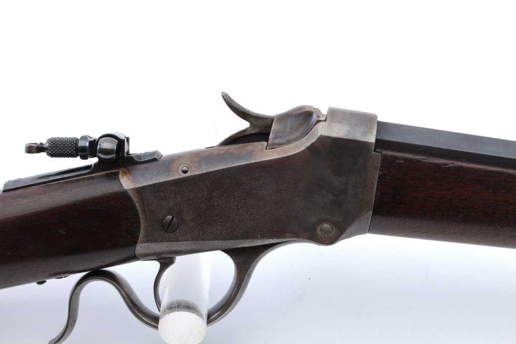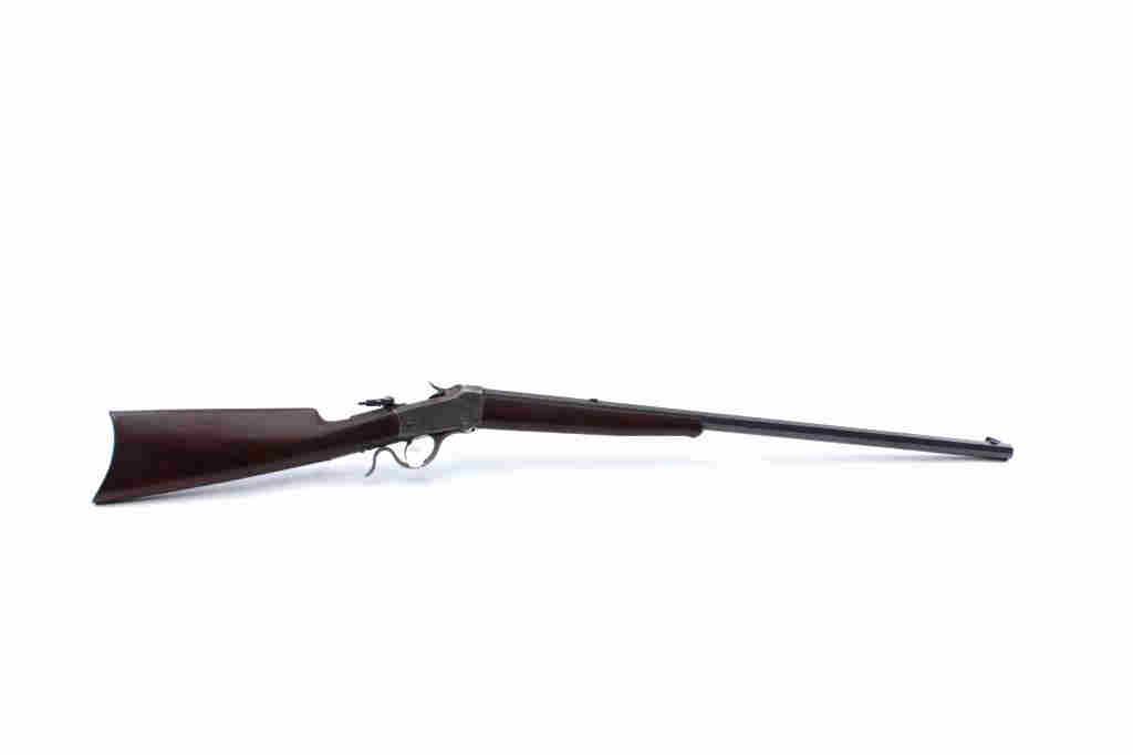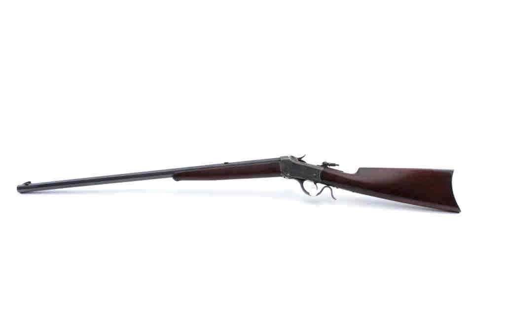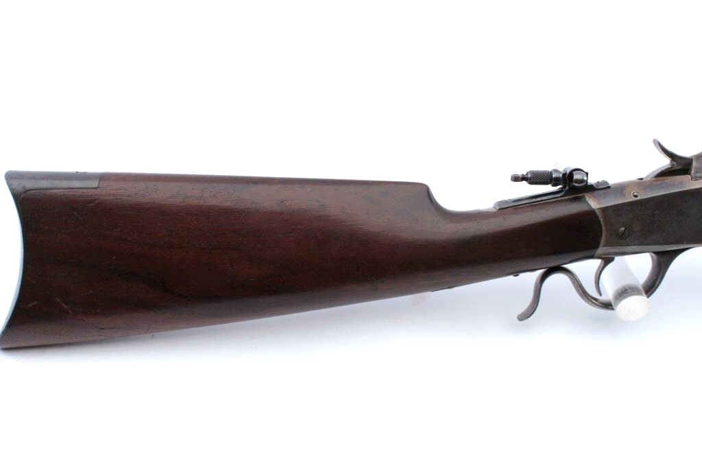 Winchester Model 1885 Low Wall, #41745, .22 WCF cal., 26" octagon barrel, blued finish with color case hardened frame, tang sight, plain wood stock with crescent butt. Rifle is in fine condition overall, retaining 95%+original blue, 85-90% color case colors, bore is very good with minor corrosion near the chamber, action is good. The stock is very good with minor nicks, dings scratches and blemishes. A 9 on a 1/10 scale. (Modern)Est. $1400-2800