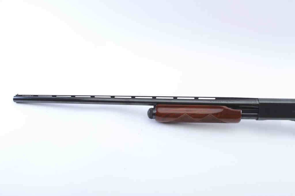 Remington Model 870 Wing Master pump shotgun, 16 gauge, Serial #712684W. The shotgun is in very good to nearly fine overall condition with a 28” barrel with a full-length ventilated rib. The metal surfaces retainnearly all of the blue finish with light handling marks. The checkered wood stocks are in very good condition with small mars and scratches consistent with field use. The butt stock ends with a ventilated rubberrecoil pad providing a 14 ½” LOP. The bore is good, the action is crisp and the markings are sharp. Est.: $250-$500. (Modern).