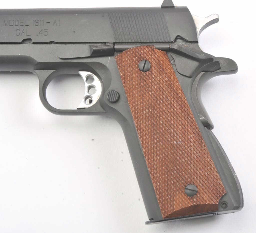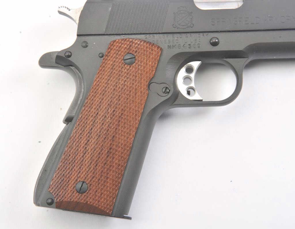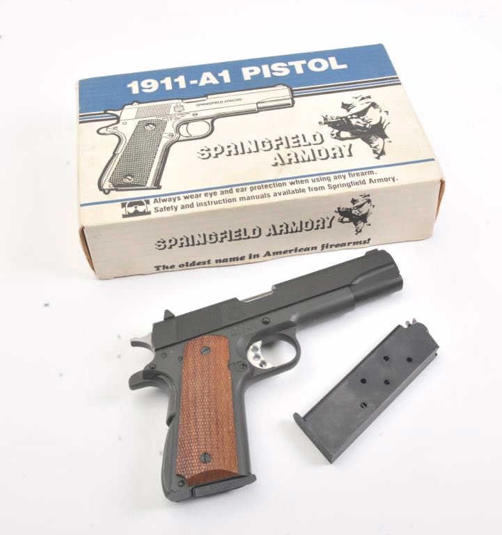 Springfield Armory Model 1911-A1 semi-automatic pistol, .45 ACP caliber, Serial #NM84389. The pistol is as new in the factory cardboard box with a5” barrel. The pistol has some dried oil on the slide thatshould clean, but is otherwise as new. The checkered wood grips are in excellent condition showing no wear. The lot includes the factory box with packaging materials and an extra magazine. Est.: $400-$800.(Modern/PPT).
