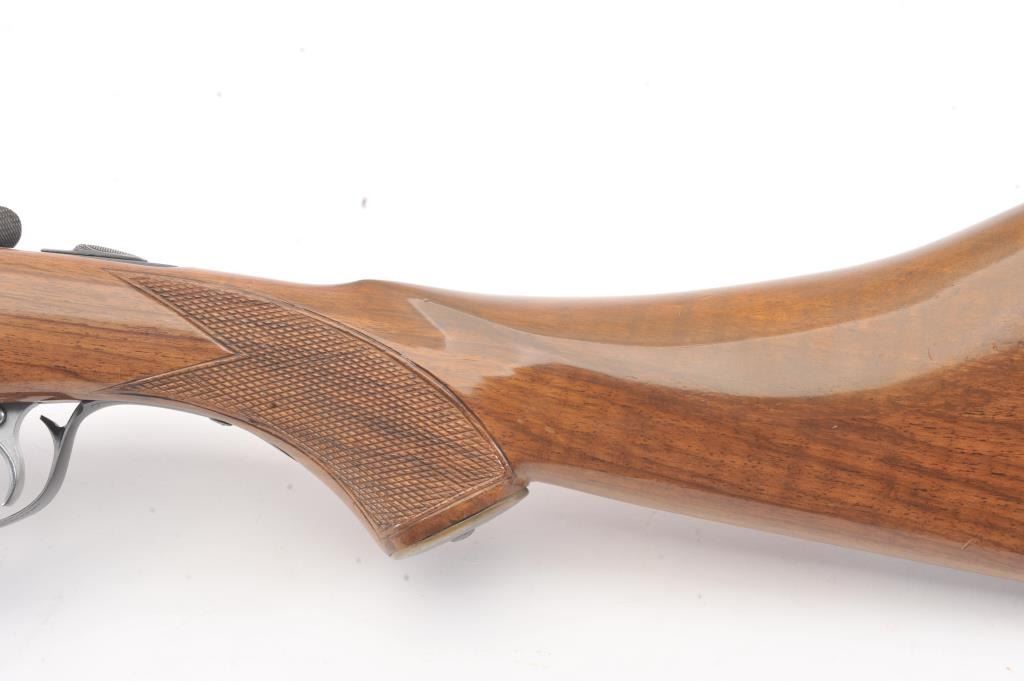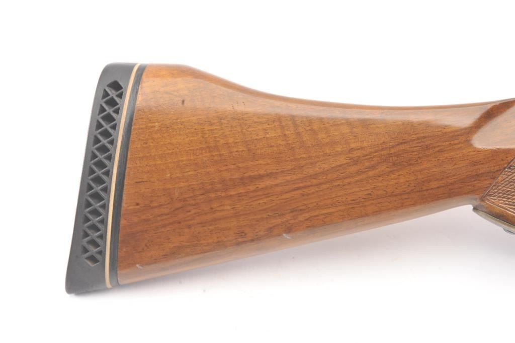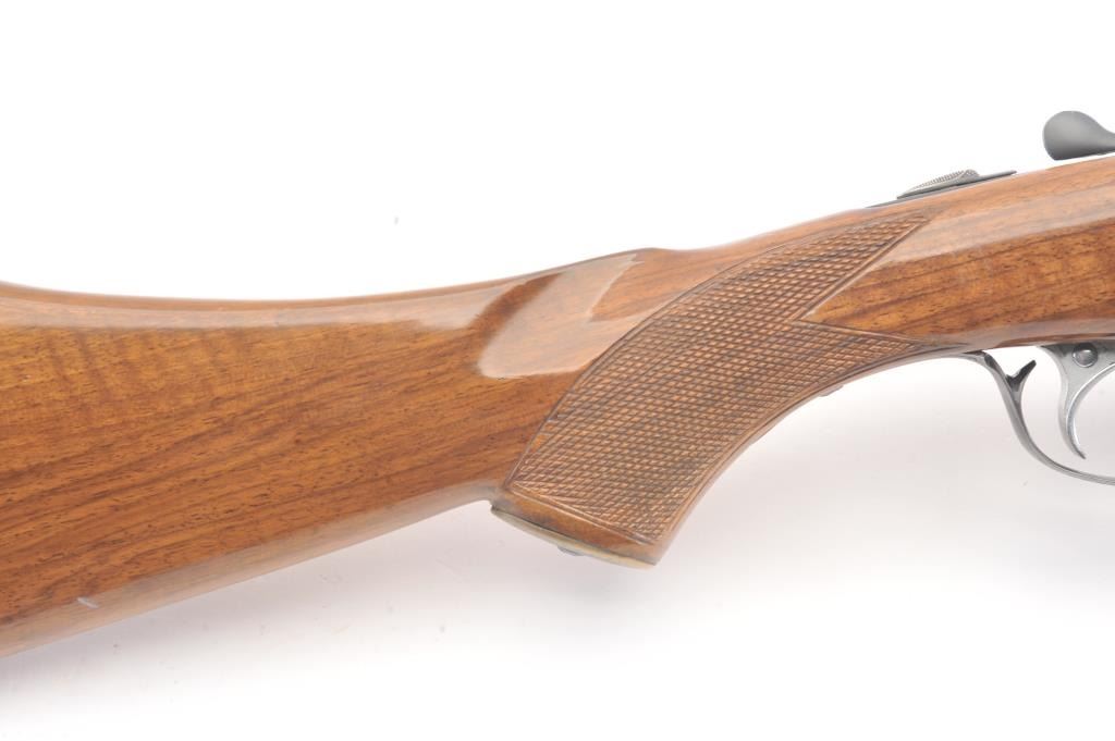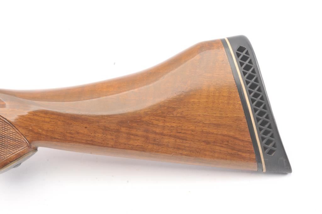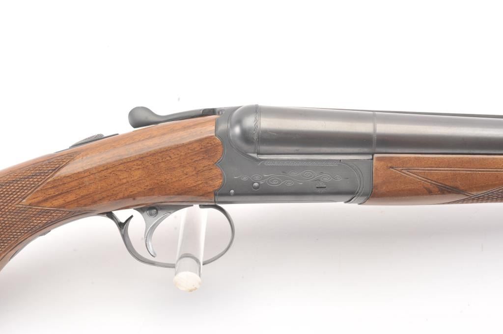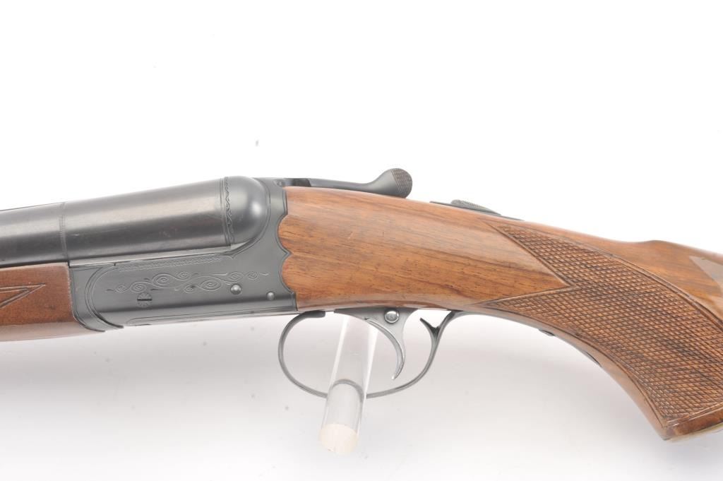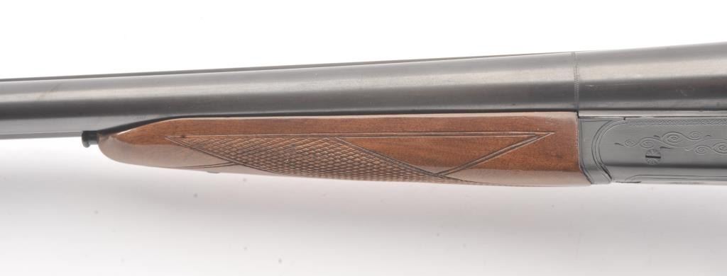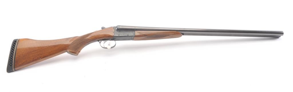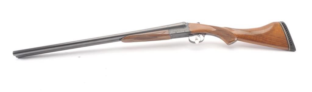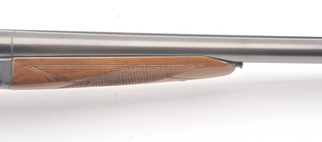 Ithaca Model 100 Side by Side shotgun, 12 gauge, Serial #179543. The shotgun is in very good to nearly fine overall condition with 26” barrels with a full-length rib and Hi-Viz front sight. The shotgun is chokedfor Modified and Improved Cylinder with 2 ¾” chambers. The shotgun retains approximately 96%-98% of the blue finish with light handling marks. The checkered wood custom stock is in very good condition with anAnson-Deeley fore end, pistol grips and comb reduced for use with a parka. The butt stock ends with a ventilated rubber recoil pad providing a 13 ¾” LOP to a single selector trigger. The bores are good and the actionis crisp on this desirable Model 100 built for Ithaca by SKB. Est.: $150-$300. (Modern).