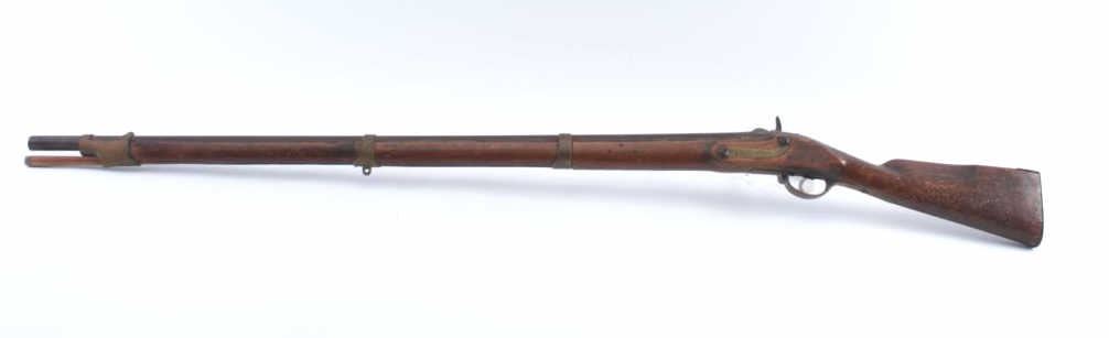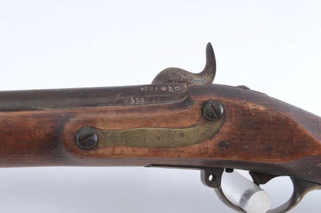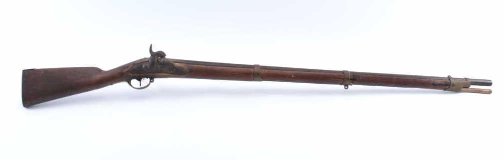 German Federal type .75 caliber percussion musket, marked Danzig Arsenal and dated 1834. The musket is in good overall condition with middle band and rear band springs missing. The action works well with goodmarkings, a light coating rust and dark patina with scattered pitting. The hand carved wood rod and second band spring area were inlaid with wood during the period of use. A large number of these type musketswere imported and used during the Civil War era and traded in the West after. Est.: $200-$400. (Antique).