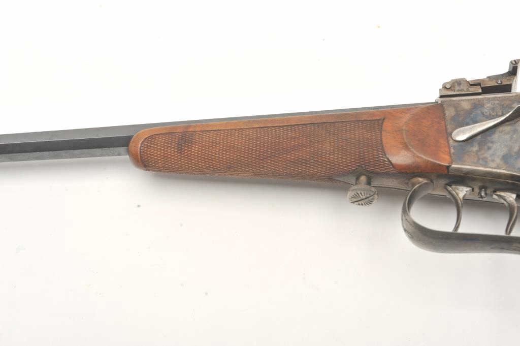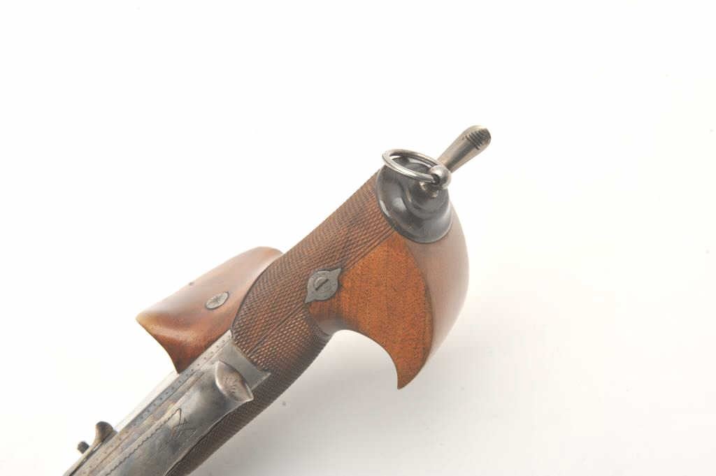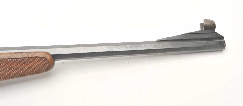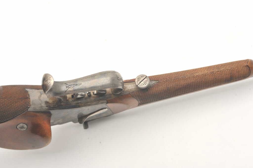 Fine Pre-War Single Shot falling block target pistol marked Buchel original “Tell” (Model). Adjustable iron rear sight and double set triggers. Finely made checkered stocks for small hand. The octagon barrelmeasures 14 ¾”. 95% plus original blue and case colors with bright bore. This pistol was purchased in Germany in late 20s to early 30s by local Anaheim resident with family in Germany and has had only 2 owners in its life span. (C&R/PPT)1750-3500