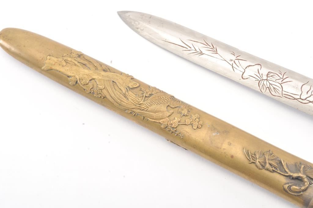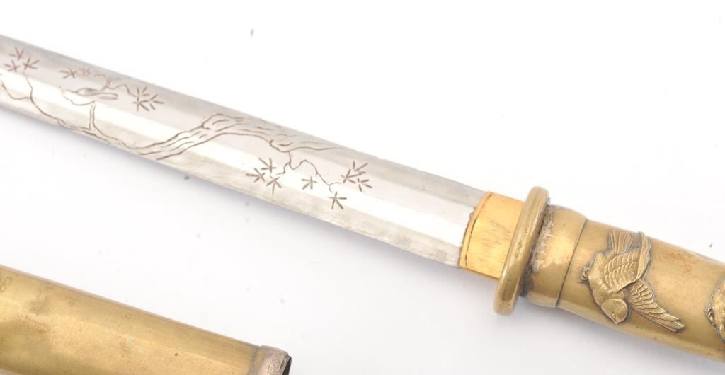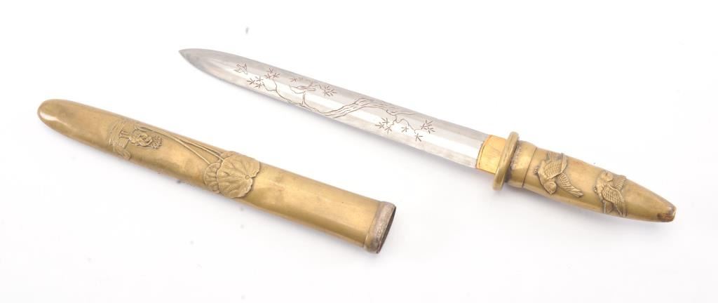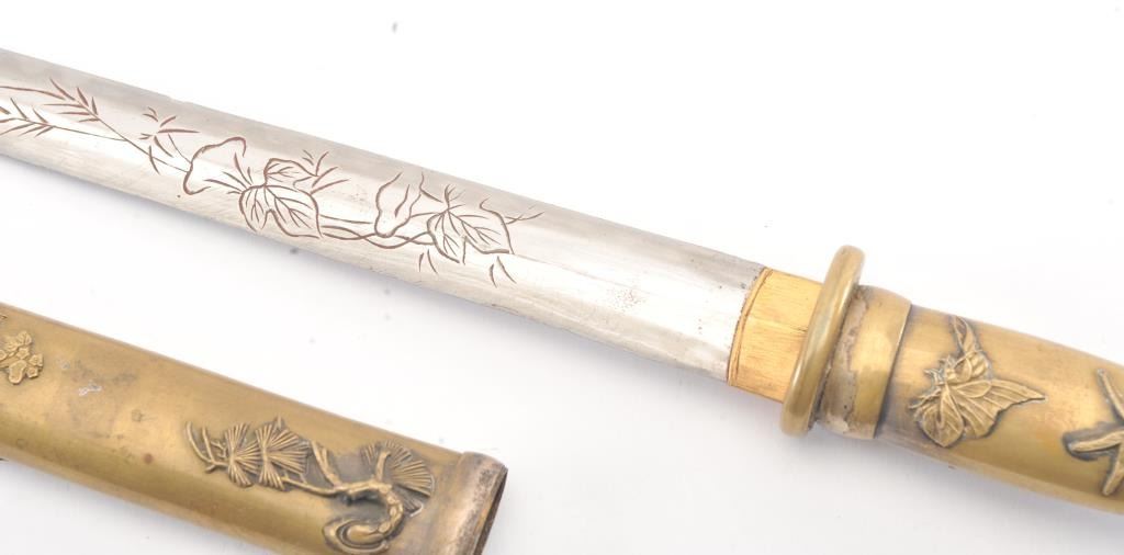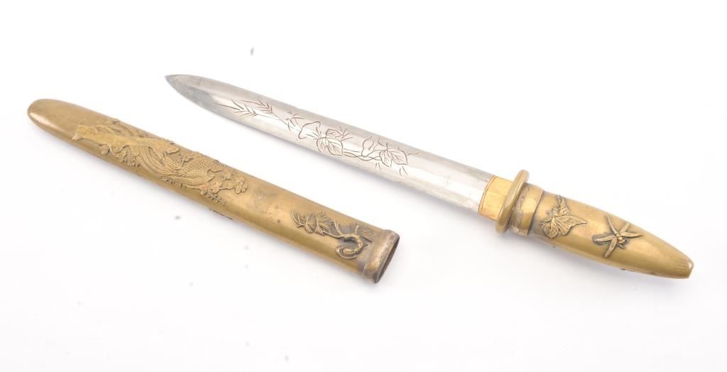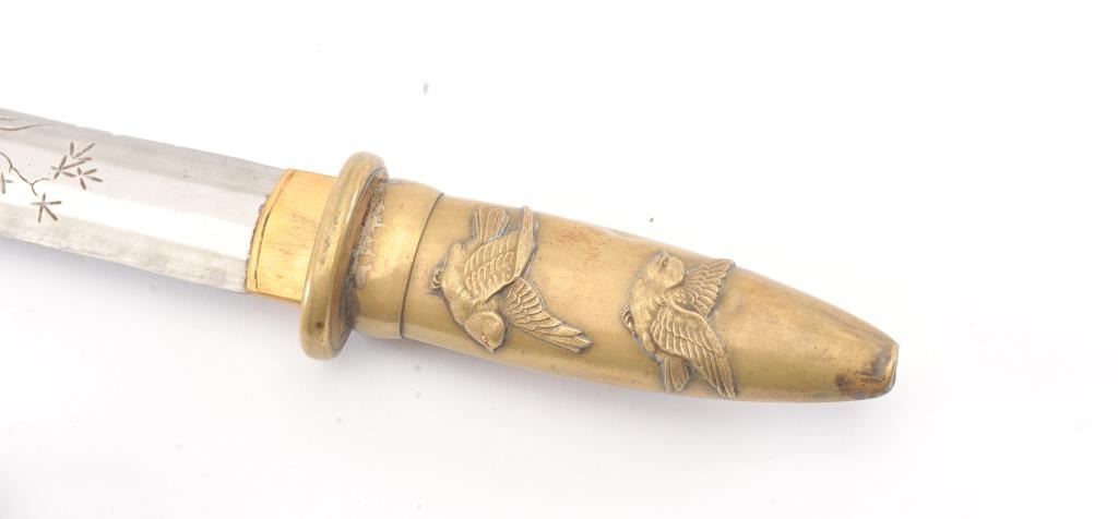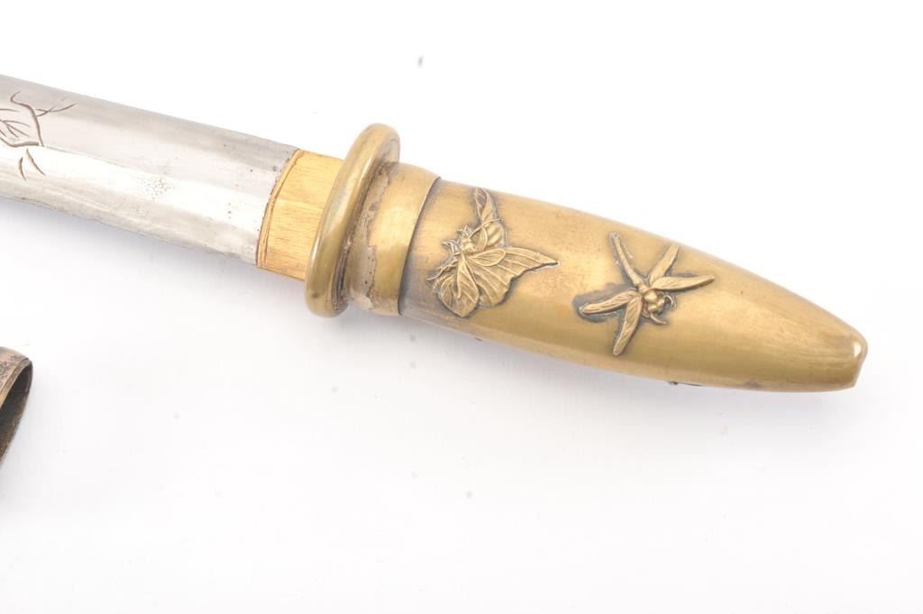 Japanese late 19th Century Tanto with ornate brass mounts, the type favored by doctors and merchants. The Tanto shows an engraved steel (non-laminated) blade with an overall length of 14” in very good condition. Est.: $175-350