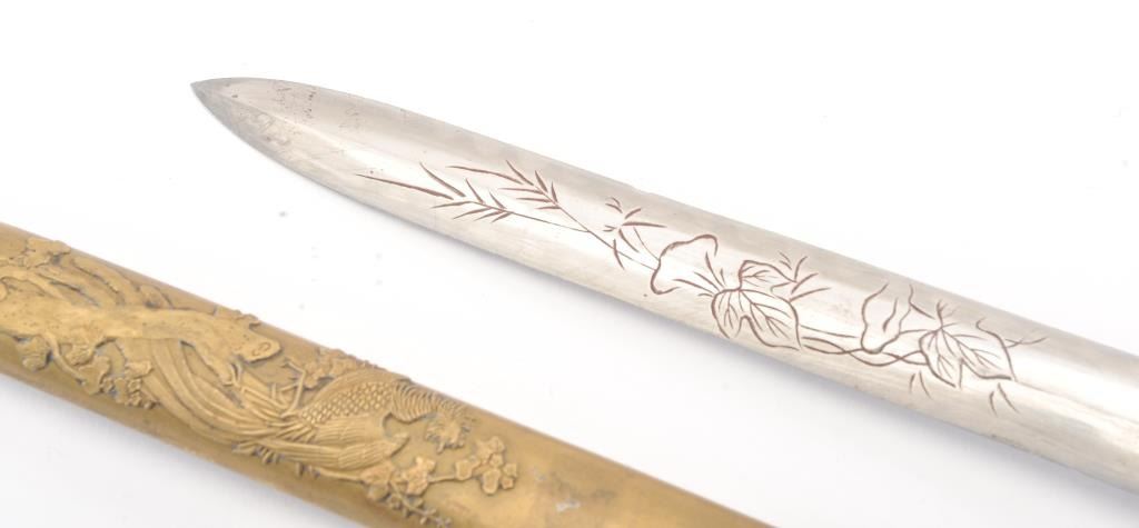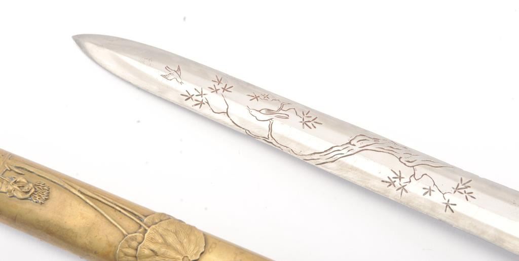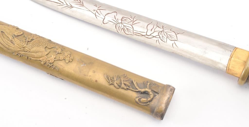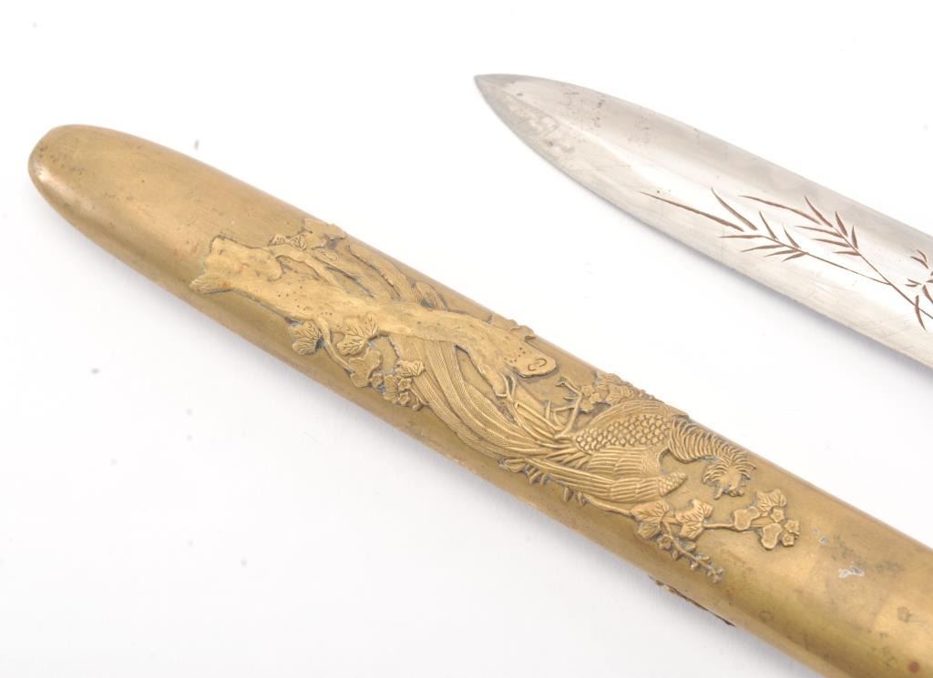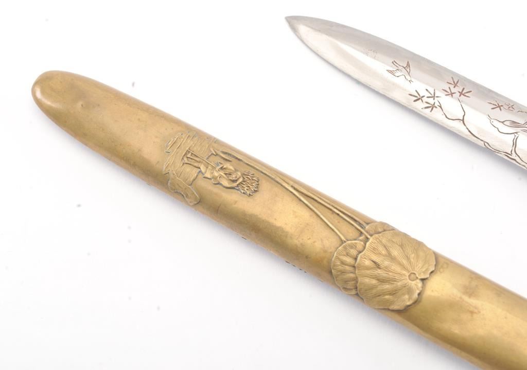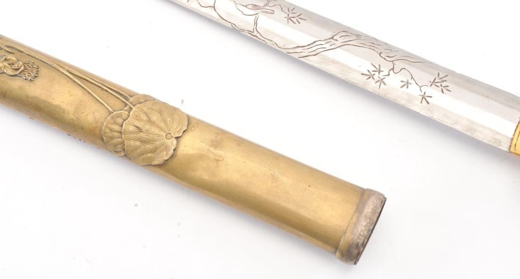 Japanese late 19th Century Tanto with ornate brass mounts, the type favored by doctors and merchants. The Tanto shows an engraved steel (non-laminated) blade with an overall length of 14” in very good condition. Est.: $175-350