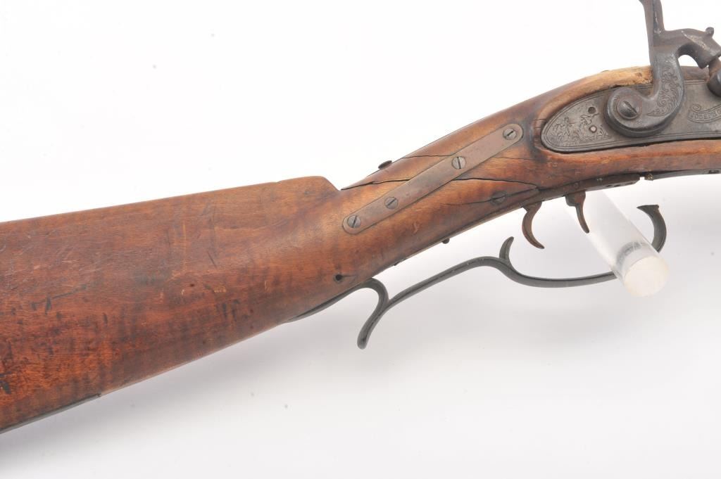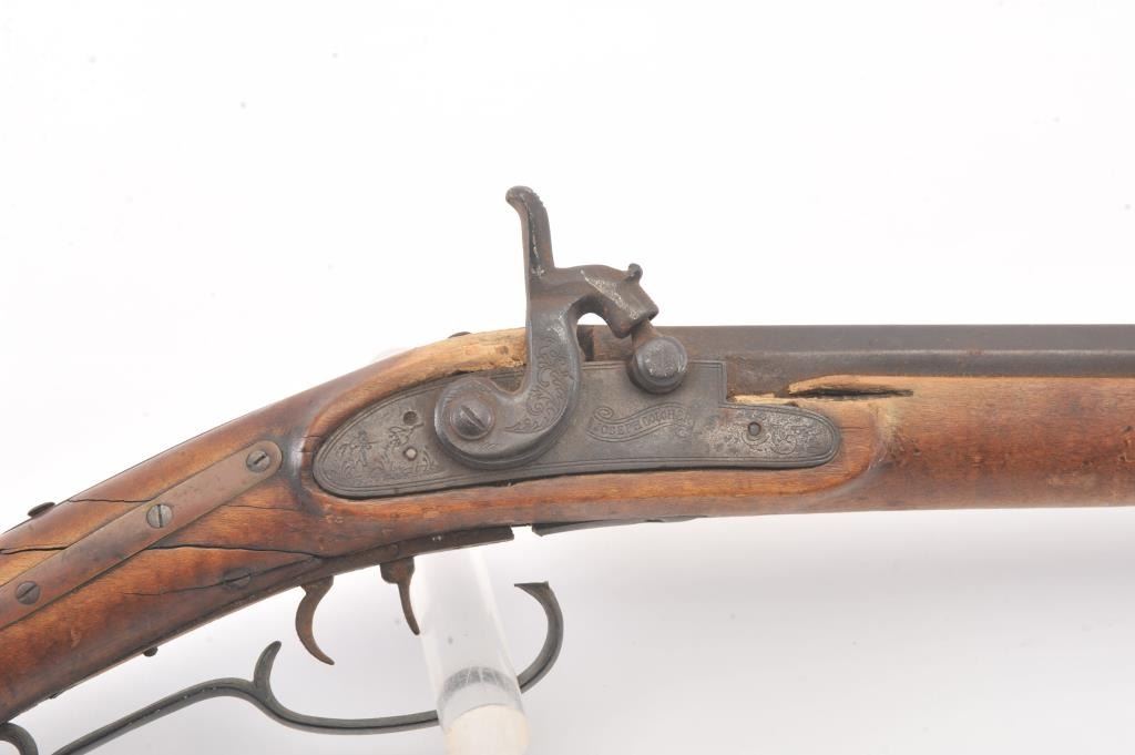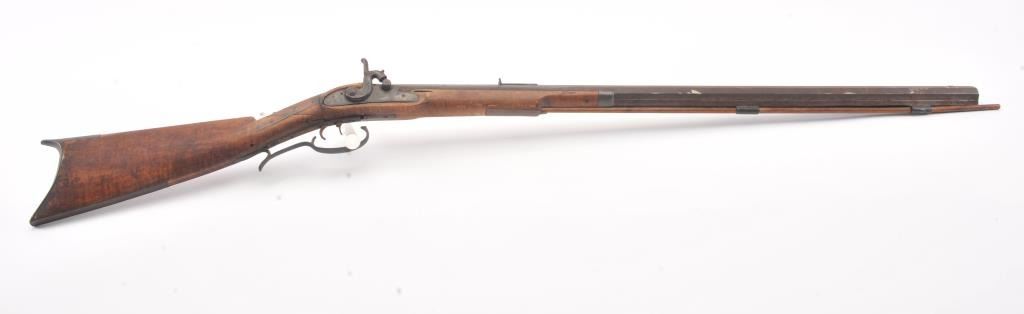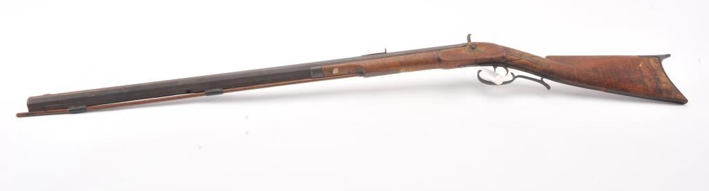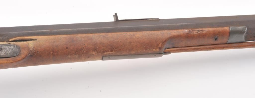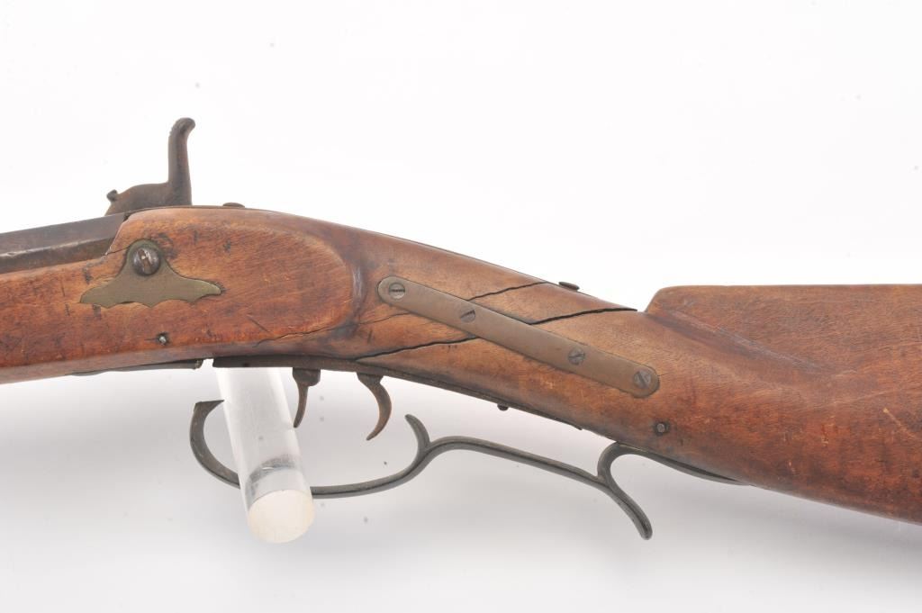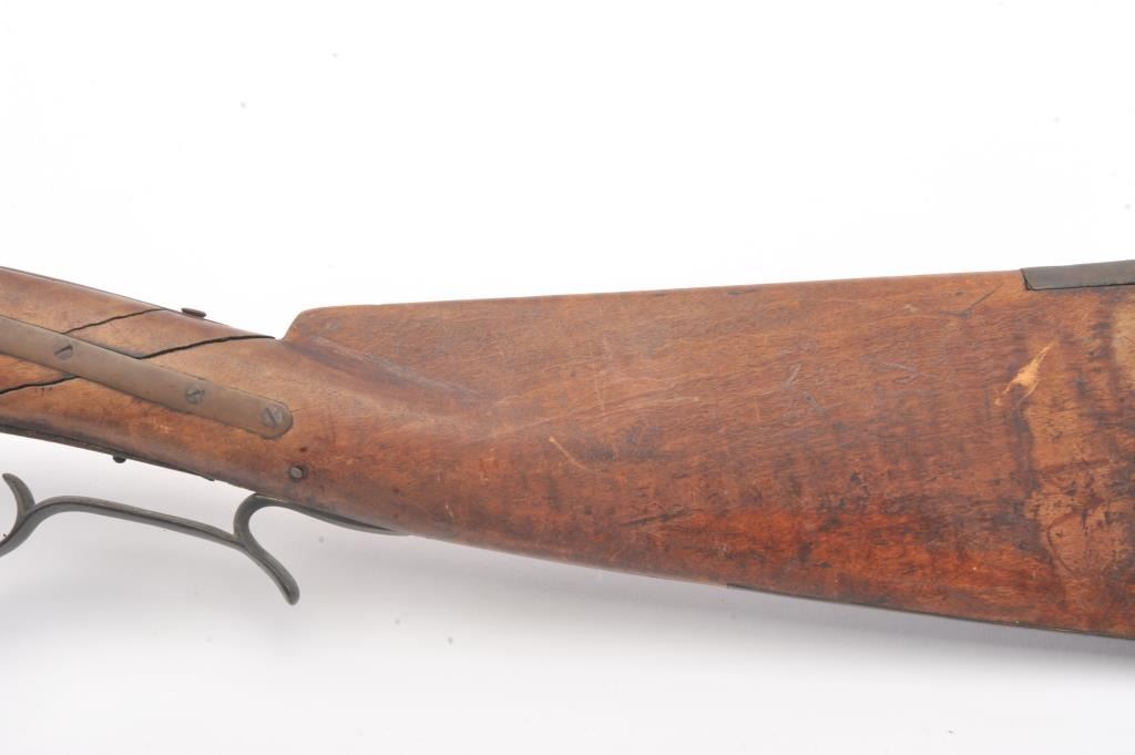 Half stocked percussion plains rifle, .38 cal., 33” octagon barrel, Golcher lock, double set triggers, in un-cleaned out-of-the-attic condition with a heavy dark patina to metal surfaces, dark bore, settriggers working at time of description, fair + stock with classic old repairs to wrist. (Antique). Est.: $100-200