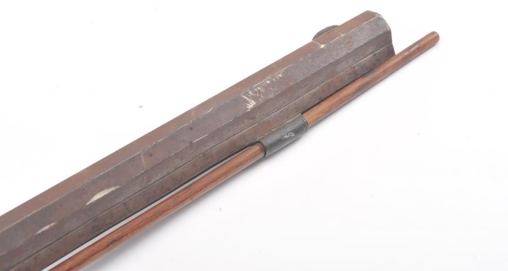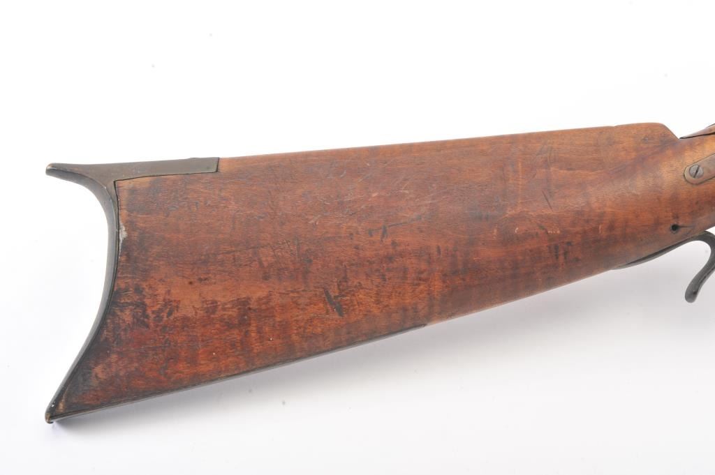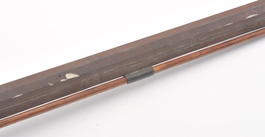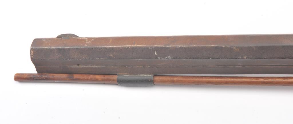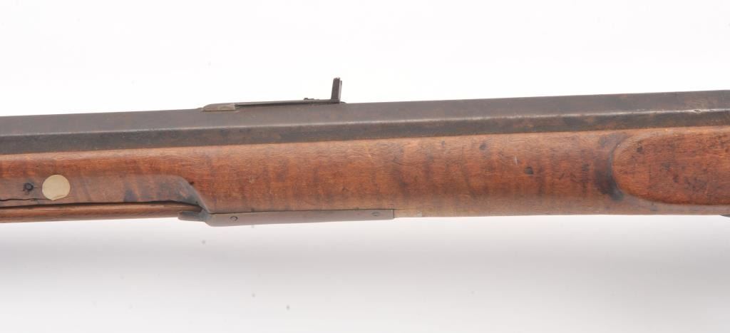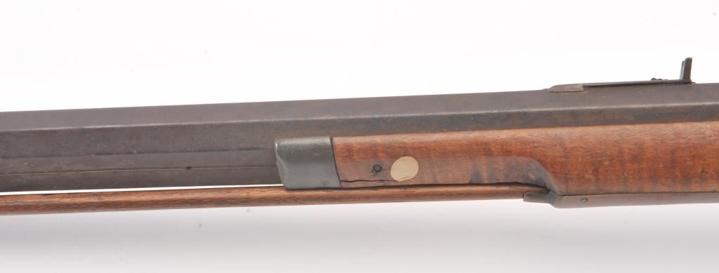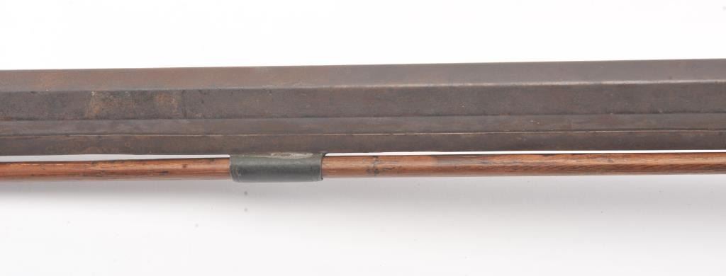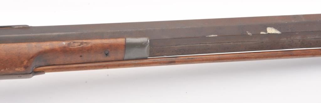Half stocked percussion plains rifle, .38 cal., 33” octagon barrel, Golcher lock, double set triggers, in un-cleaned out-of-the-attic condition with a heavy dark patina to metal surfaces, dark bore, settriggers working at time of description, fair + stock with classic old repairs to wrist. (Antique). Est.: $100-200