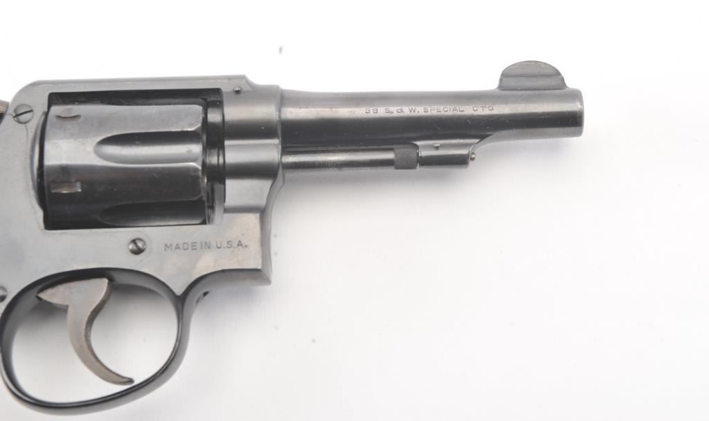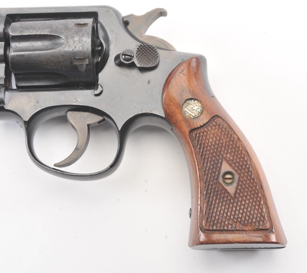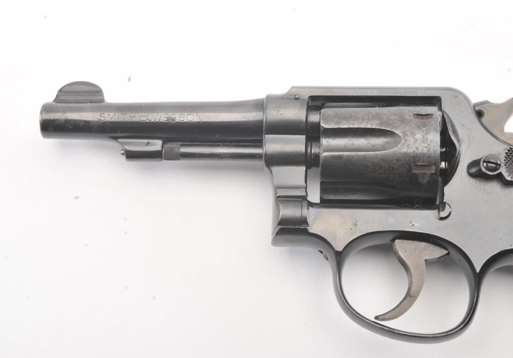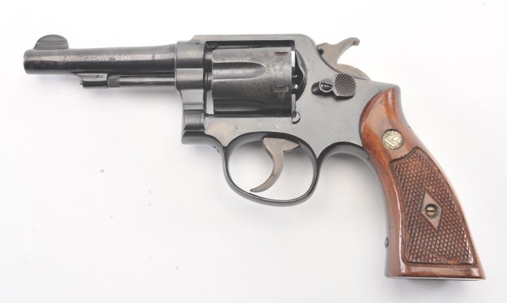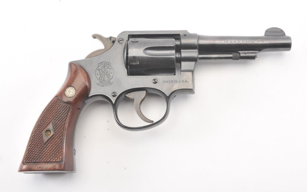 Smith & Wesson M & P DA revolver, .38 S&W caliber, Serial #977525. The pistol is in very good overall condition with a 4” barrel. The pistol retains the majority of the blue finish with areas of light surface rust,primarily on the left side due to poor storage. The hammer and trigger show vivid case hardening. The checkered wood medallion diamond grips are in very good condition with compressions, mars and some flatteningof the checkering. The bore is bright, action is crisp and the markings are sharp. Est.: $300-$600. (C+R/PPT).