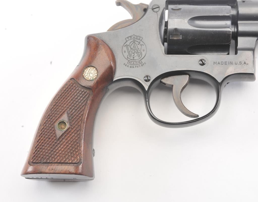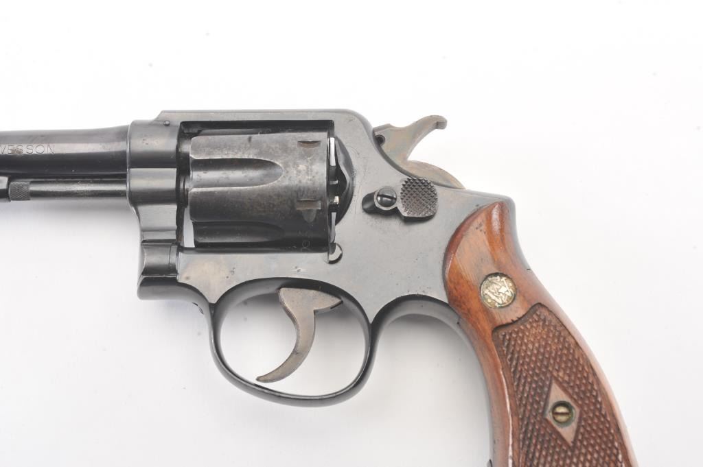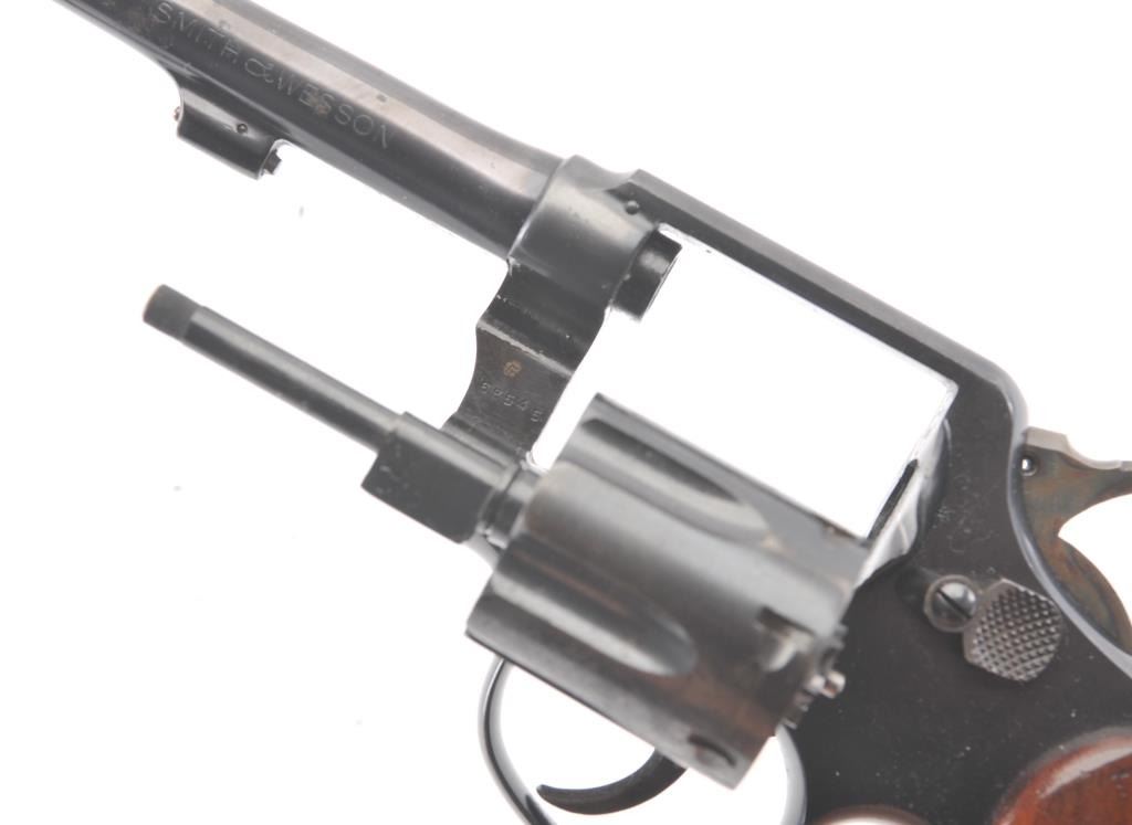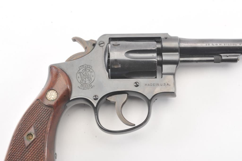 Smith & Wesson M & P DA revolver, .38 S&W caliber, Serial #977525. The pistol is in very good overall condition with a 4” barrel. The pistol retains the majority of the blue finish with areas of light surface rust,primarily on the left side due to poor storage. The hammer and trigger show vivid case hardening. The checkered wood medallion diamond grips are in very good condition with compressions, mars and some flatteningof the checkering. The bore is bright, action is crisp and the markings are sharp. Est.: $300-$600. (C+R/PPT).
