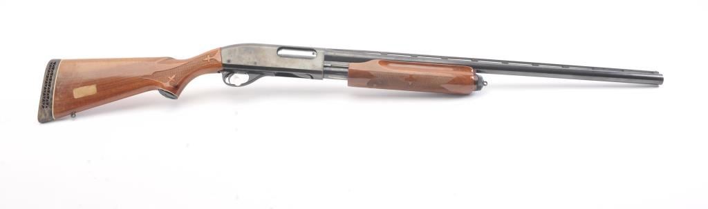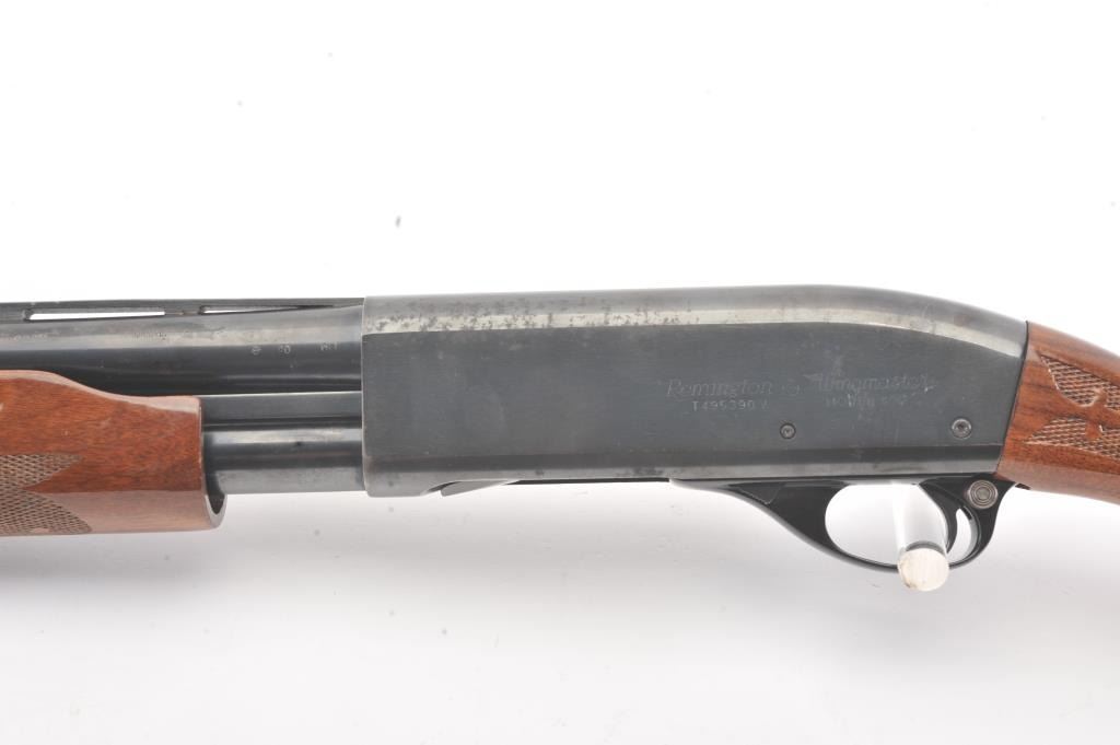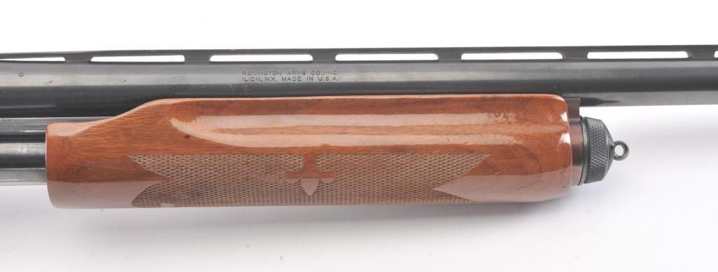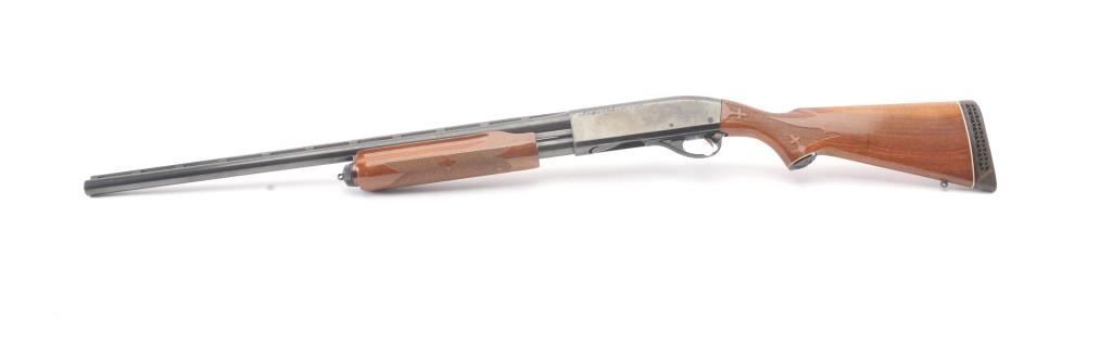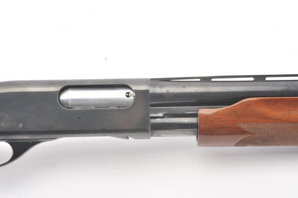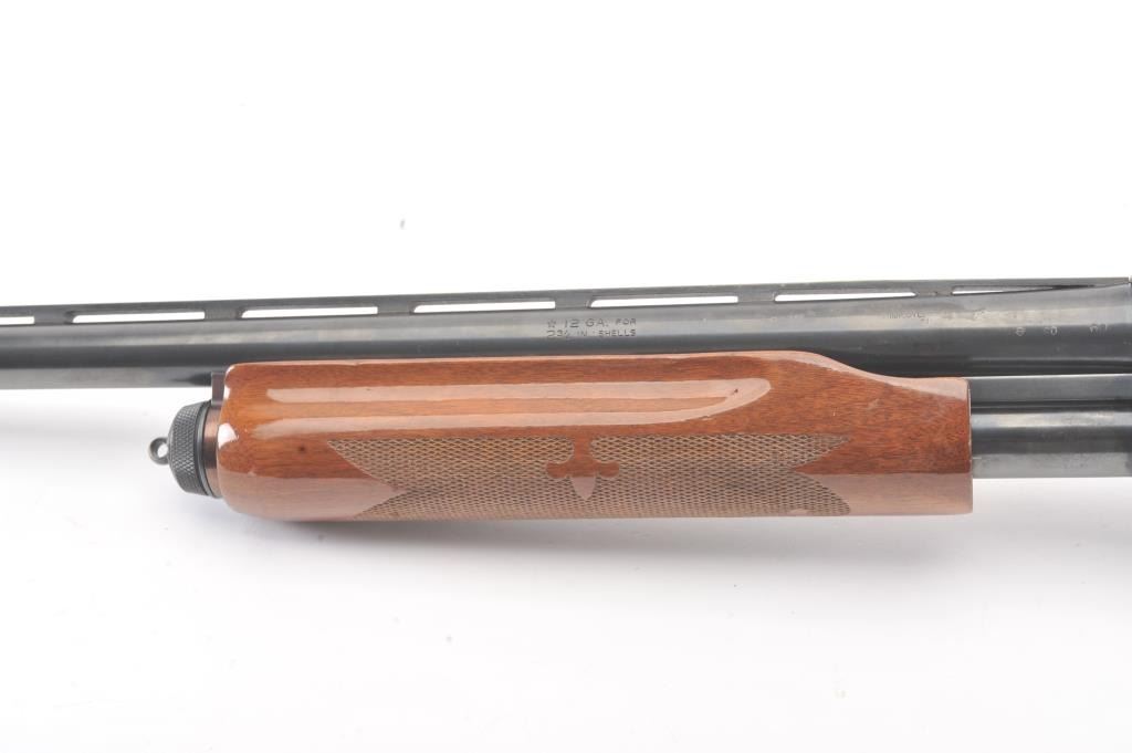 Remington Model 870 Wing Master pump shotgun, 12 gauge, Serial #T495390V. The shotgun is in very good overall condition with a 28” barrel with a full-length ventilated rib with a steel bead front sight. The shotgunretains the majority of the blue finish with mars on the barrel and areas of light surface rust on the receiver. The shotgun is choked Improved Cylinder and chambered for 2 ¾” shells. The checkered wood stock is in goodcondition with small mars and compressions consistent with field use. The butt stock ends with a ventilated rubber recoil pad providing a 14” LOP. The bore is good and the action is crisp. Est.: $175-$350.(Modern).