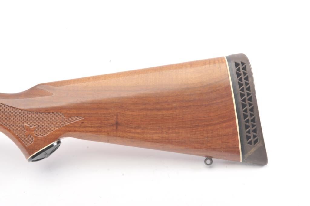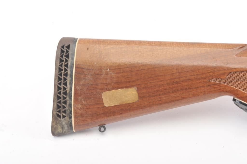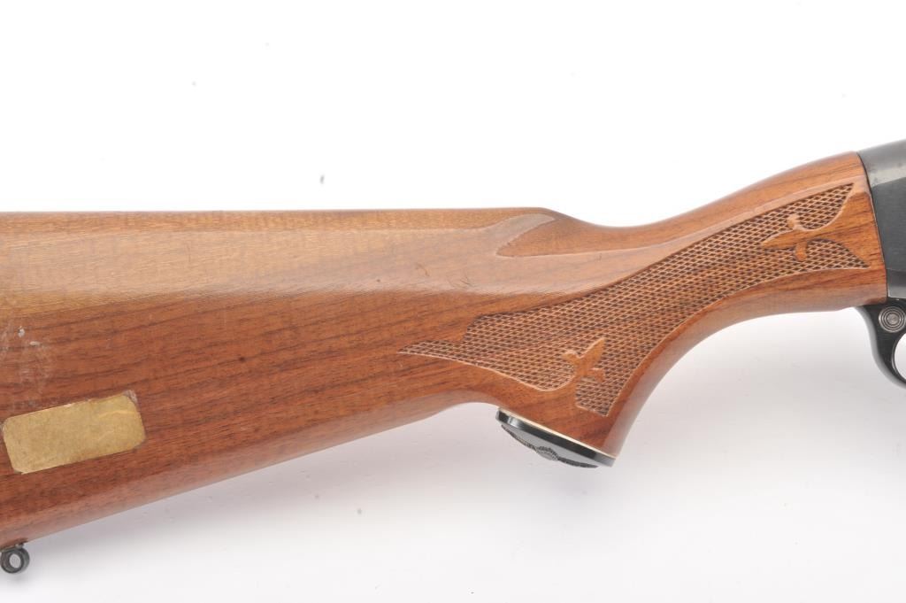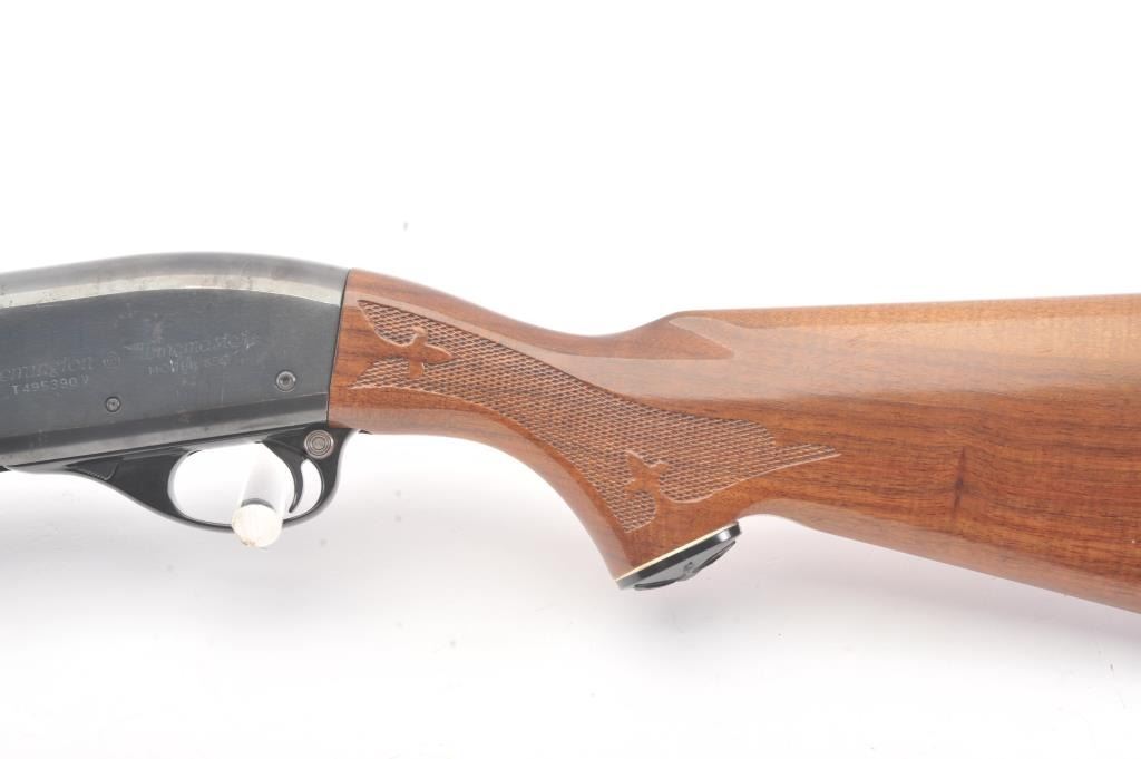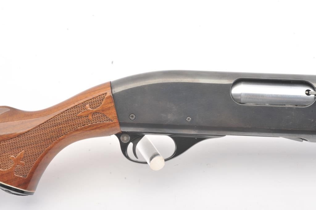 Remington Model 870 Wing Master pump shotgun, 12 gauge, Serial #T495390V. The shotgun is in very good overall condition with a 28” barrel with a full-length ventilated rib with a steel bead front sight. The shotgunretains the majority of the blue finish with mars on the barrel and areas of light surface rust on the receiver. The shotgun is choked Improved Cylinder and chambered for 2 ¾” shells. The checkered wood stock is in goodcondition with small mars and compressions consistent with field use. The butt stock ends with a ventilated rubber recoil pad providing a 14” LOP. The bore is good and the action is crisp. Est.: $175-$350.(Modern).