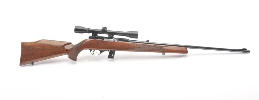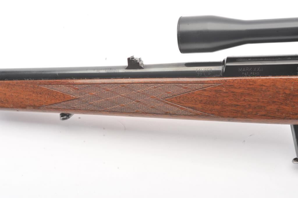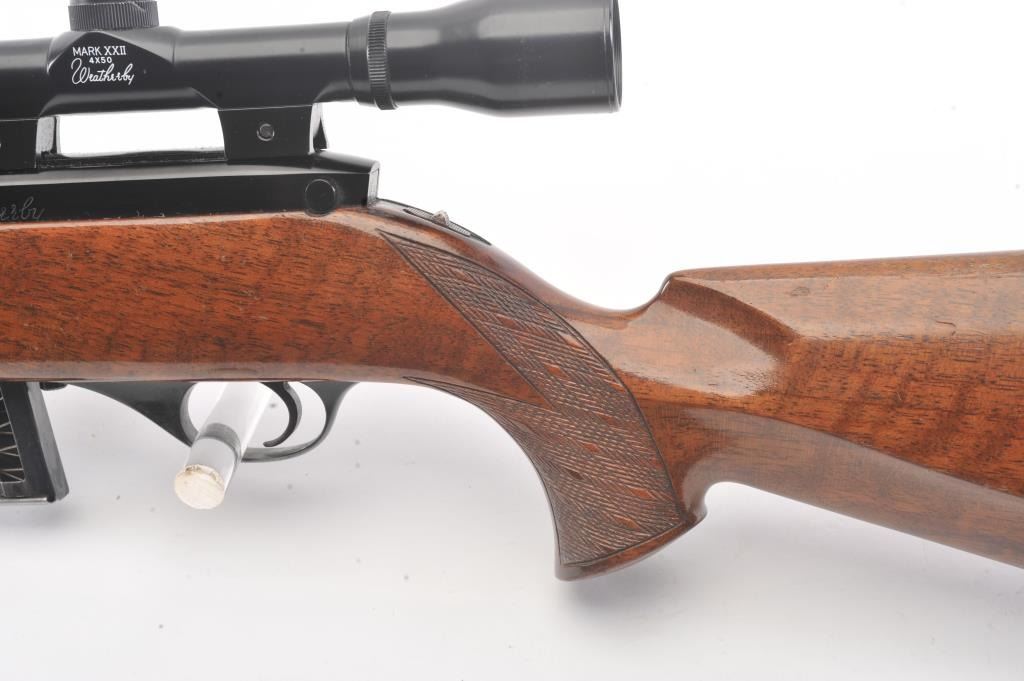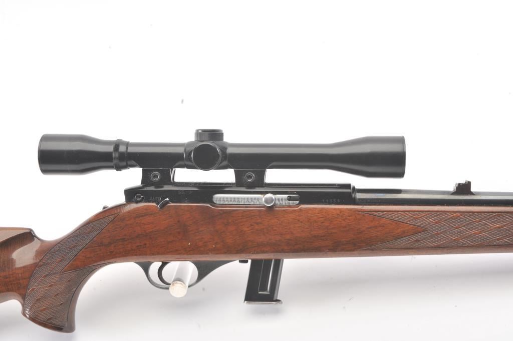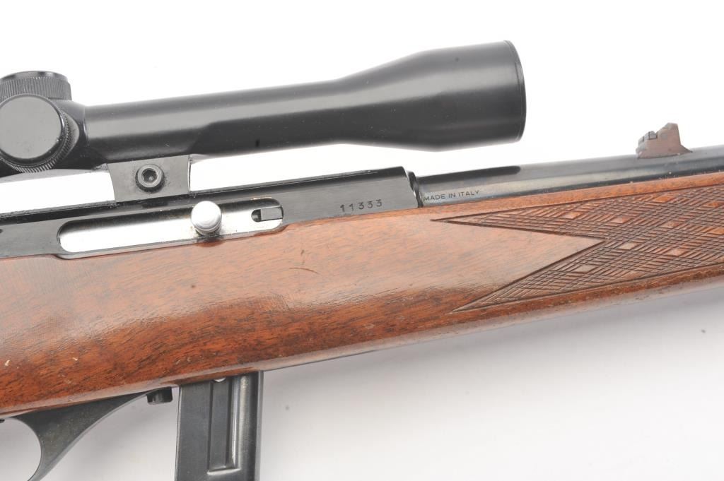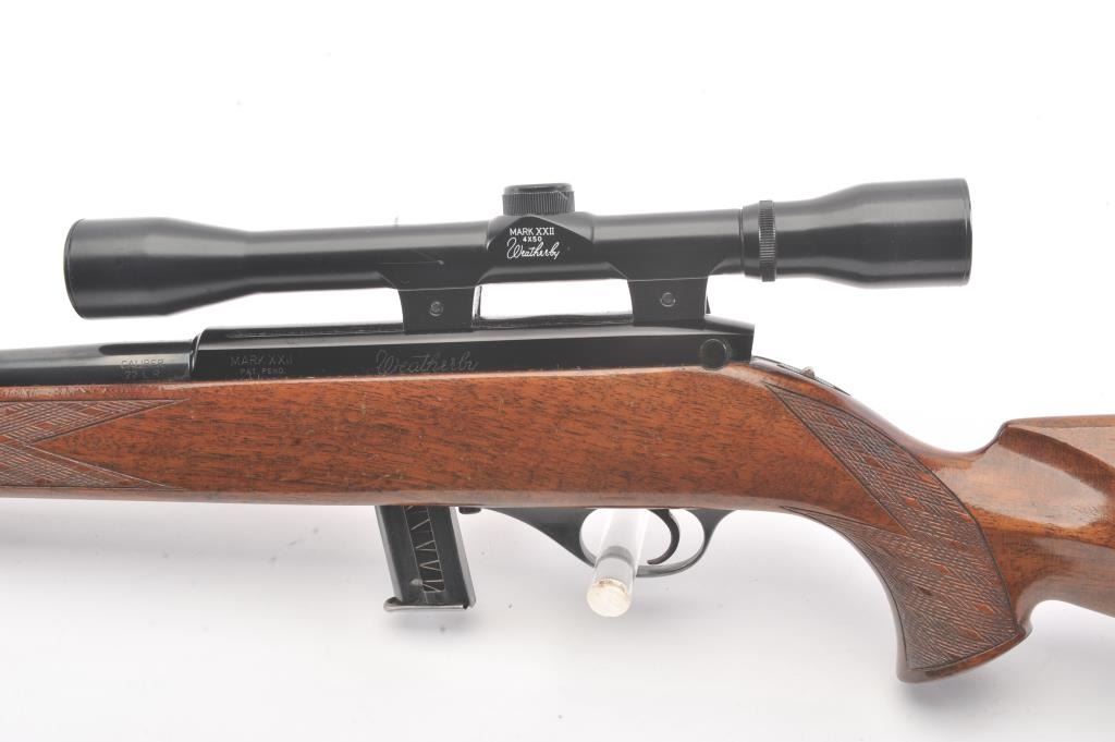 Weatherby Mark XXII semi-automatic rifle, .22 L.R. caliber, Serial #11333. The rifle is in fine overall condition with a 24” barrel with a ramped blade front and two-leaf folding rear sights. The rifle retainsnearly all of the blue finish with handling marks, light wear at the muzzle and is marked, “MADE IN ITALY”. The finely checkered stock is in good condition with small mars, compressions and a checkeredsteel butt plate. The bore is good, the action is crisp and the markings are sharp. The rifle is topped with a Weatherby Mark XXII fixed 4x scope with clear crisp optics. The lot includes one correct magazine.Est.: $300-$600. (Modern).