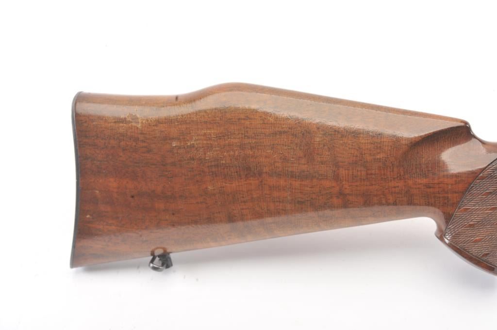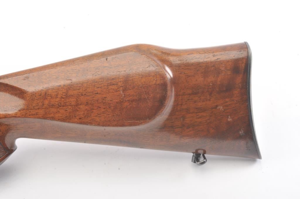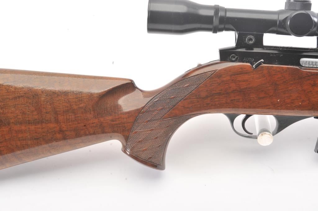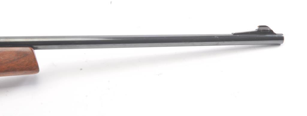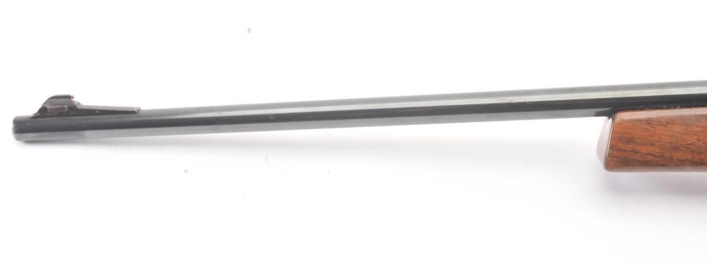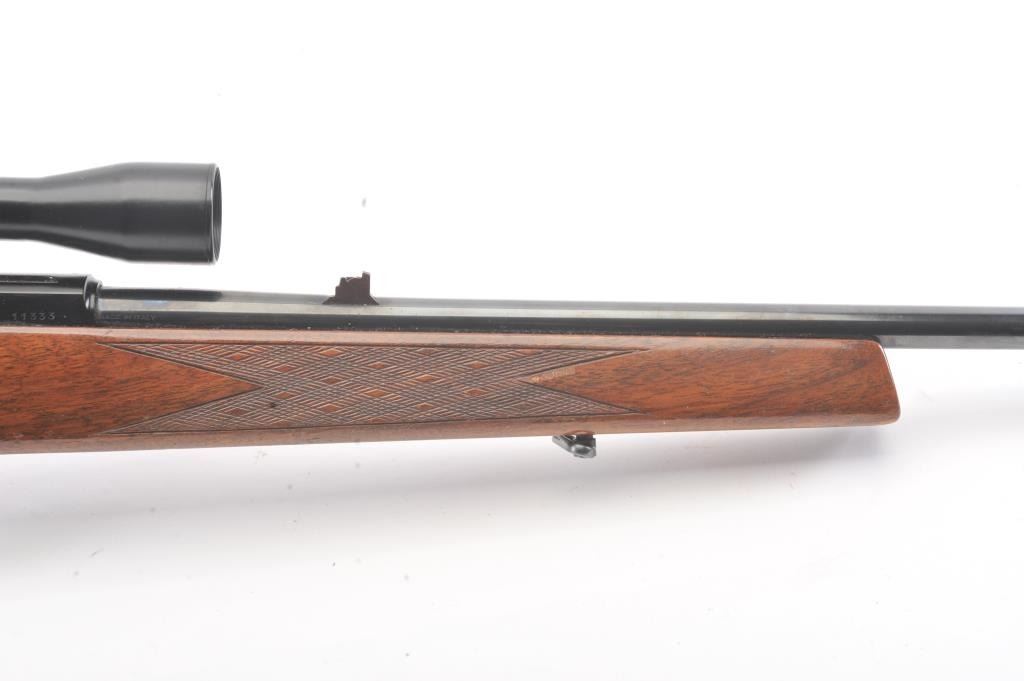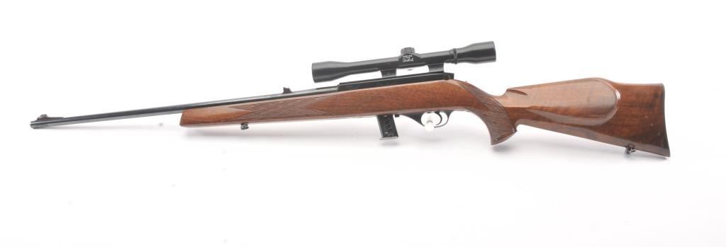 Weatherby Mark XXII semi-automatic rifle, .22 L.R. caliber, Serial #11333. The rifle is in fine overall condition with a 24” barrel with a ramped blade front and two-leaf folding rear sights. The rifle retainsnearly all of the blue finish with handling marks, light wear at the muzzle and is marked, “MADE IN ITALY”. The finely checkered stock is in good condition with small mars, compressions and a checkeredsteel butt plate. The bore is good, the action is crisp and the markings are sharp. The rifle is topped with a Weatherby Mark XXII fixed 4x scope with clear crisp optics. The lot includes one correct magazine.Est.: $300-$600. (Modern).