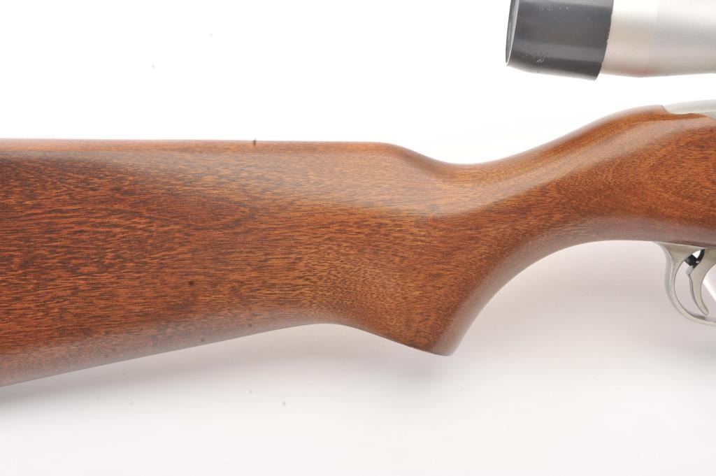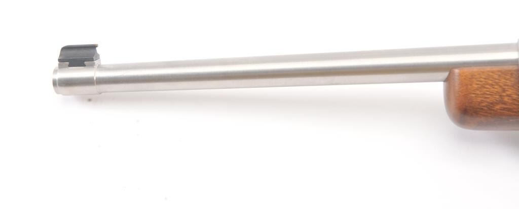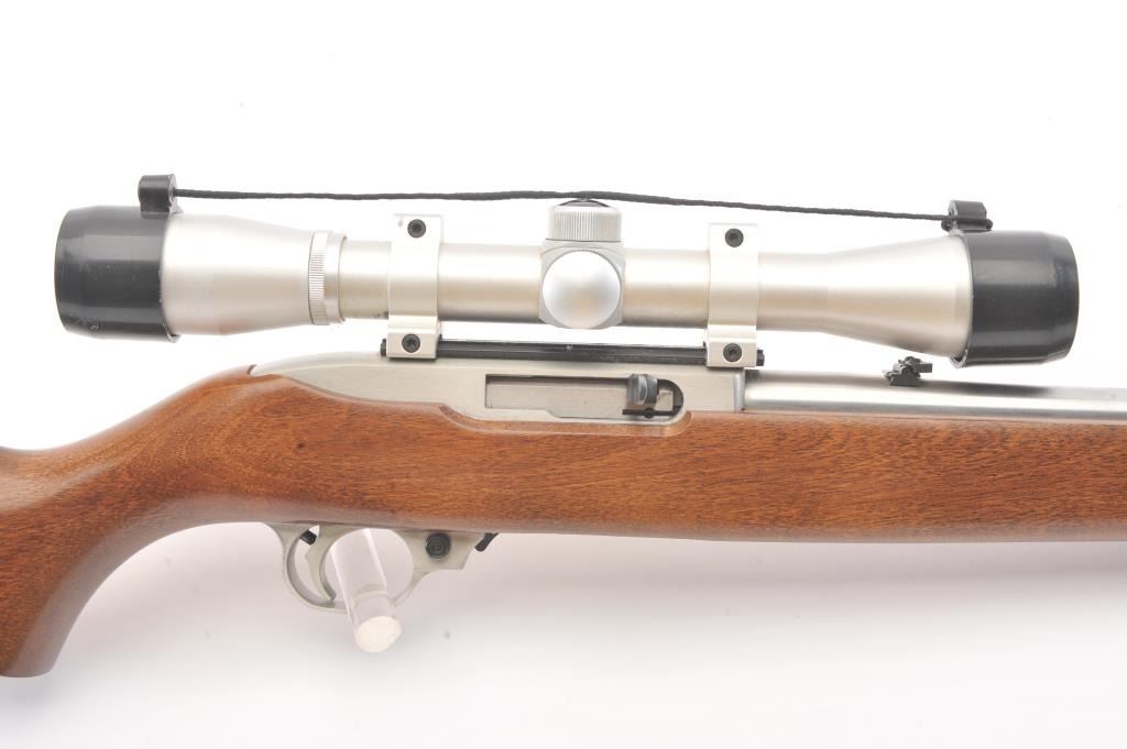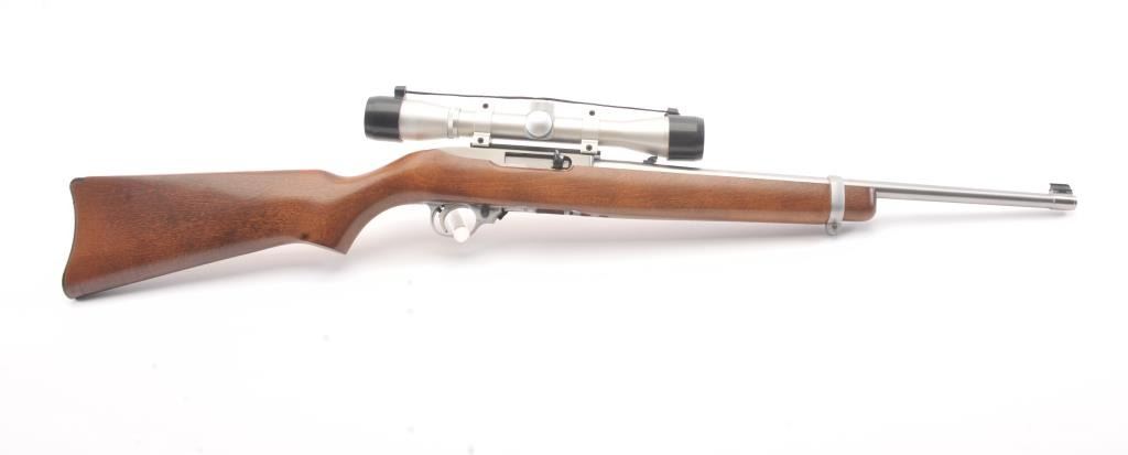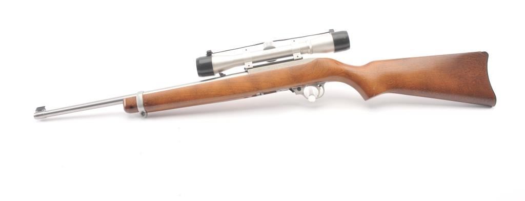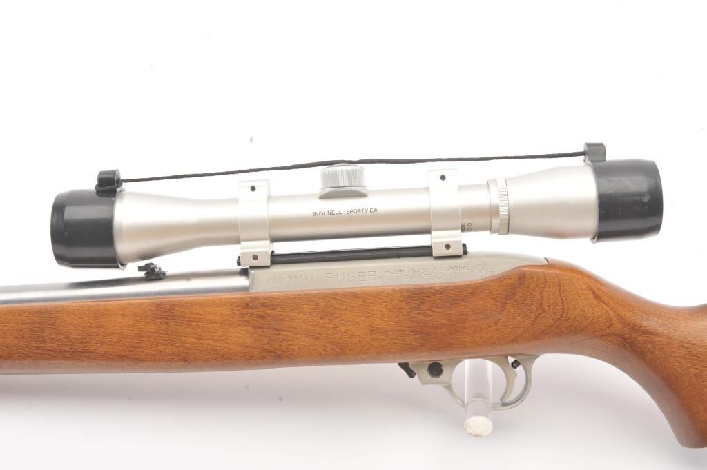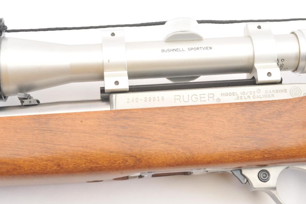 Ruger Model 10-22 semi-automatic carbine, .22 Long Rifle caliber, Serial #240-39918. The carbine is in as new condition with an 18” barrel. The carbine retains nearly all of the matte stainless steel finish with lighthandling marks. The smooth wood stock is in excellent condition showing little use. The rifle is topped with a matte stainless Bushnell Sport View fixed 4X scope. The bore is good, the action is crisp and themarkings are sharp on this lightly used 10-22. The lot includes one correct Ruger marked magazine. Est.: $250-$500. (Modern).