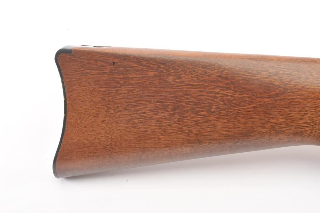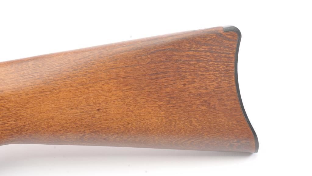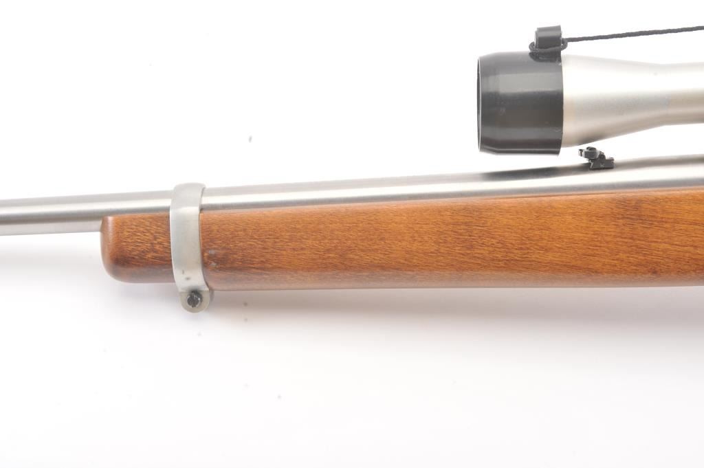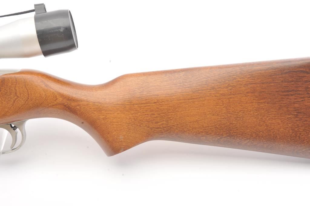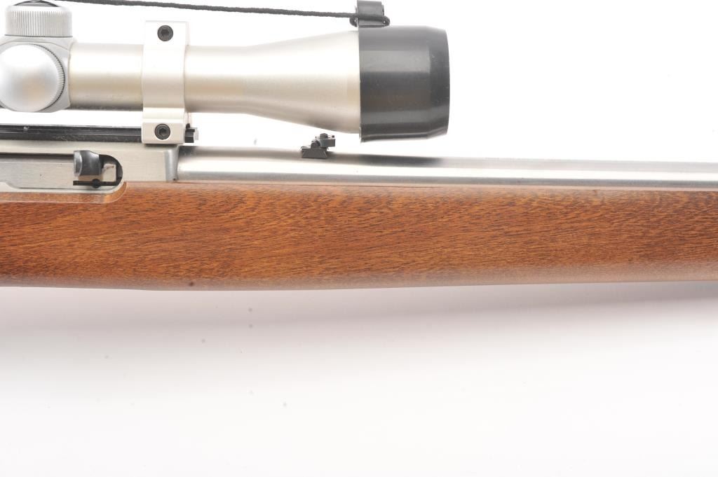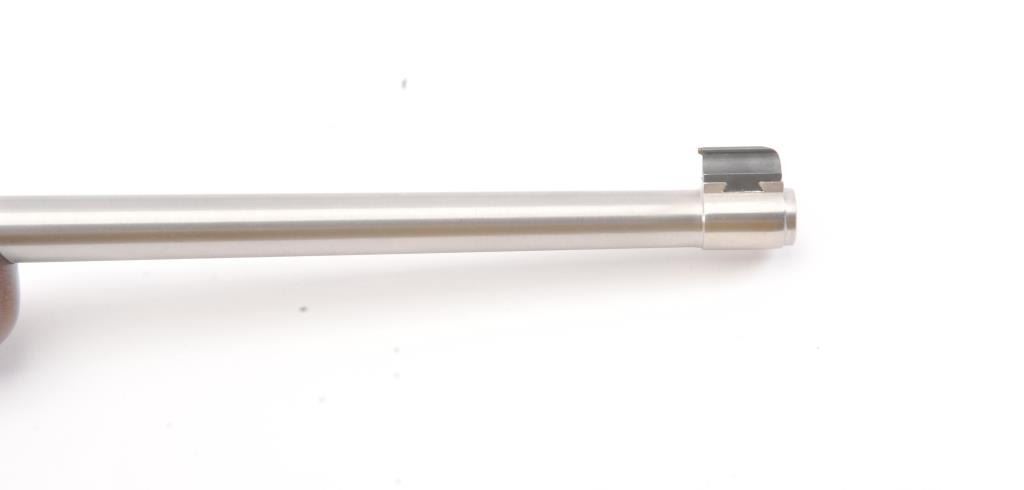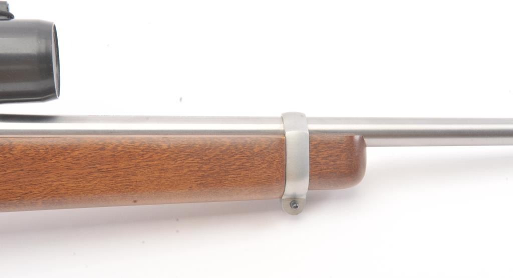 Ruger Model 10-22 semi-automatic carbine, .22 Long Rifle caliber, Serial #240-39918. The carbine is in as new condition with an 18” barrel. The carbine retains nearly all of the matte stainless steel finish with lighthandling marks. The smooth wood stock is in excellent condition showing little use. The rifle is topped with a matte stainless Bushnell Sport View fixed 4X scope. The bore is good, the action is crisp and themarkings are sharp on this lightly used 10-22. The lot includes one correct Ruger marked magazine. Est.: $250-$500. (Modern).