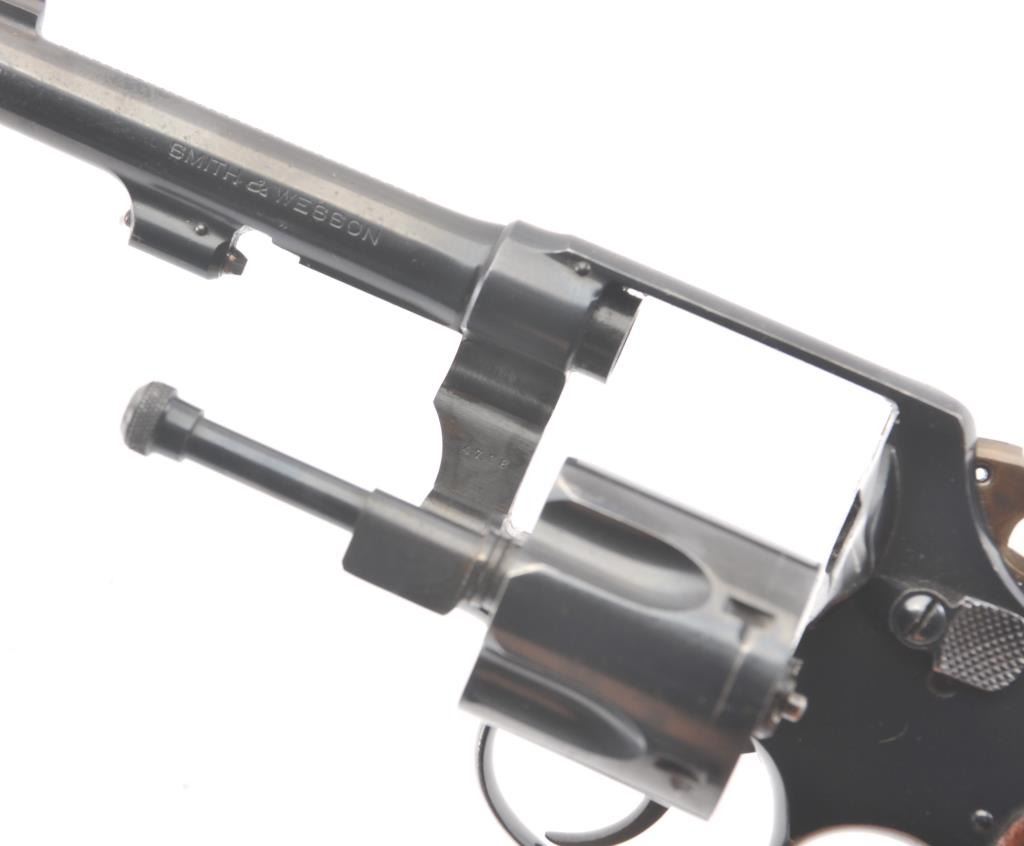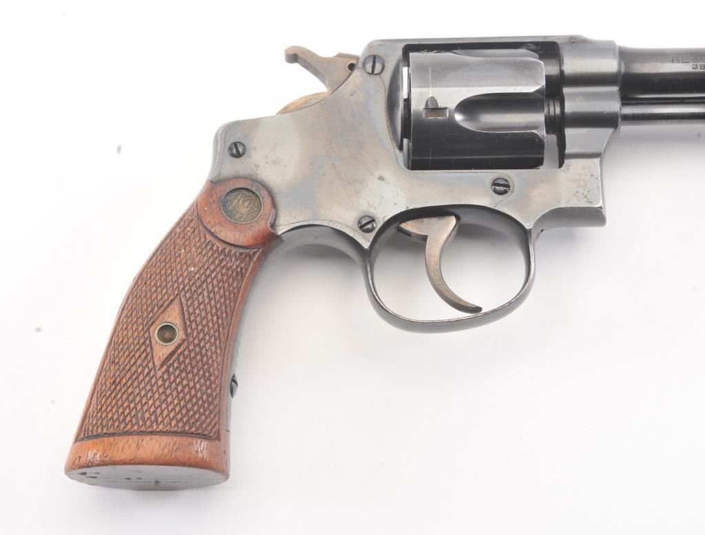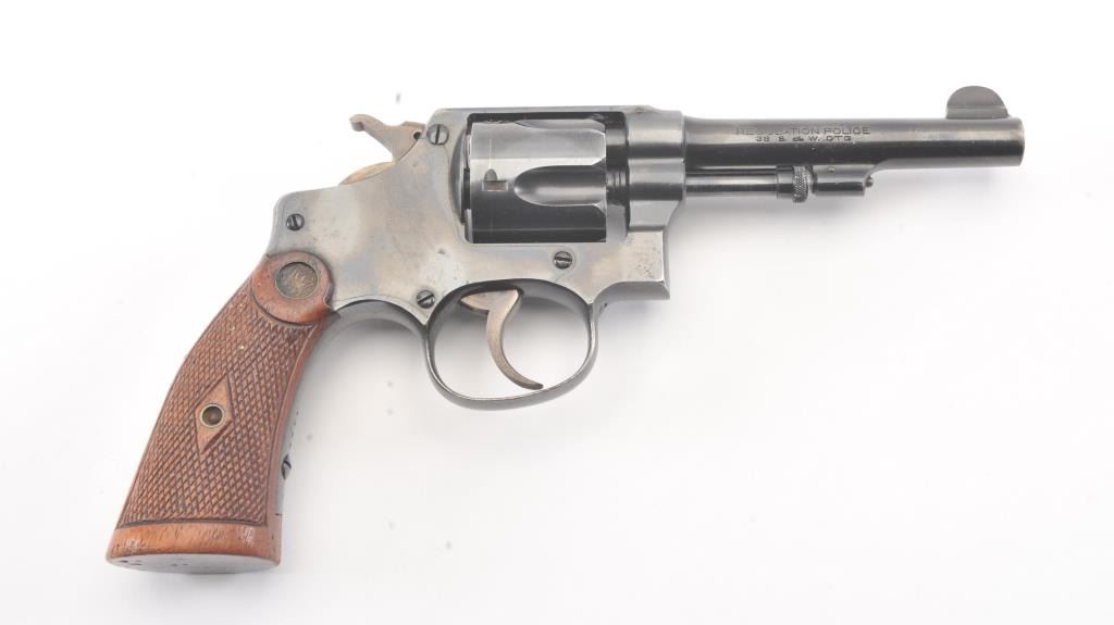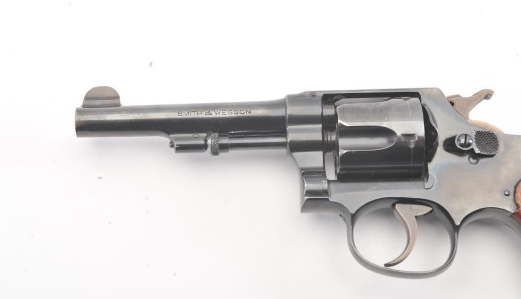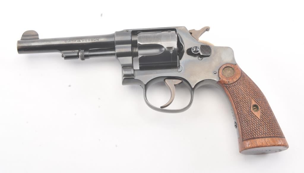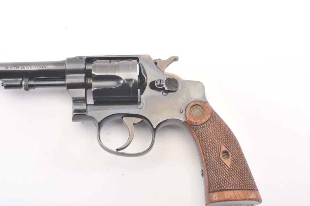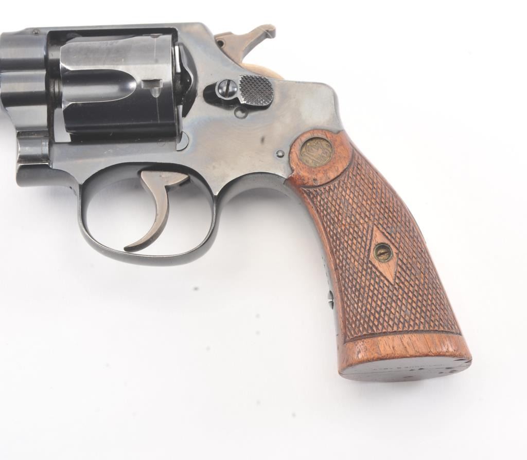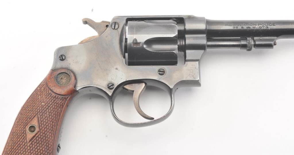 Smith & Wesson Regulation Police DA revolver, .38 S&W caliber, Serial #2971. The pistol is in fine overall condition with a 4” barrel. The pistol retains approximately 94%-96% of the blue finish with lightscratches and wear at the muzzle. The hammer and trigger show nice muted case hardening. The checkered wood medallion diamond grips are in very good condition with compressions and some flattening of the checkering. Thebore is bright, action is crisp and the markings are sharp. Est.: $250-$500. (C+R/PPT).