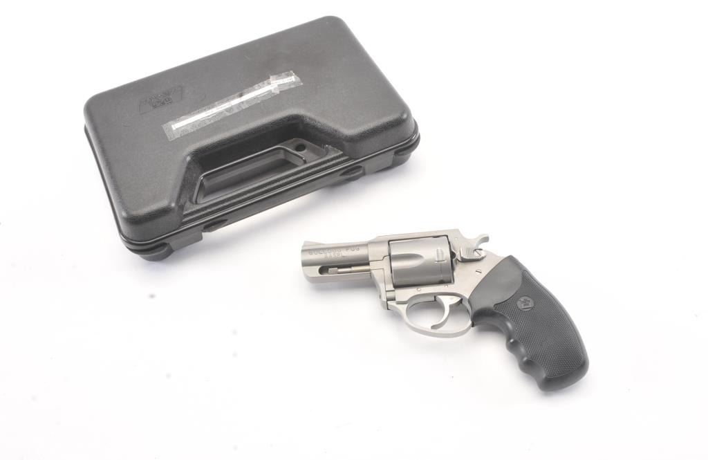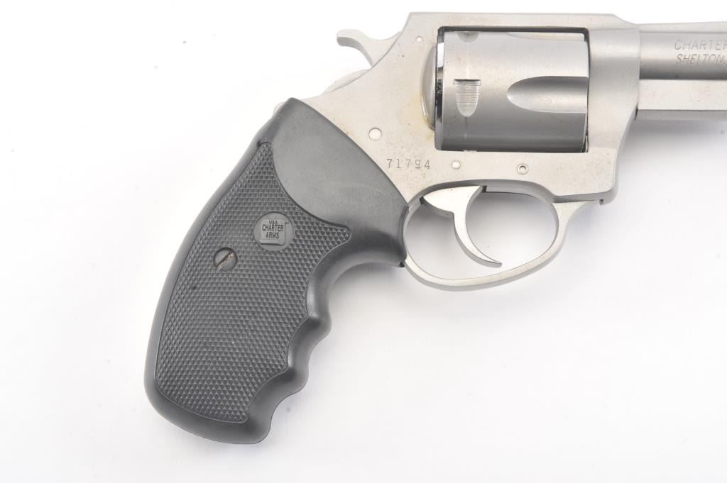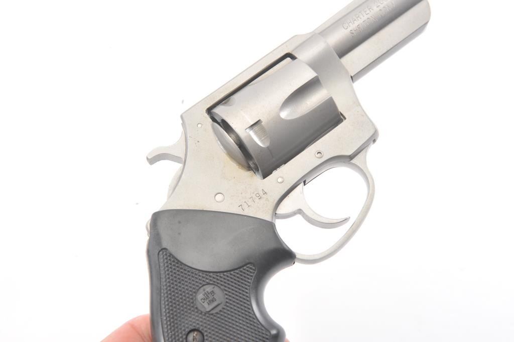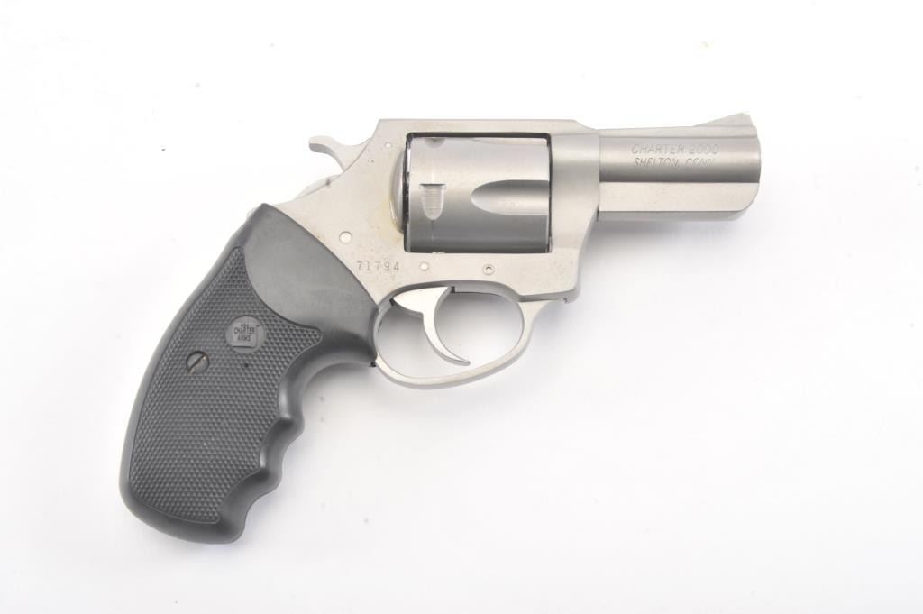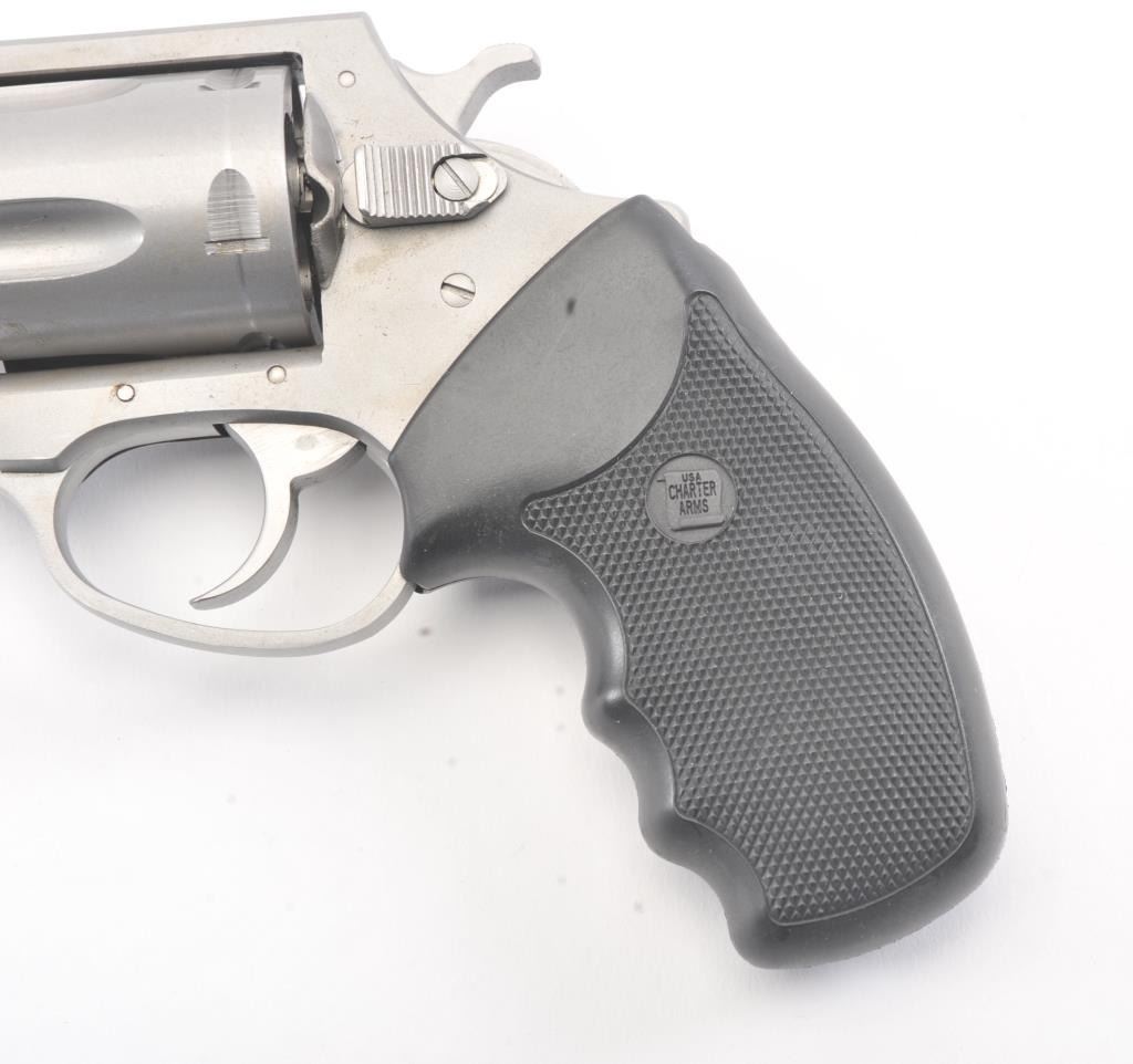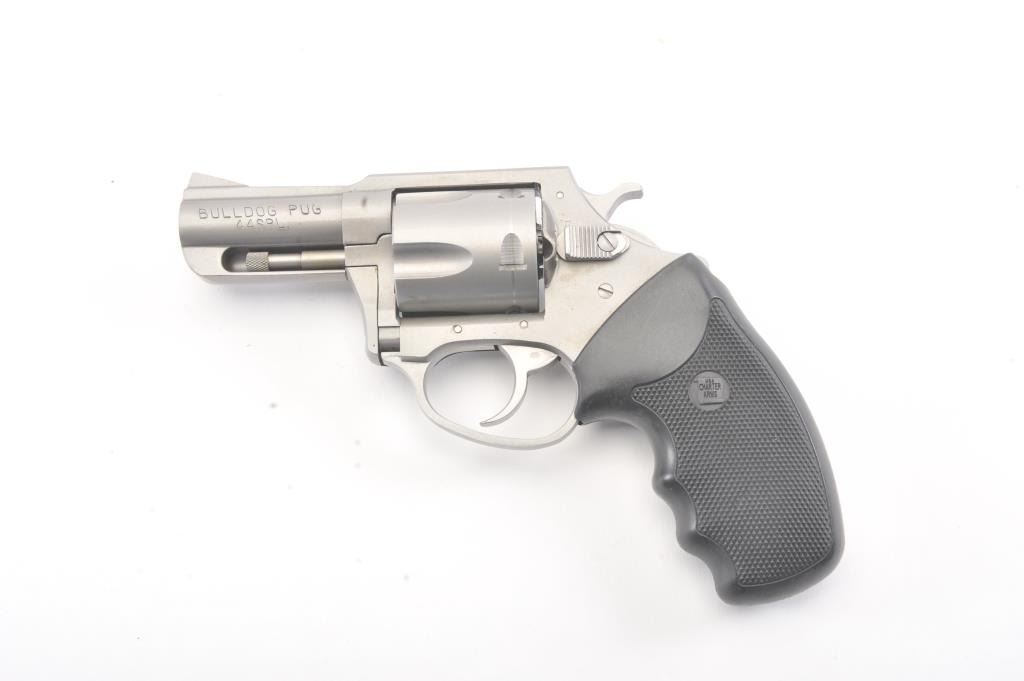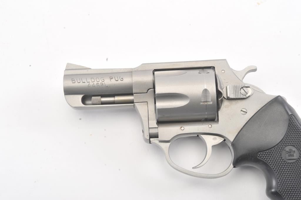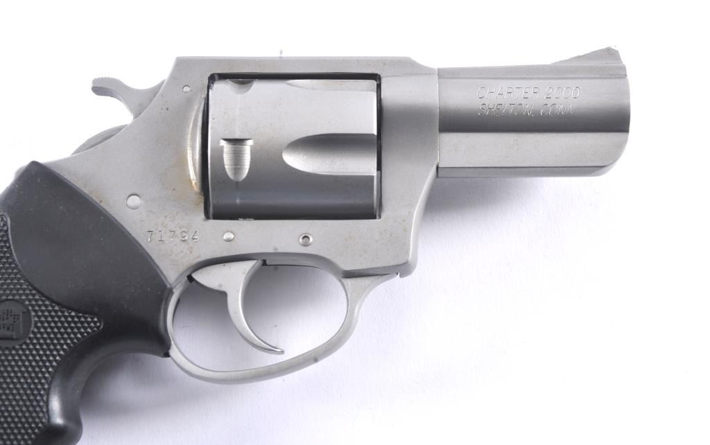 Charter 2000 Bulldog Pup revolver, .44 Special caliber, Serial #71794. The pistol is in fine overall condition with a 2 ½” barrel. The pistol retains approximately 96%-98% of the matte stainless steel finishwith a light index mark on the cylinder. The checkered rubber grips are in very good condition showing little use. The bore is good, the action is crisp and the markings are sharp. The pistol comes in the factoryplastic hard case. Est.: $175-$350. (Modern/PPT).
