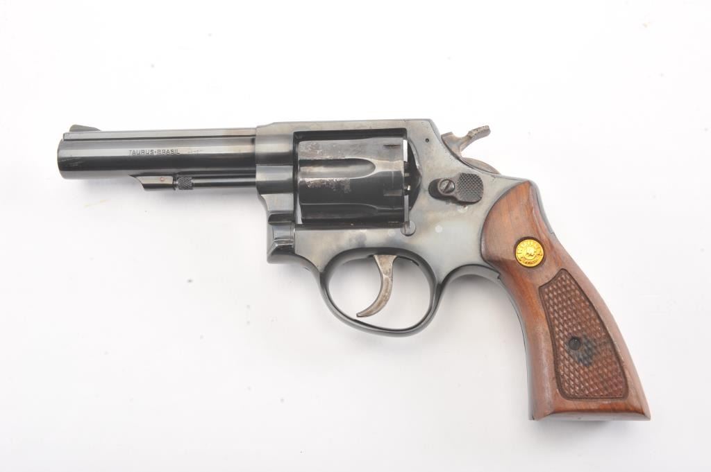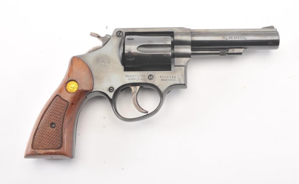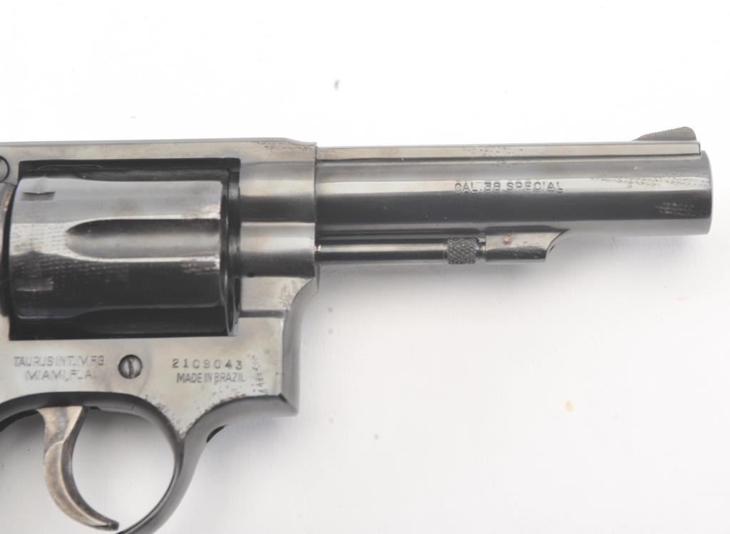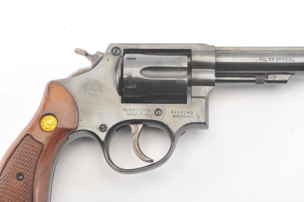 Taurus DA revolver, .38 Special caliber, Serial #2109043. The pistol is in good overall condition with a 4” barrel with a milled top. The pistol retains a significant amount of blue finish with wear at themuzzle and moderate surface erosion on the cylinder. The hammer and trigger show nice color case hardening. The checkered wood medallion grips are in very good condition. The bore is good, the action is crisp and the markings are sharp. Est.: $150-$300. (Modern/PPT).
