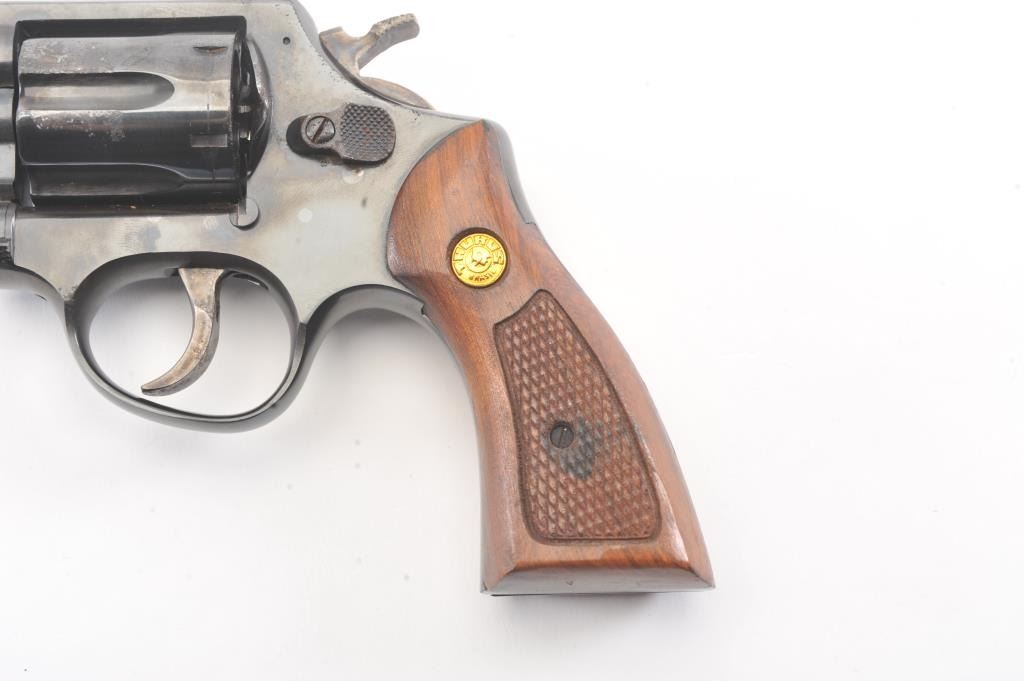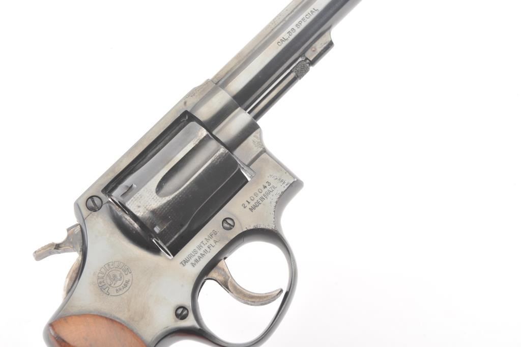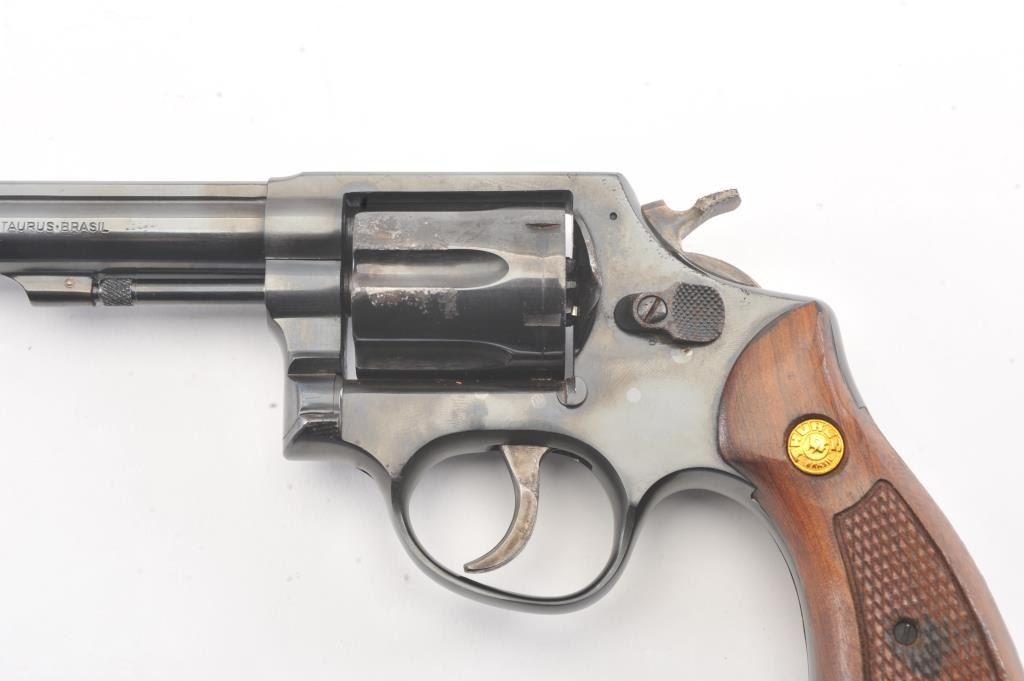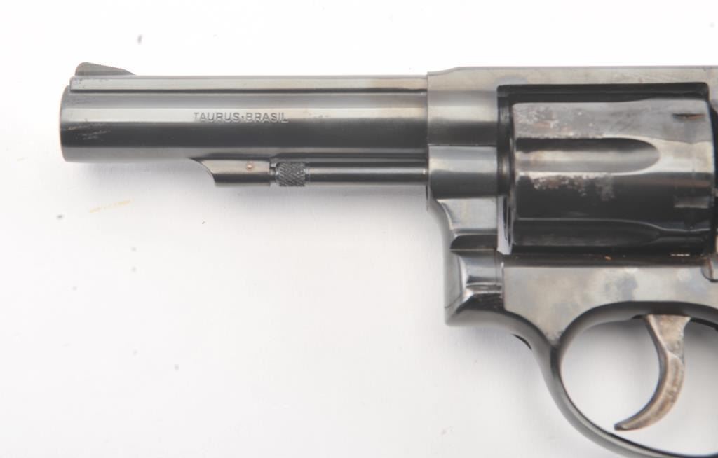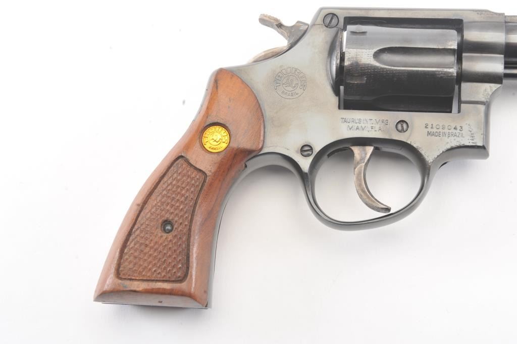 Taurus DA revolver, .38 Special caliber, Serial #2109043. The pistol is in good overall condition with a 4” barrel with a milled top. The pistol retains a significant amount of blue finish with wear at themuzzle and moderate surface erosion on the cylinder. The hammer and trigger show nice color case hardening. The checkered wood medallion grips are in very good condition. The bore is good, the action is crisp and the markings are sharp. Est.: $150-$300. (Modern/PPT).