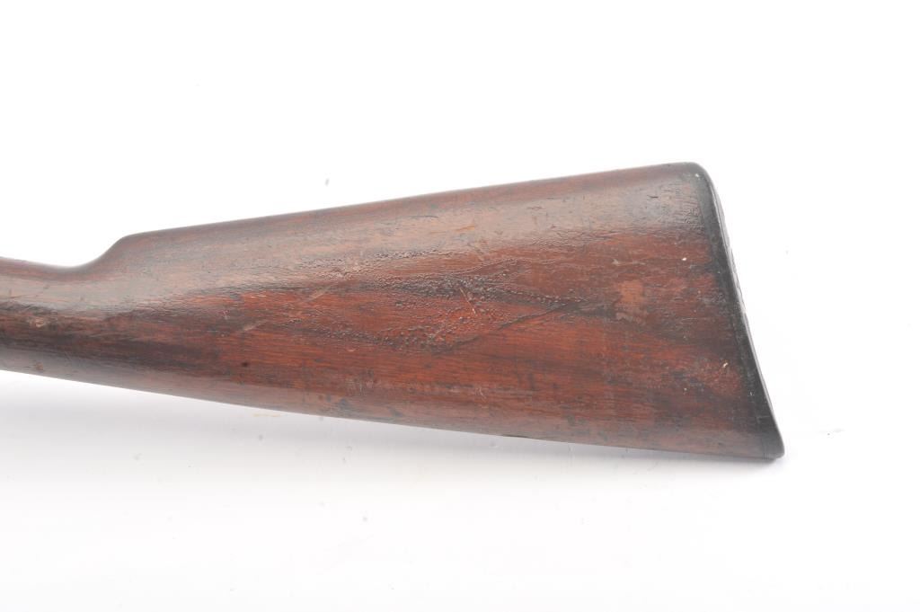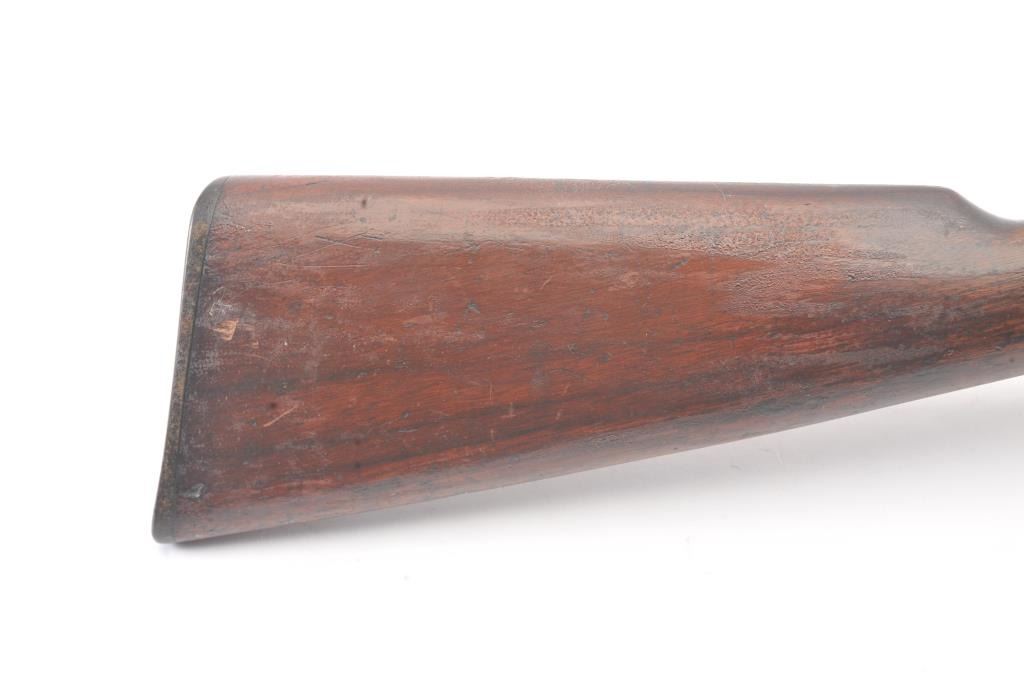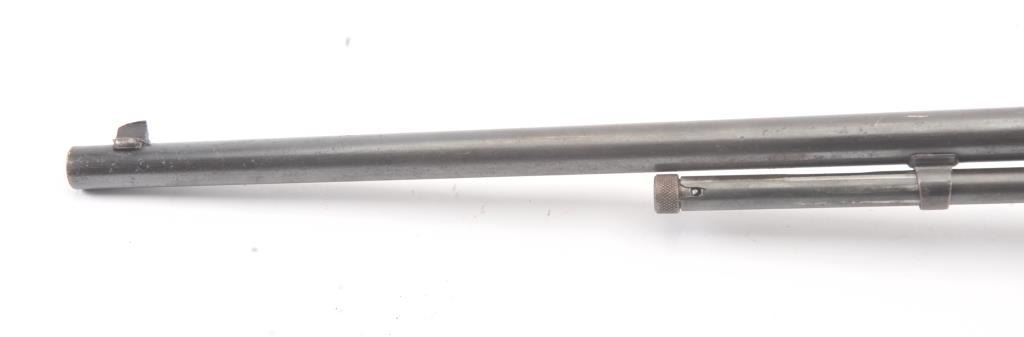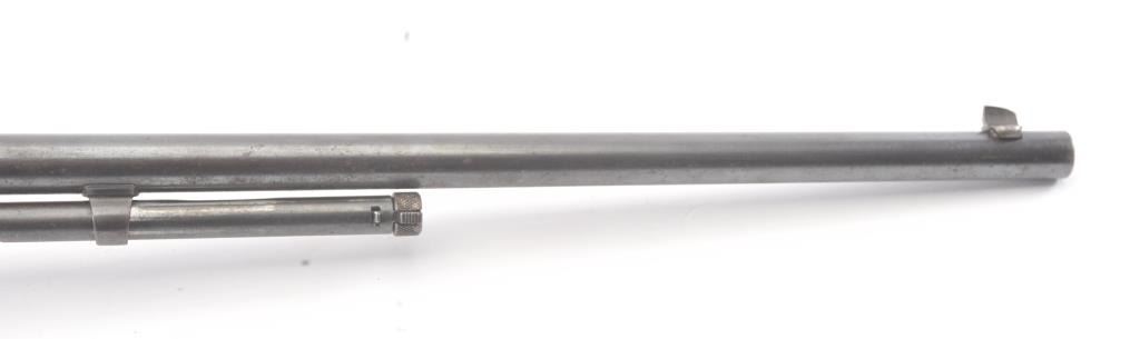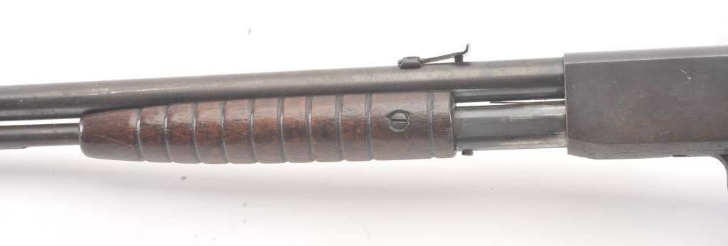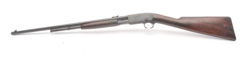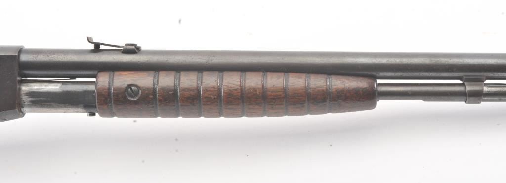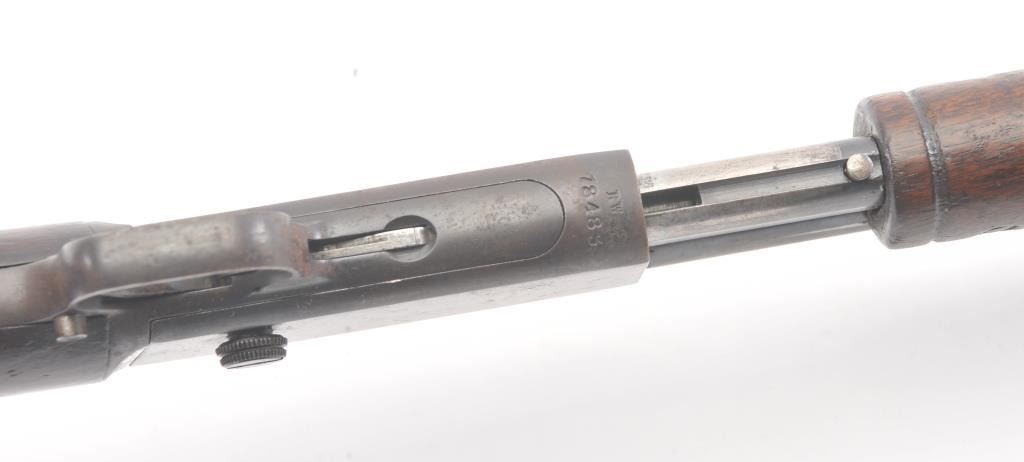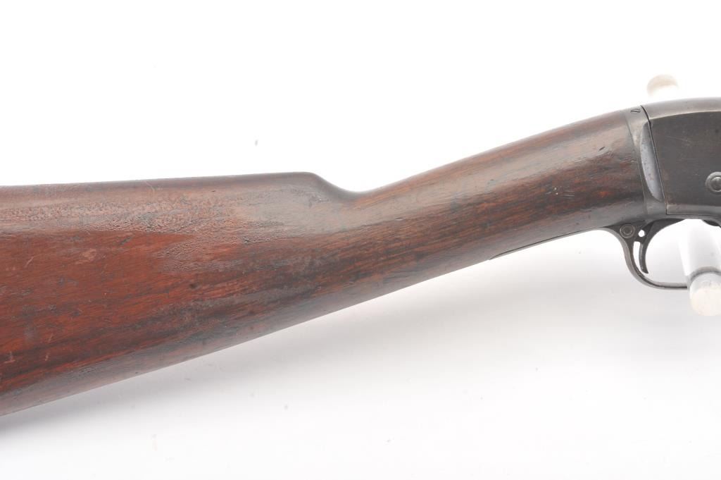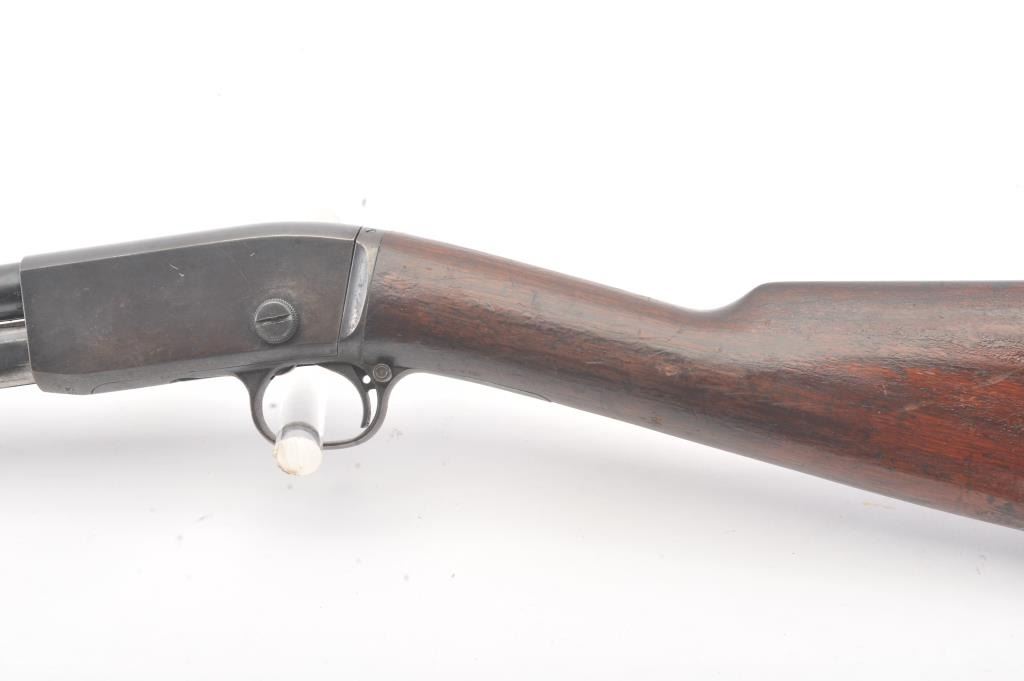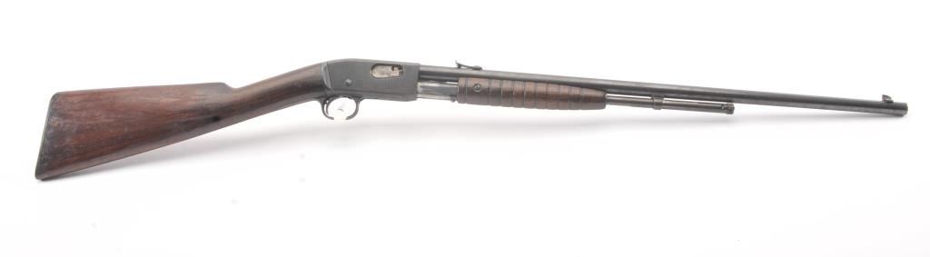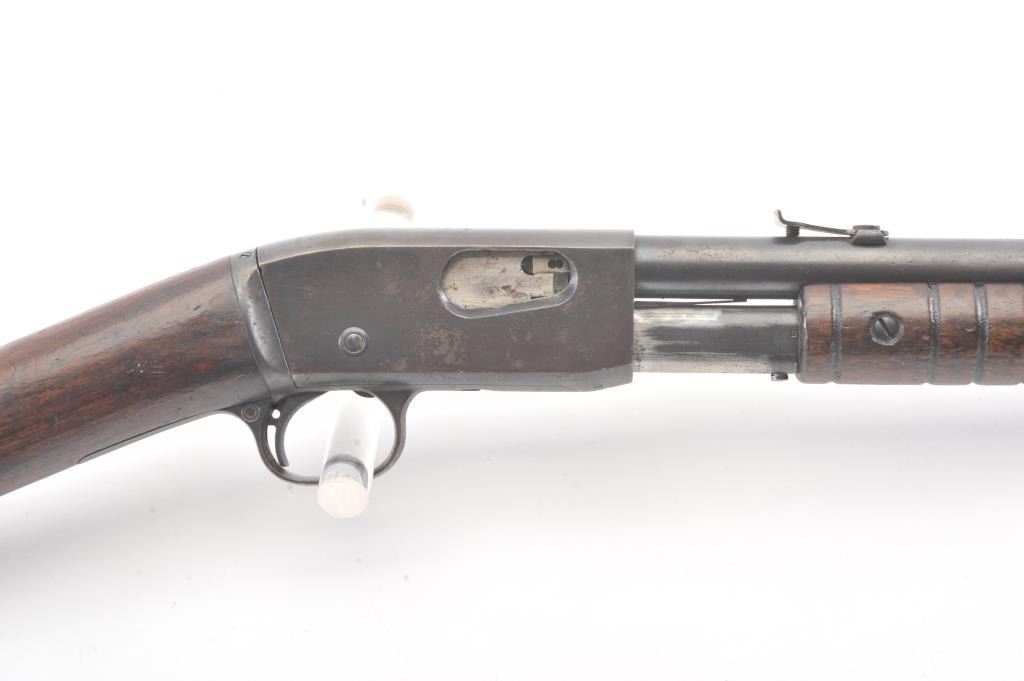 Remington Model 12 takedown pump rifle, .22 Short, Long or Long Rifle caliber, Serial #78483. The rifle is in good overall condition with a 22” round barrel. The barrel and half magazine have gone to a darkmix of original blue and patina. The smooth wood stock has had an extra coat of varnish added. The bore is fair, the action is crisp and the markings are legible. Est.: $150-$300. (C+R).