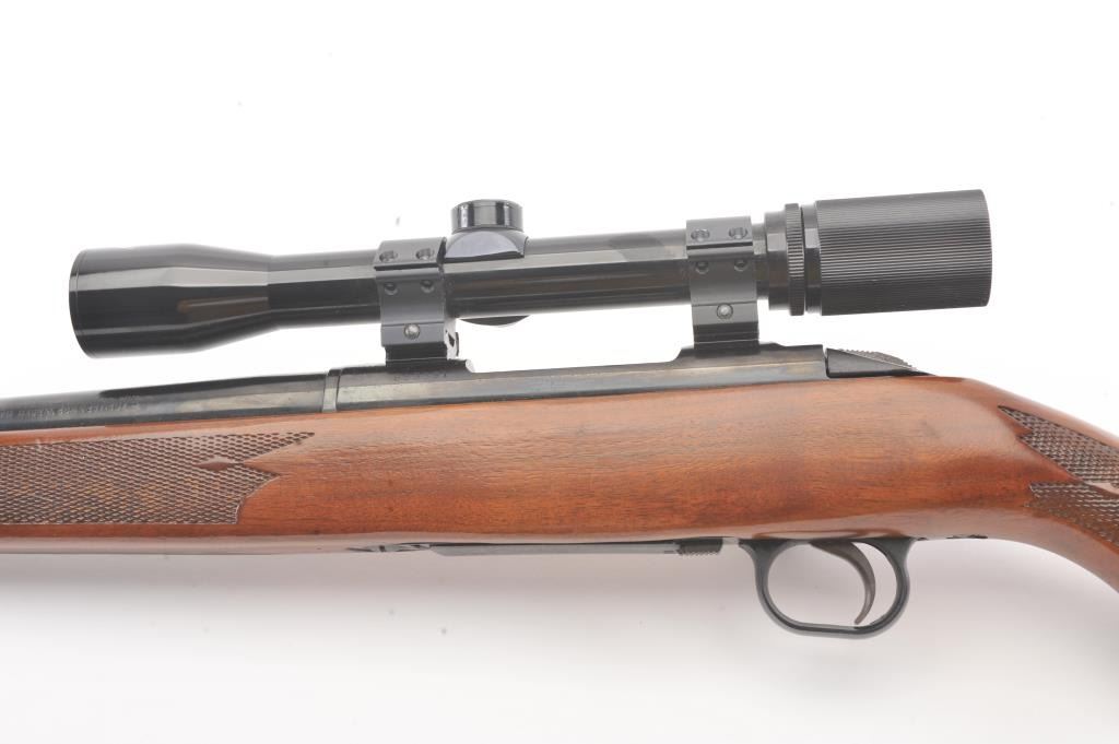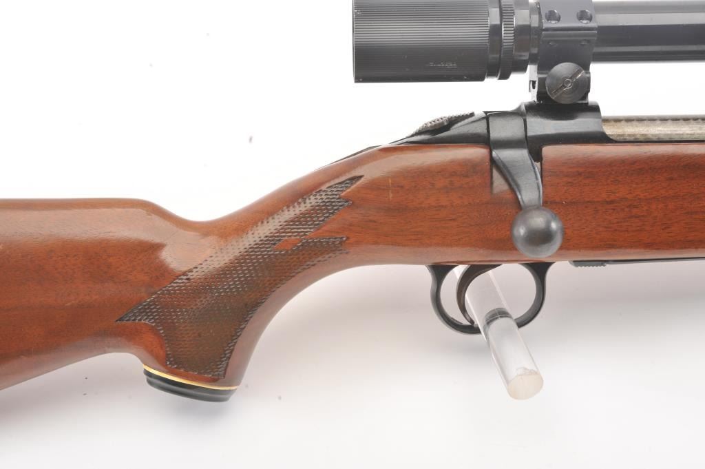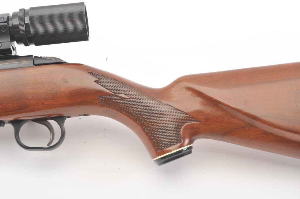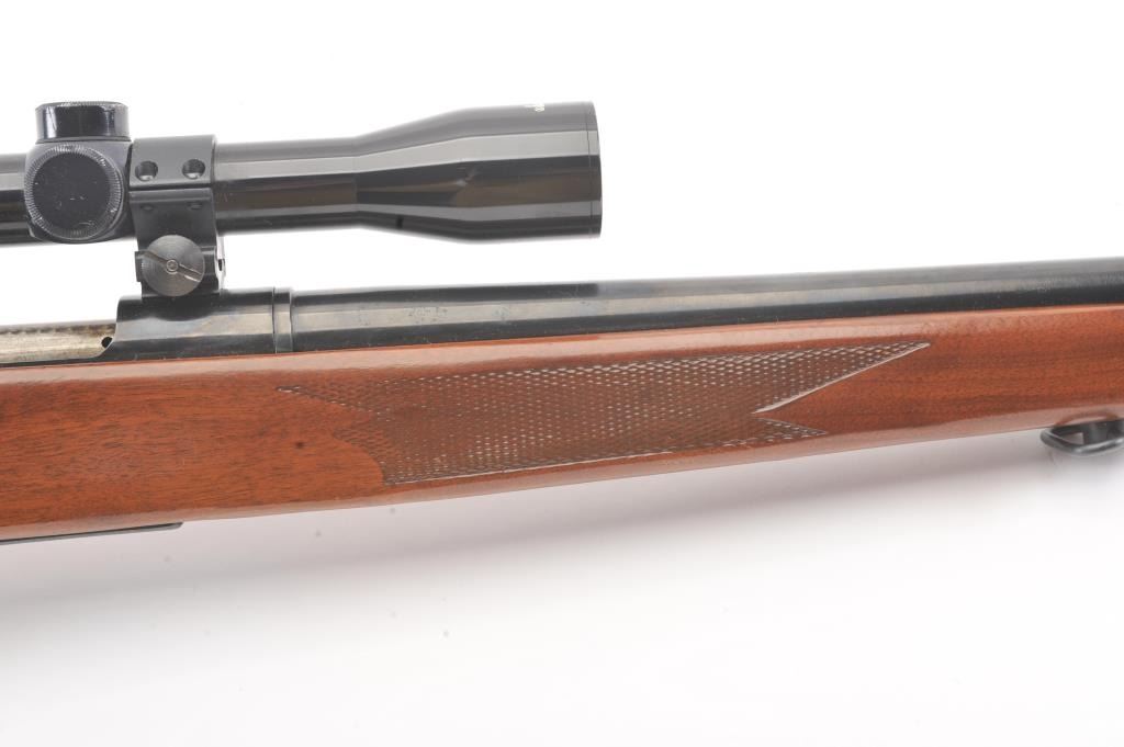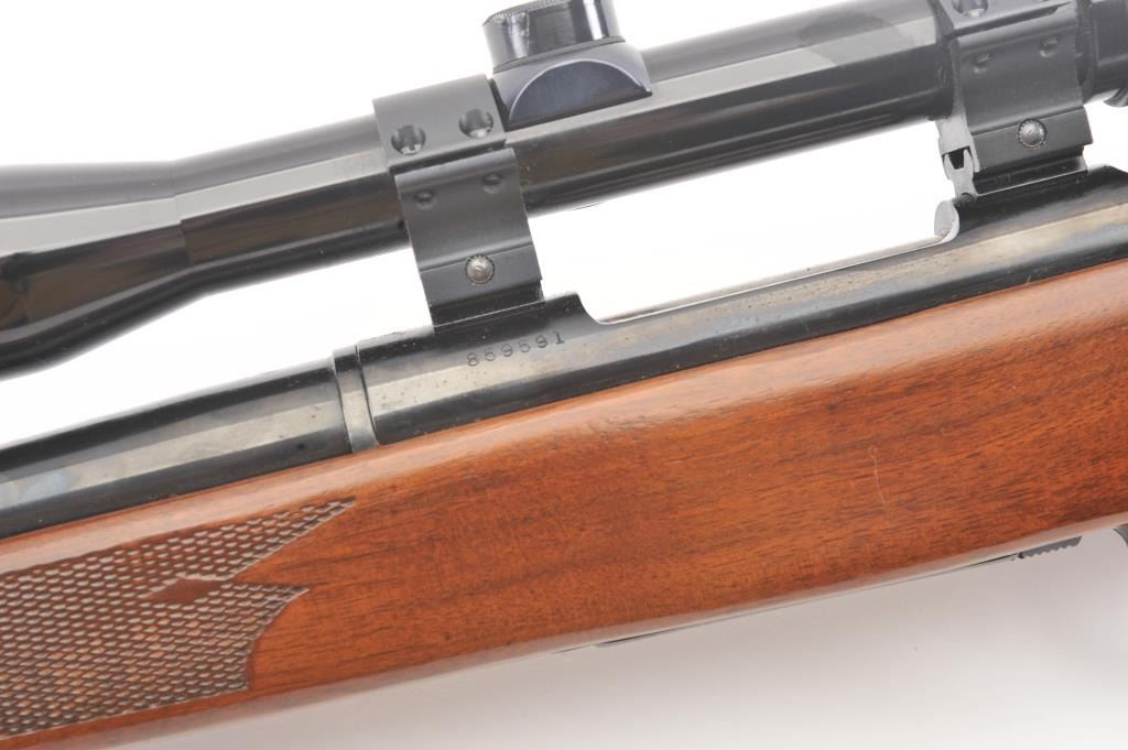 Mossberg 800ASM bolt action rifle, .308 caliber, Serial #859591. The rifle is in nearly excellent overall condition with a 23” barrel. The rifle retains nearly all of the blue finish with wear and light surfaceerosion on the magazine floor plate. The checkered wood stock is in very good condition with sling swivels added. The bore is good, the action is crisp and the markings are sharp. The rifle is topped with a Mossberg brand fixed power scope. Est.: $250-$500. (Modern).