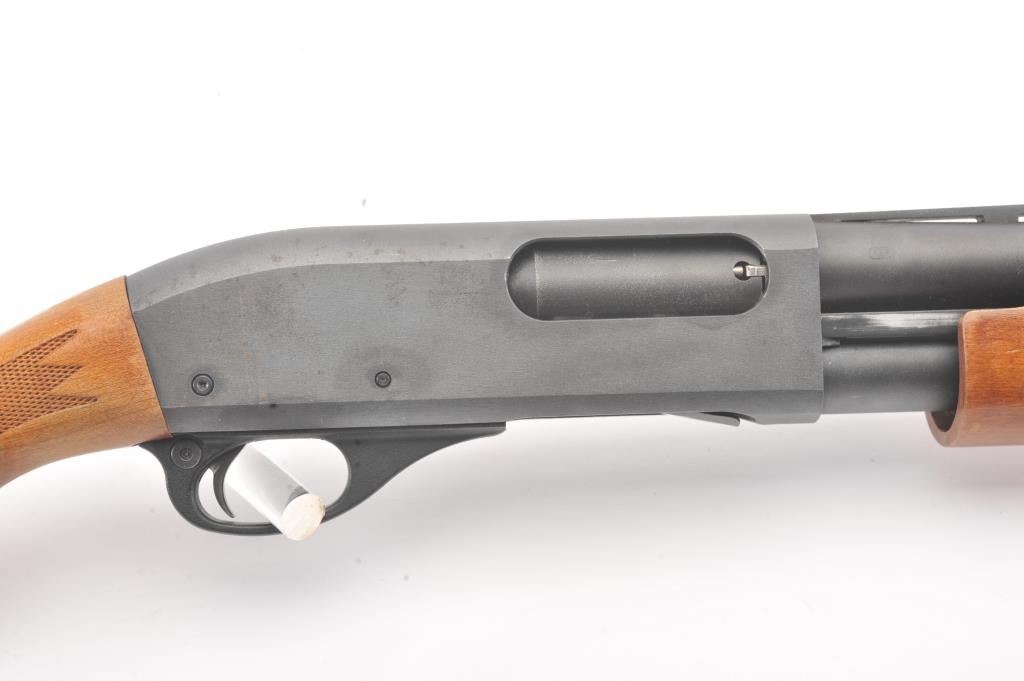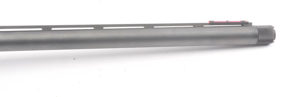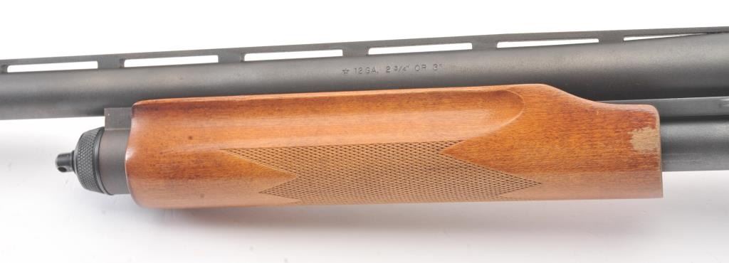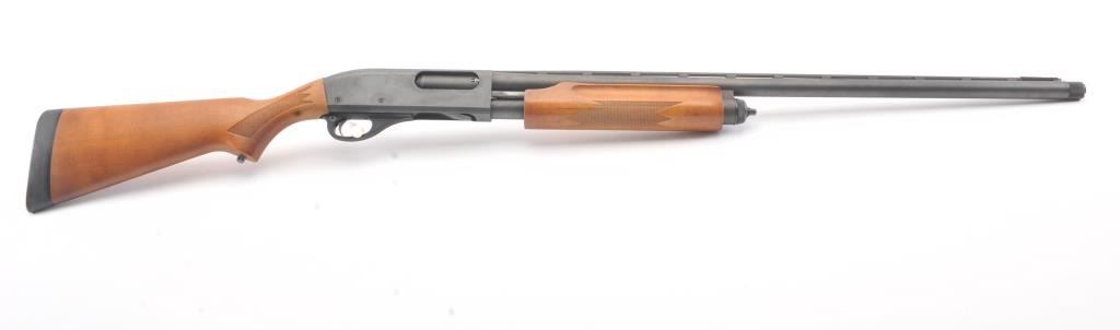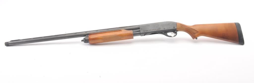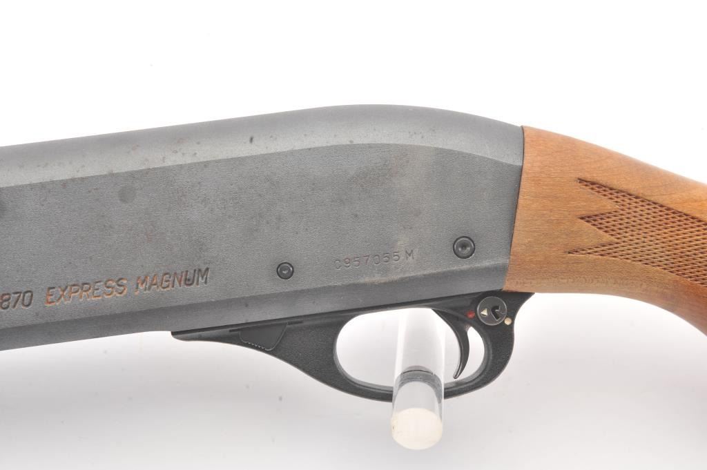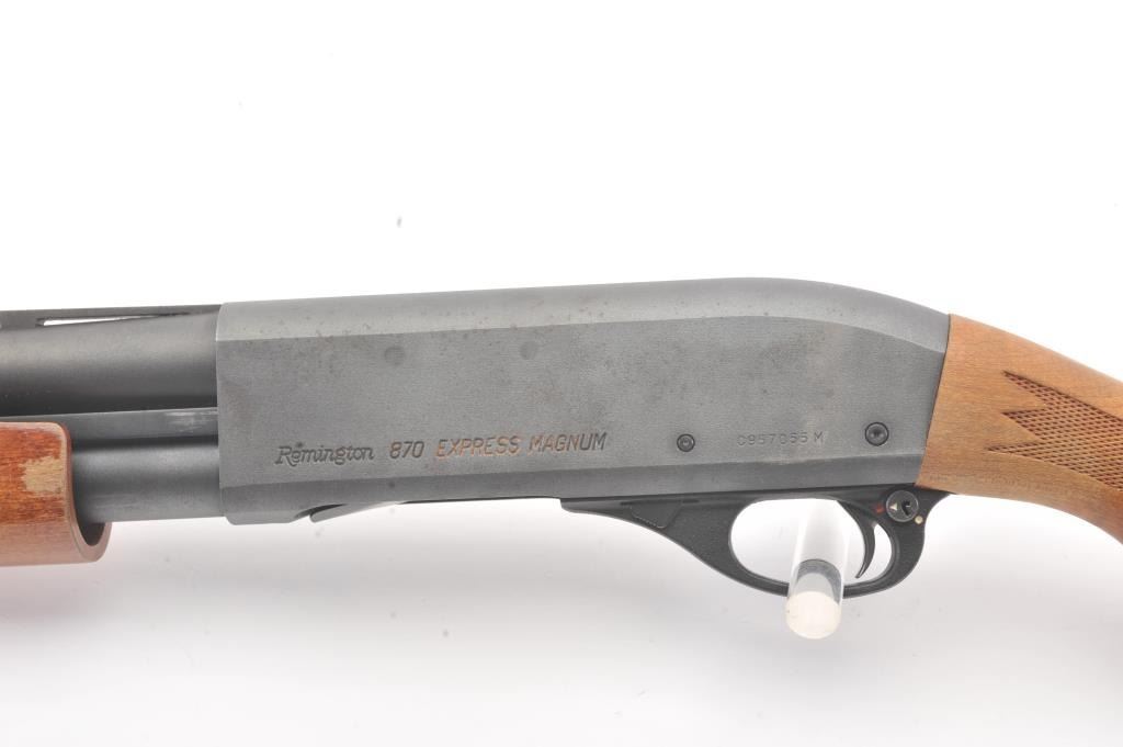 Remington Model 870 Express Magnum pump shotgun, 12 gauge, Serial #C957055M. The shotgun is in fine overall condition with a 28” barrel with a full-length ventilated rib and screw in modified choke tube. Theshotgun retains nearly all of the matte blue finish with a couple spots of light surface rust on the barrel and a Hi-Viz front sight. The magnum receiver is marked for 2 ¾” and 3” shells. The checkered wood stocks are invery good conditions with small mars and scrapes consistent with field use. The butt stock ends with a solid rubber recoil pad providing a 14” LOP. The bore is good, the action is crisp and the markings are sharp.Est.: $175-$350. (Modern).