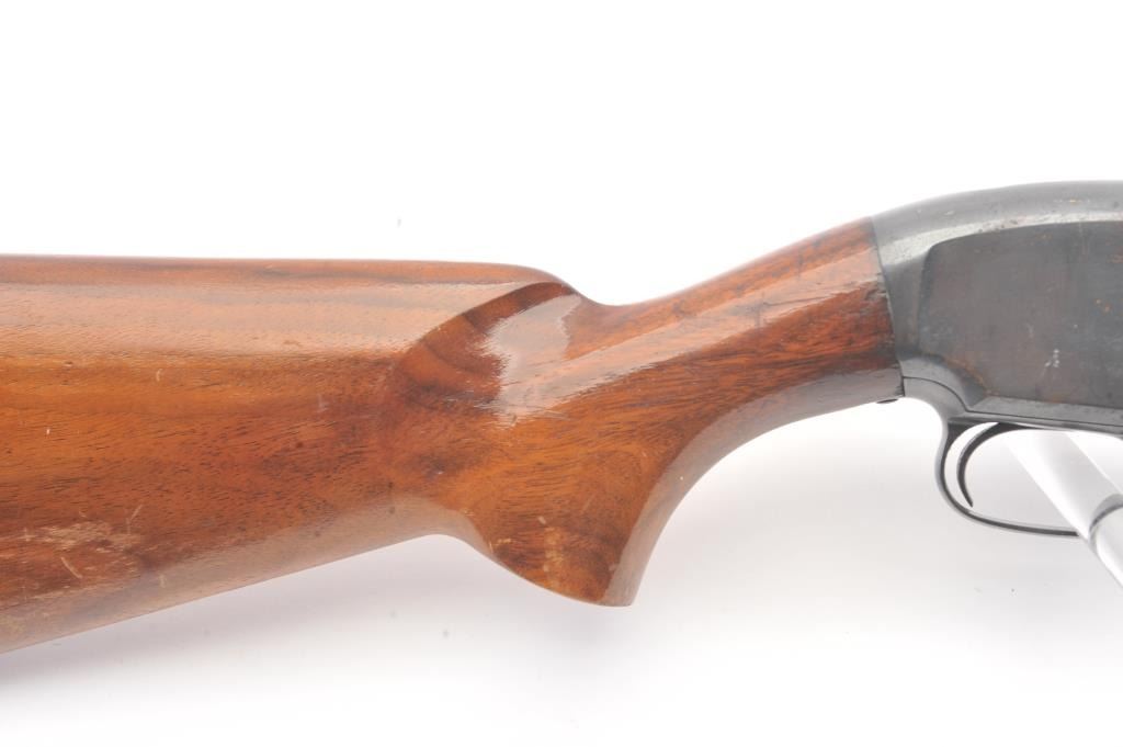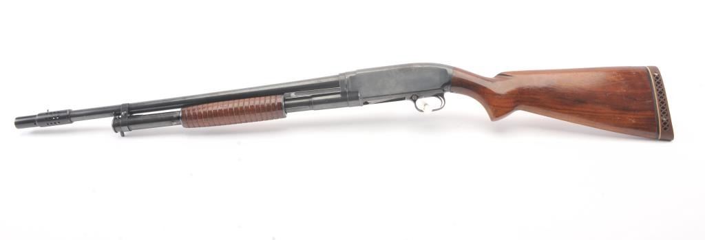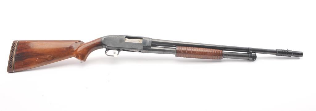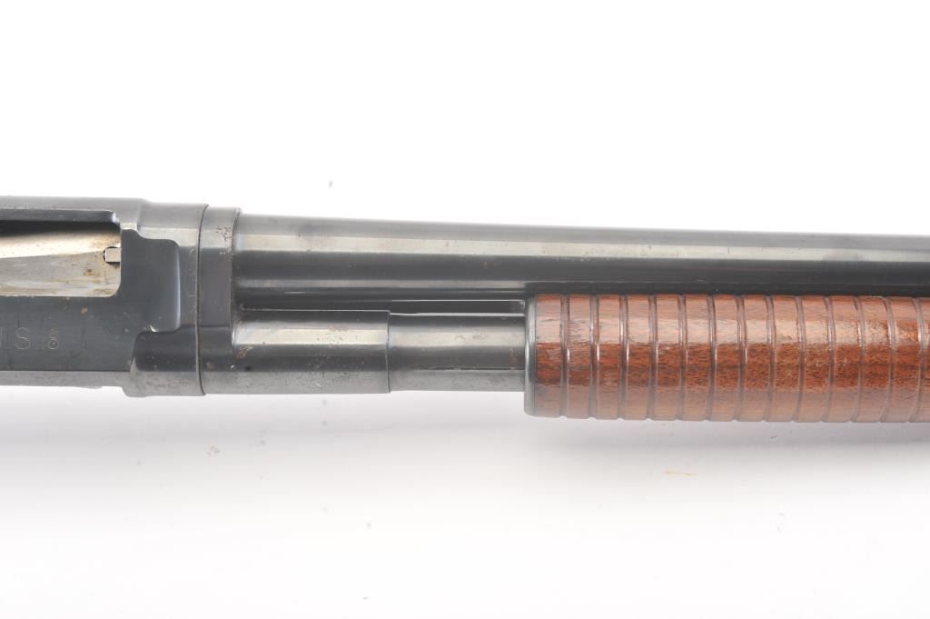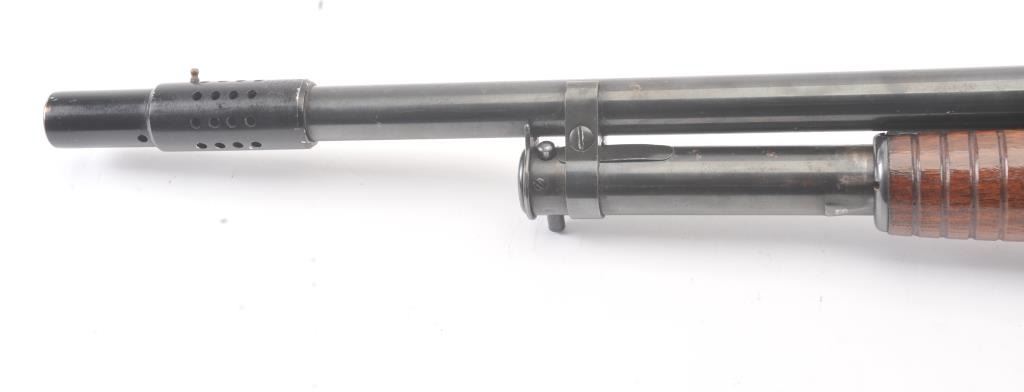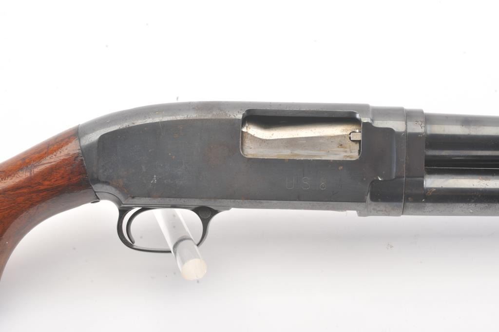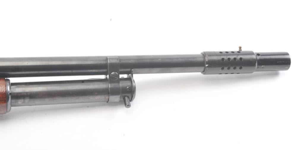 U.S. marked Winchester Model 12 pump shotgun, 12 gauge, Serial #989281. The shotgun is in very good overall condition with a 20” barrel with a 4” “Weaver Choke” added. The shotgun retains the majority of the mutedblue finish with light surface rust on the receiver and barrel. The shotgun is “U.S.” marked with flaming bomb emblem and cylinder choked. Initially used as a military training shotgun, the choke was added laterfor sporting purposes. The smooth wood stocks are in good condition with a ventilated rubber pad providing a 14 ¾” LOP. The bore is good, the action is crisp and the markings are sharp. Est.: $175-$350.(C+R).