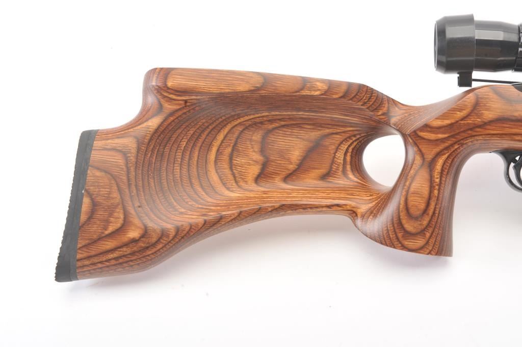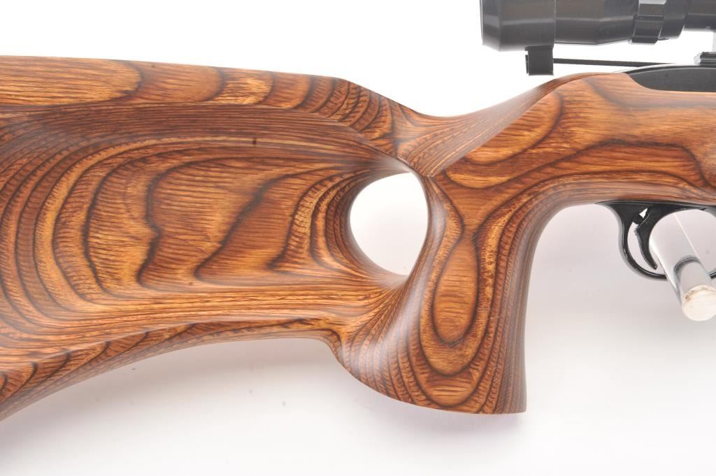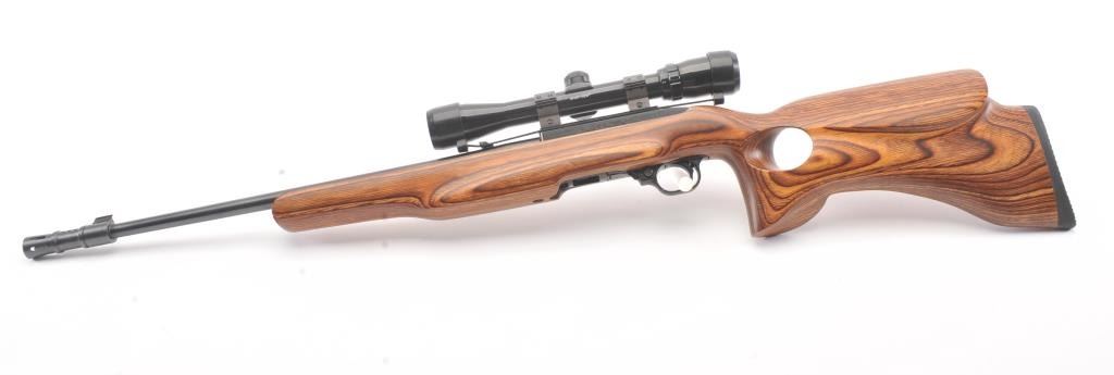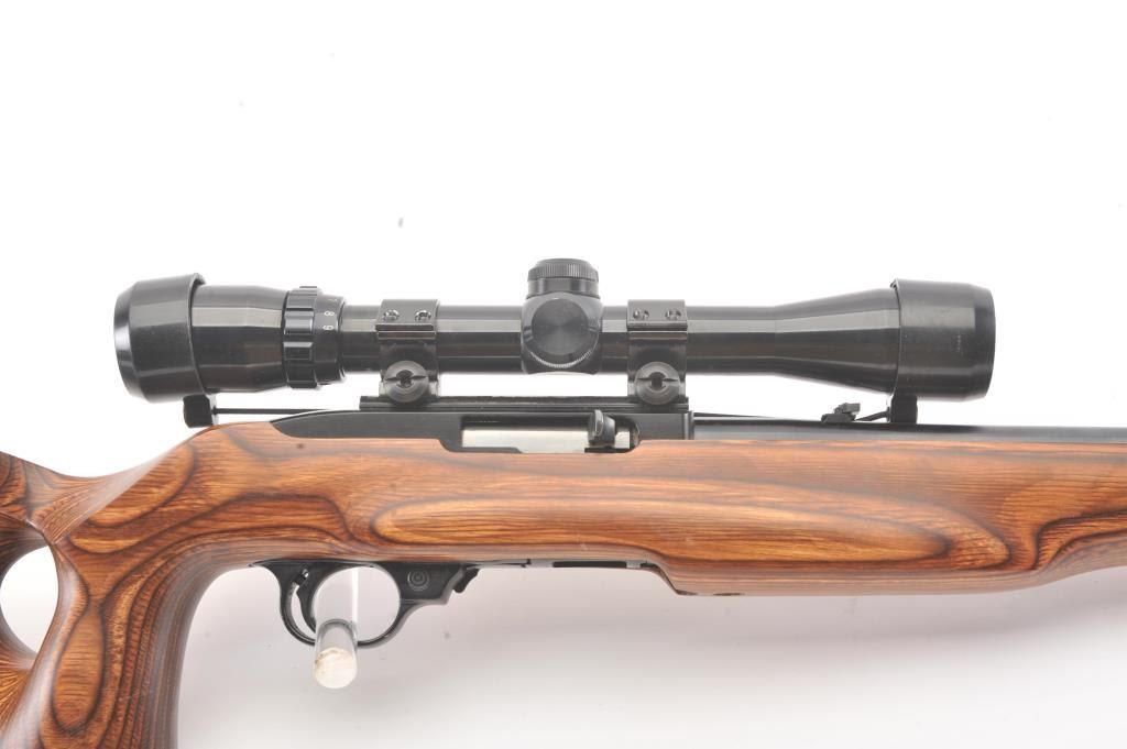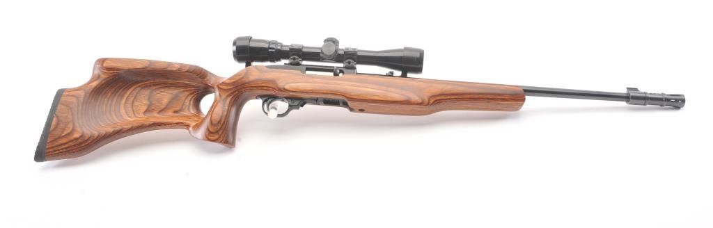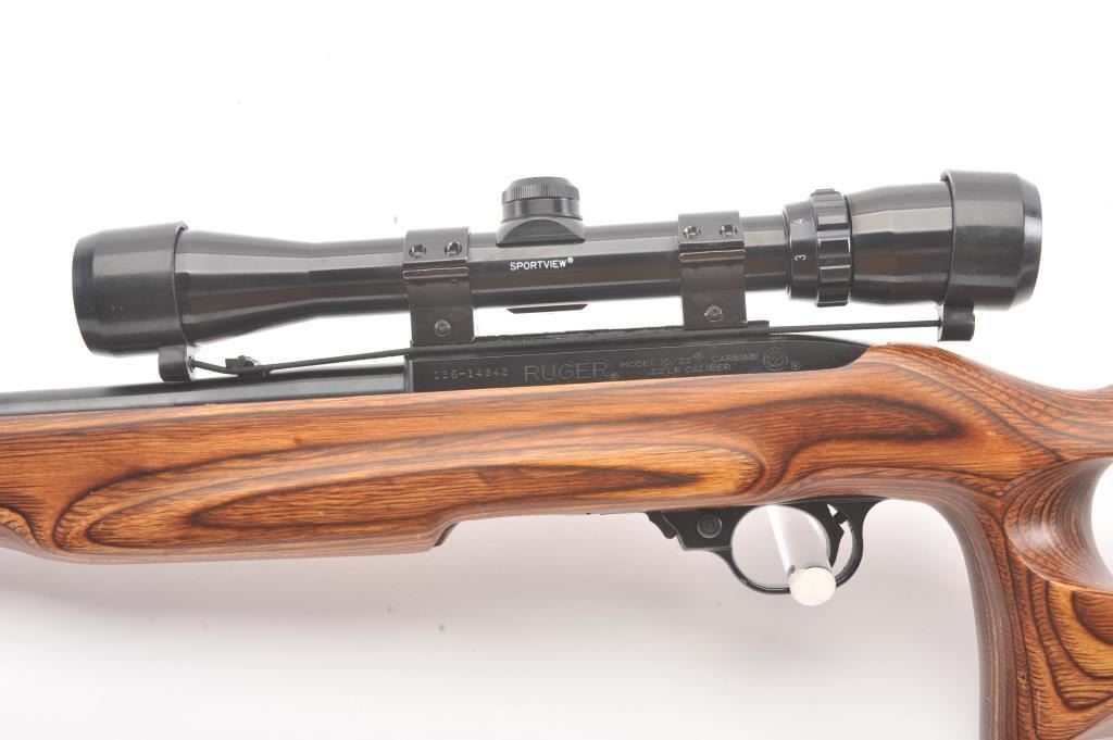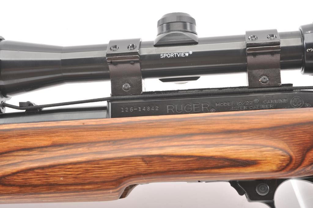 Custom Ruger Model 10-22 semi-automatic carbine, .22 Long Rifle caliber, Serial #126-14842. The carbine is in nearly excellent condition with a 21” barrel including the aftermarket muzzle break. Thecarbine retains nearly all of the matte finish with small mars and scratches consistent with carry and use. The custom wood laminate thumbhole stock is in excellent condition showing little use. The rifle istopped with a Bushnell Sport View 3 x 9 variable power scope. The bore is good, the action is crisp and the markings are sharp on this lightly used 10-22. The lot includes one correct Ruger marked magazine. Est.:$250-$500. (Modern).