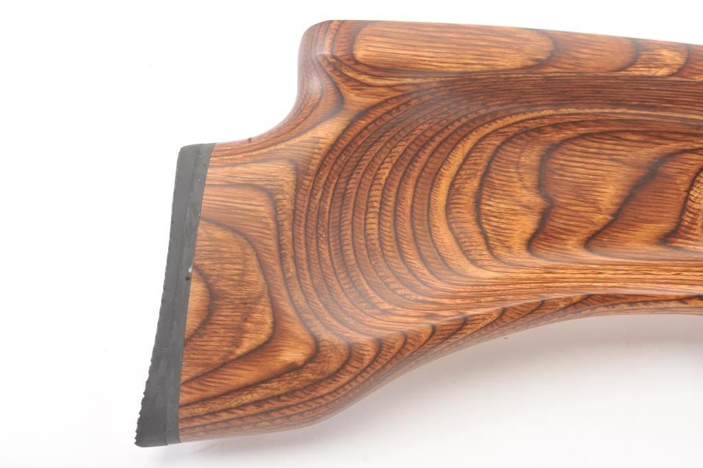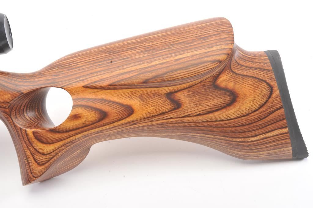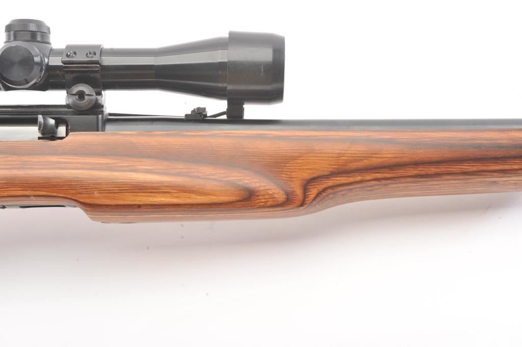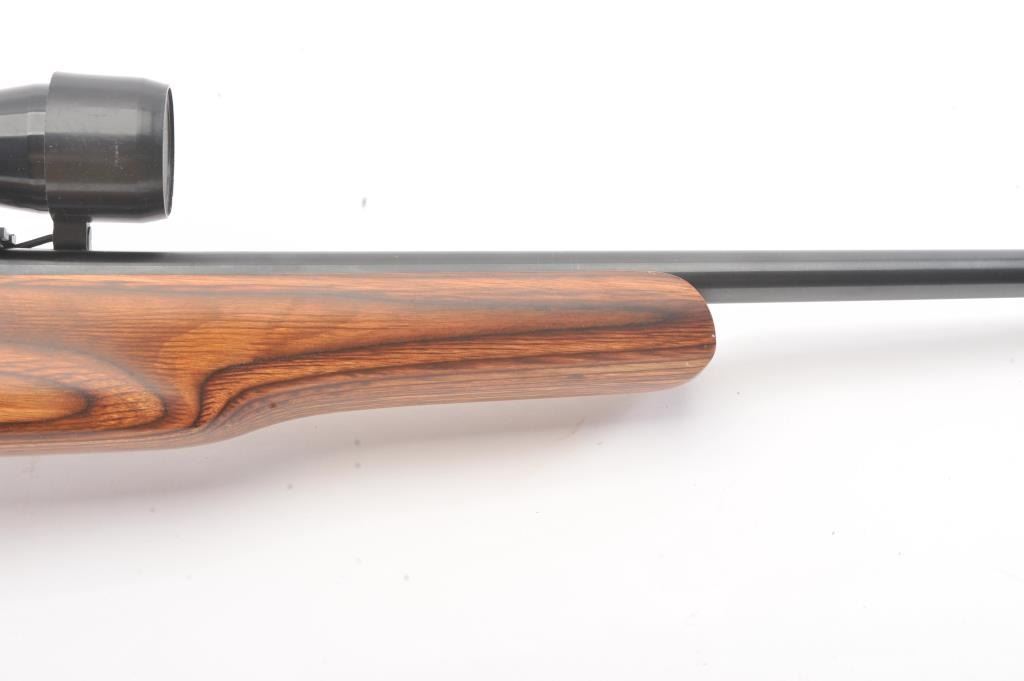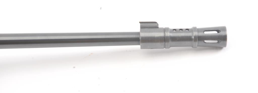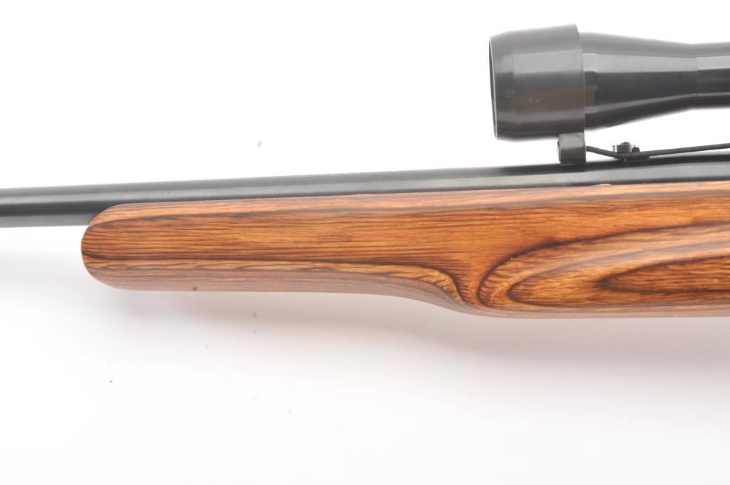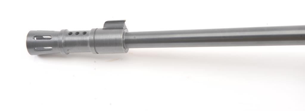Custom Ruger Model 10-22 semi-automatic carbine, .22 Long Rifle caliber, Serial #126-14842. The carbine is in nearly excellent condition with a 21” barrel including the aftermarket muzzle break. Thecarbine retains nearly all of the matte finish with small mars and scratches consistent with carry and use. The custom wood laminate thumbhole stock is in excellent condition showing little use. The rifle istopped with a Bushnell Sport View 3 x 9 variable power scope. The bore is good, the action is crisp and the markings are sharp on this lightly used 10-22. The lot includes one correct Ruger marked magazine. Est.:$250-$500. (Modern).