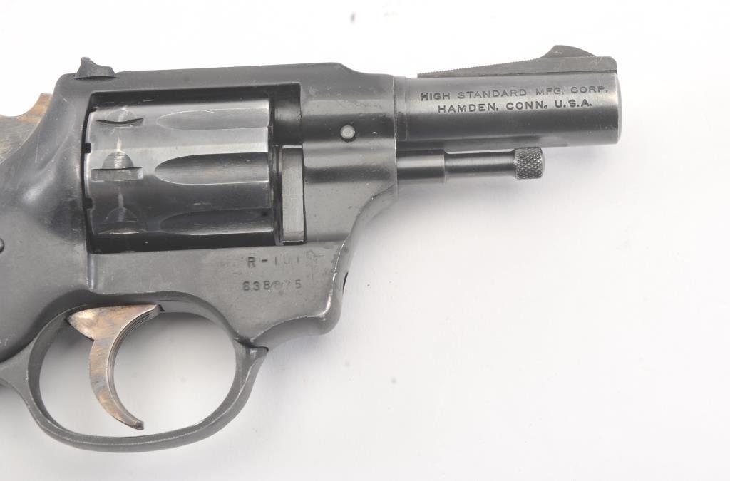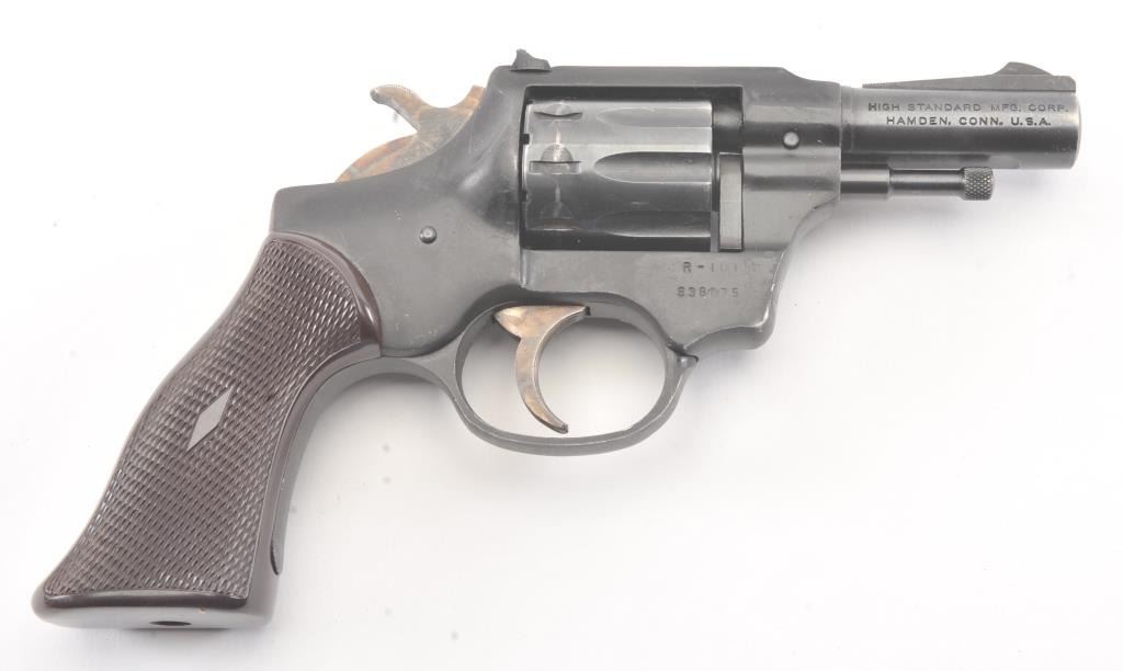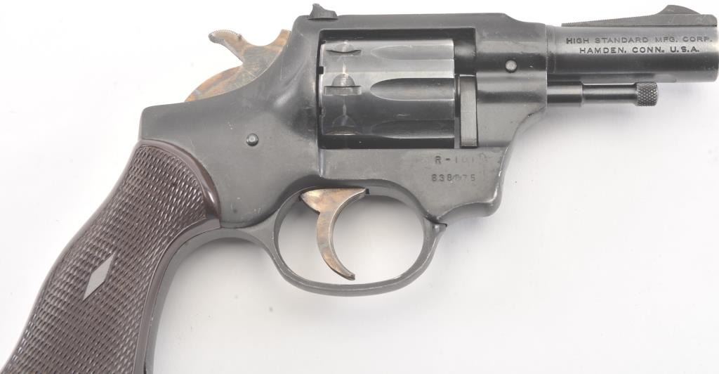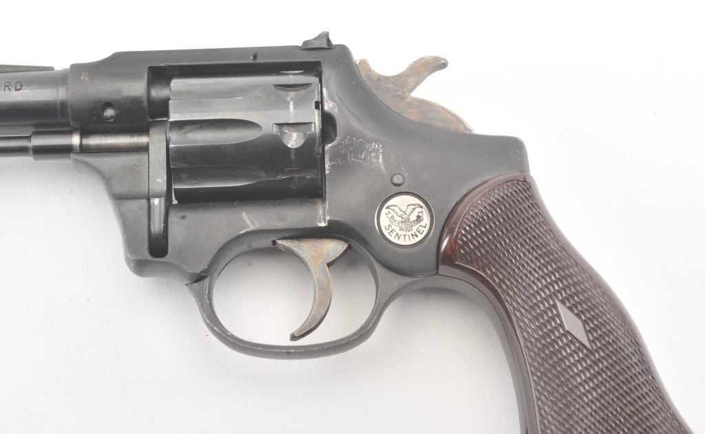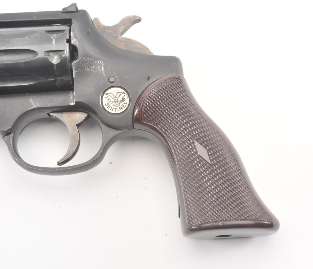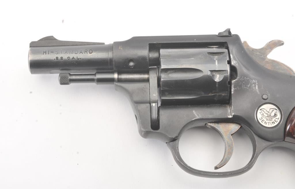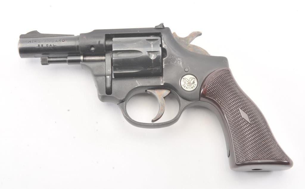 Hi-Standard Sentinel DA revolver, .22 caliber, Serial #G38875. The pistol is in very good overall condition retaining the majority of the matte blue finish with case hardening on the hammer and trigger. Thepistol has a 3” barrel. The checkered plastic grips are in very good condition, the action is crisp, bore is good and markings are sharp. Est.: $150-$300. (C+R/PPT).
