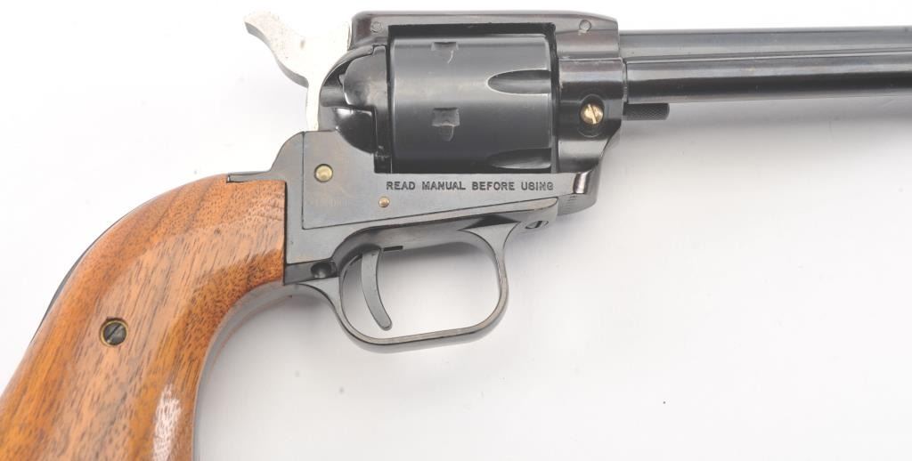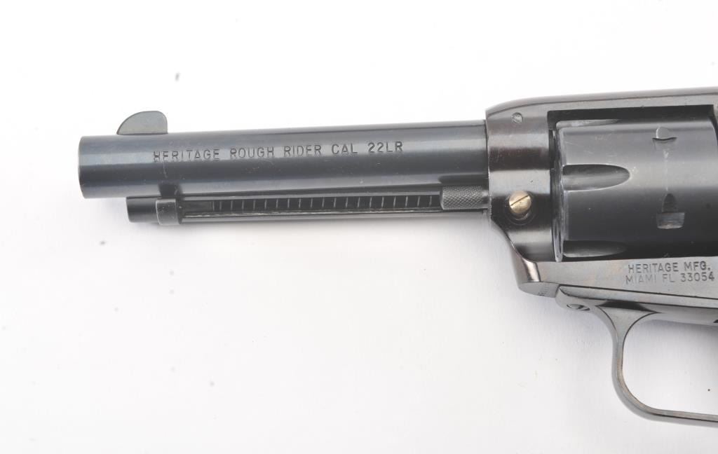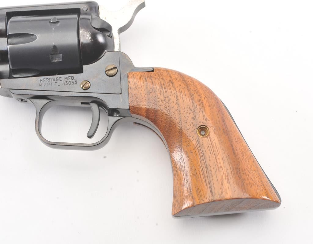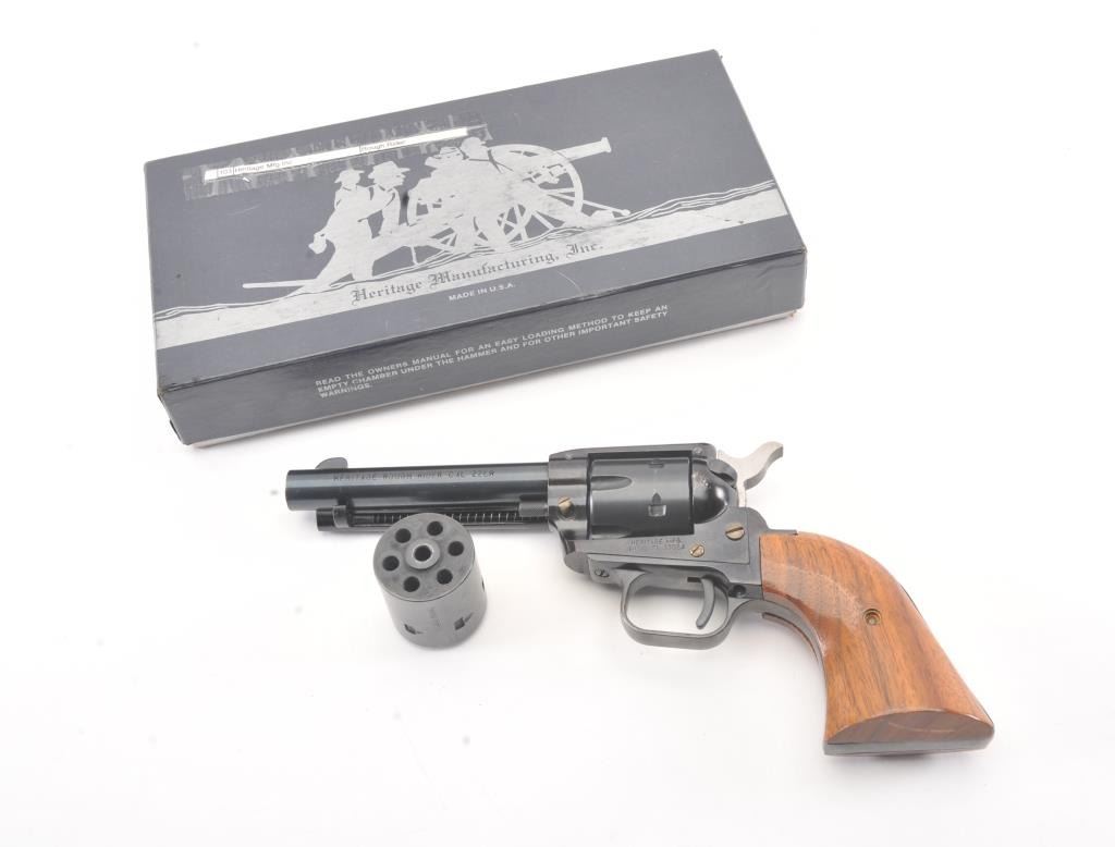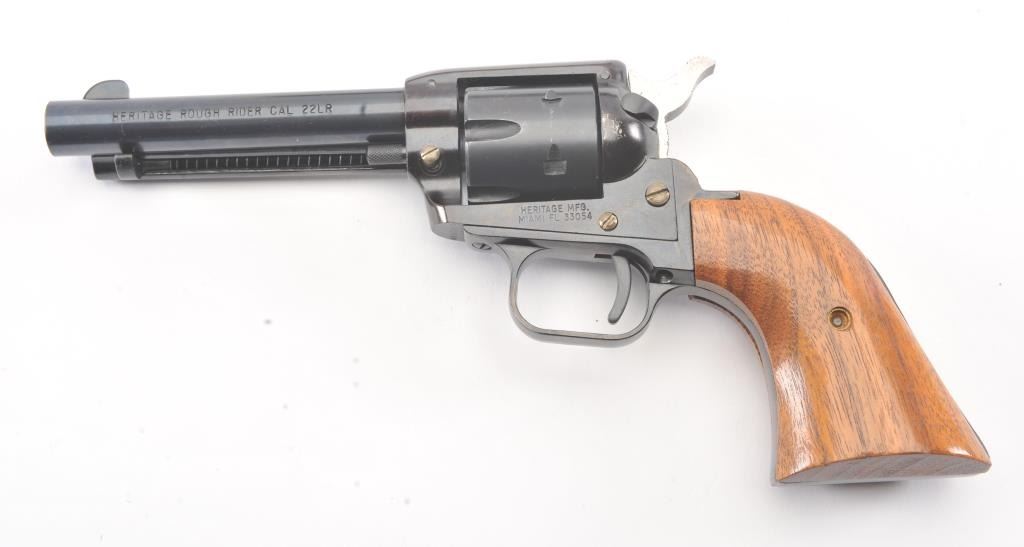 Heritage Manufacturing Rough Rider SA revolver, .22 LR caliber, Serial #HR00995. The pistol is in excellent overall condition retaining approximately 93%-95% of the blue finish with a 4” barrel. The smooth woodgrips are in excellent condition showing little use. The bore is good, the action is crisp and the markings are sharp. The pistol comes with the factory cardboard box and an extra cylinder in .22 Magnum. Est.:$175-$350. (Modern/PPT).