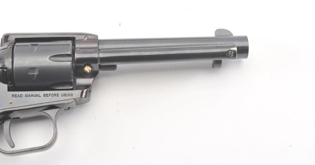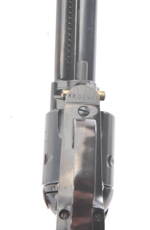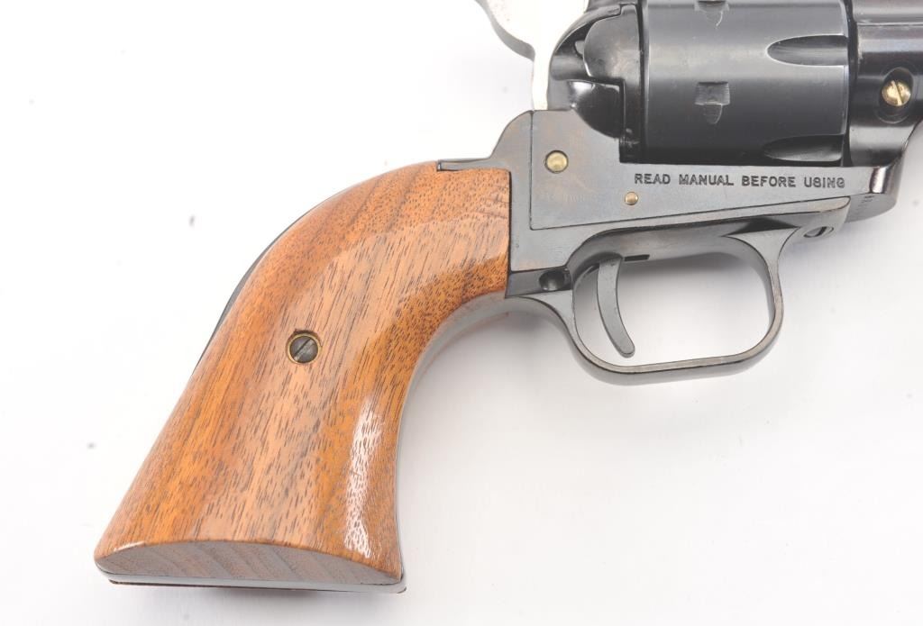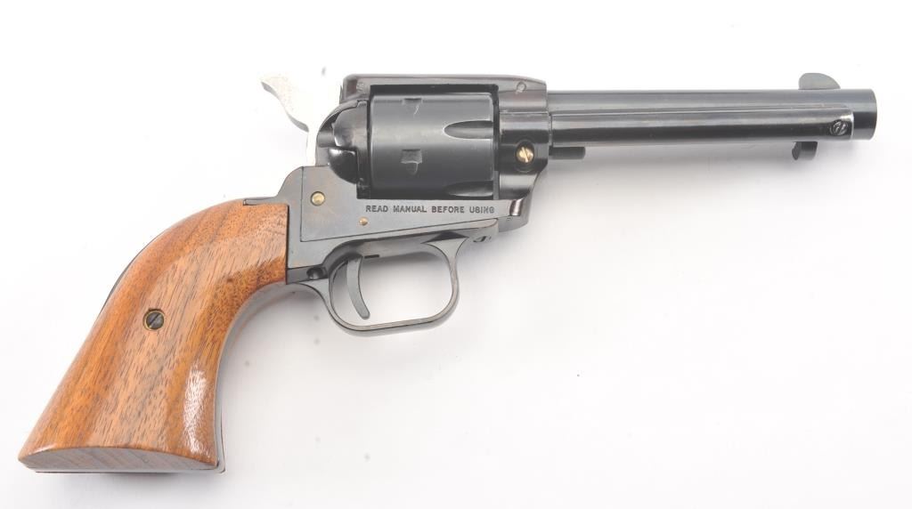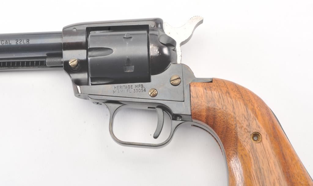 Heritage Manufacturing Rough Rider SA revolver, .22 LR caliber, Serial #HR00995. The pistol is in excellent overall condition retaining approximately 93%-95% of the blue finish with a 4” barrel. The smooth woodgrips are in excellent condition showing little use. The bore is good, the action is crisp and the markings are sharp. The pistol comes with the factory cardboard box and an extra cylinder in .22 Magnum. Est.:$175-$350. (Modern/PPT).
